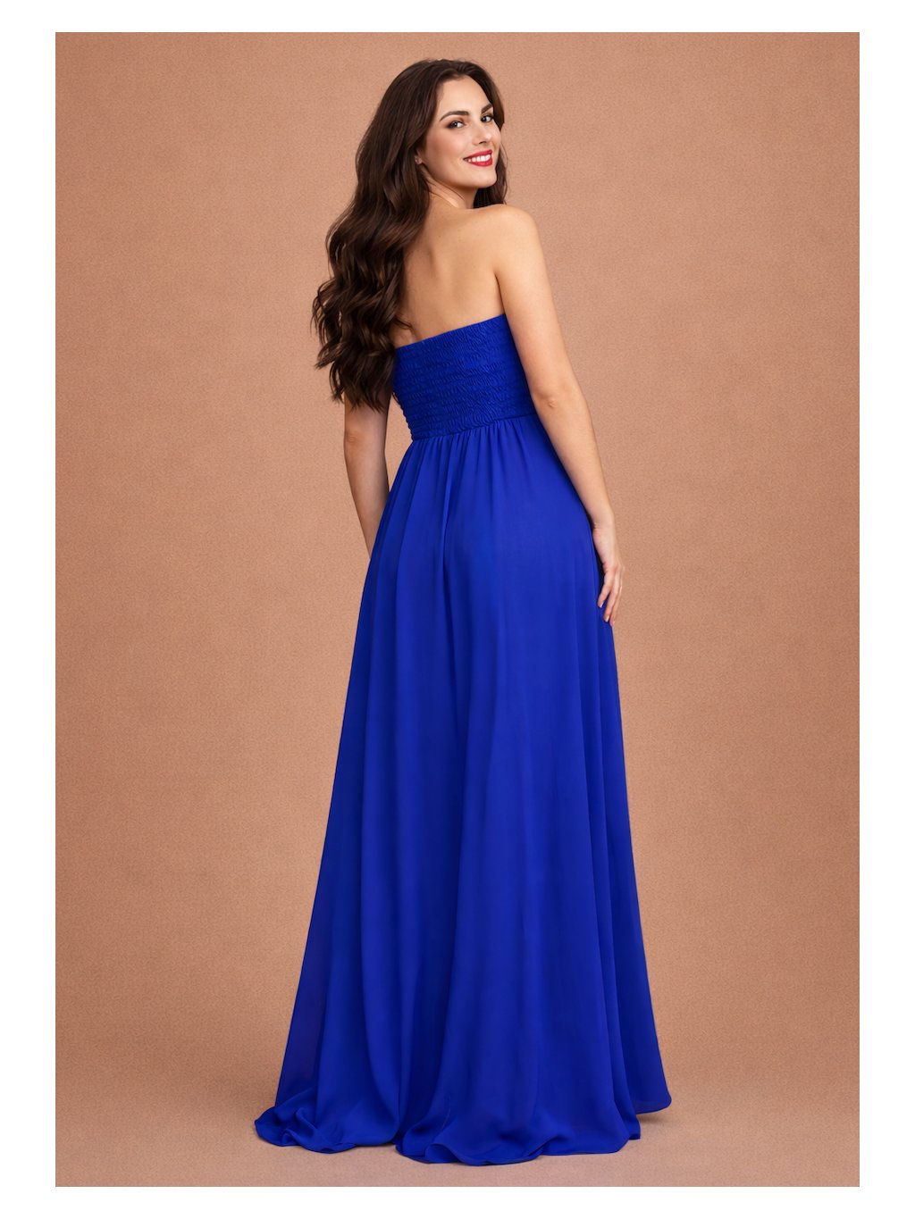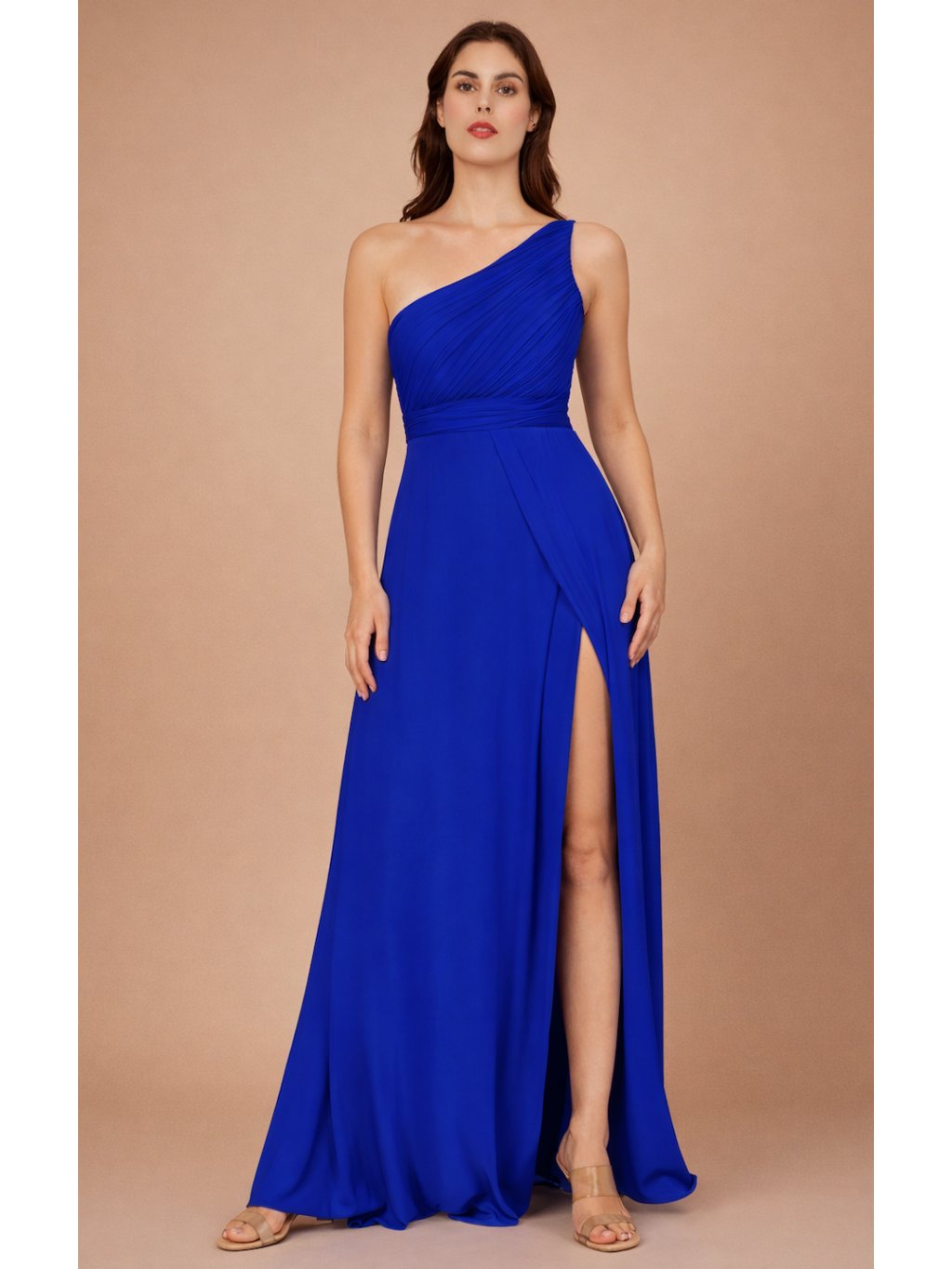 Tento model v sytě modré barvě Vás zaujme už při prvním pohledu svou jednoduchou, ale výraznou siluetou. Asymetrický střih na jedno rameno působí moderně a nechává vyniknout ramena i dekolt. Horní část s jemným plisováním přirozeně směřuje pozornost k pasu a vytváří vyvážený vzhled postavy. Dlouhá splývavá sukně s vysokým rozparkem přidává na lehkosti a dává prostoru vyniknout pohybu při chůzi. Šaty se skvěle hodí na maturitní plesy, imatrikulační plesy, galavečery, slavnostní večeře i společenské večírky, kde chcete působit sebejistě a elegantně.