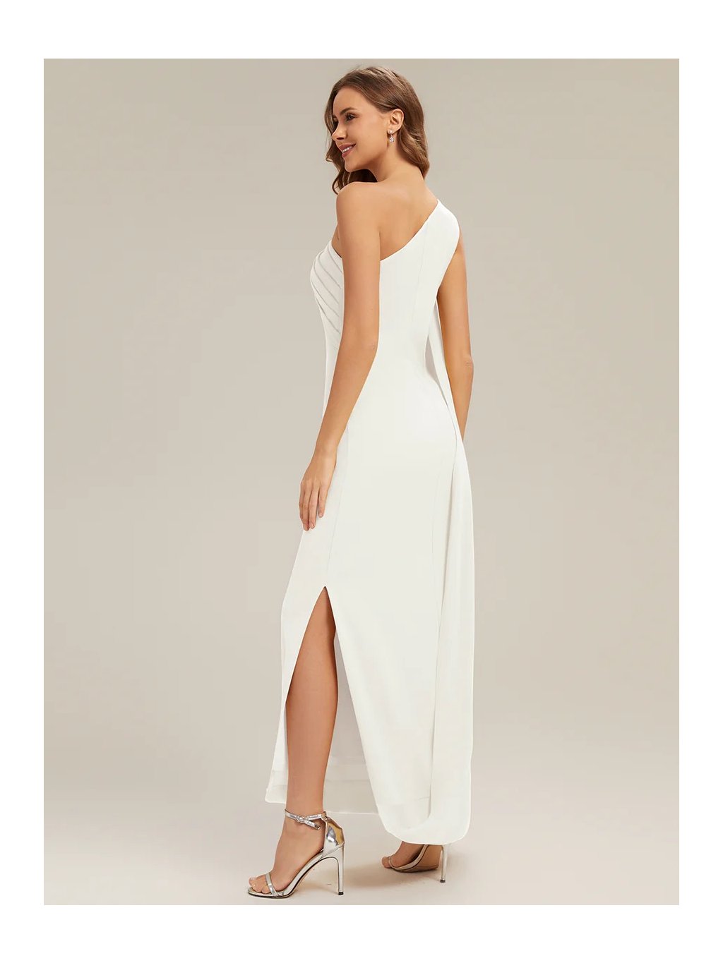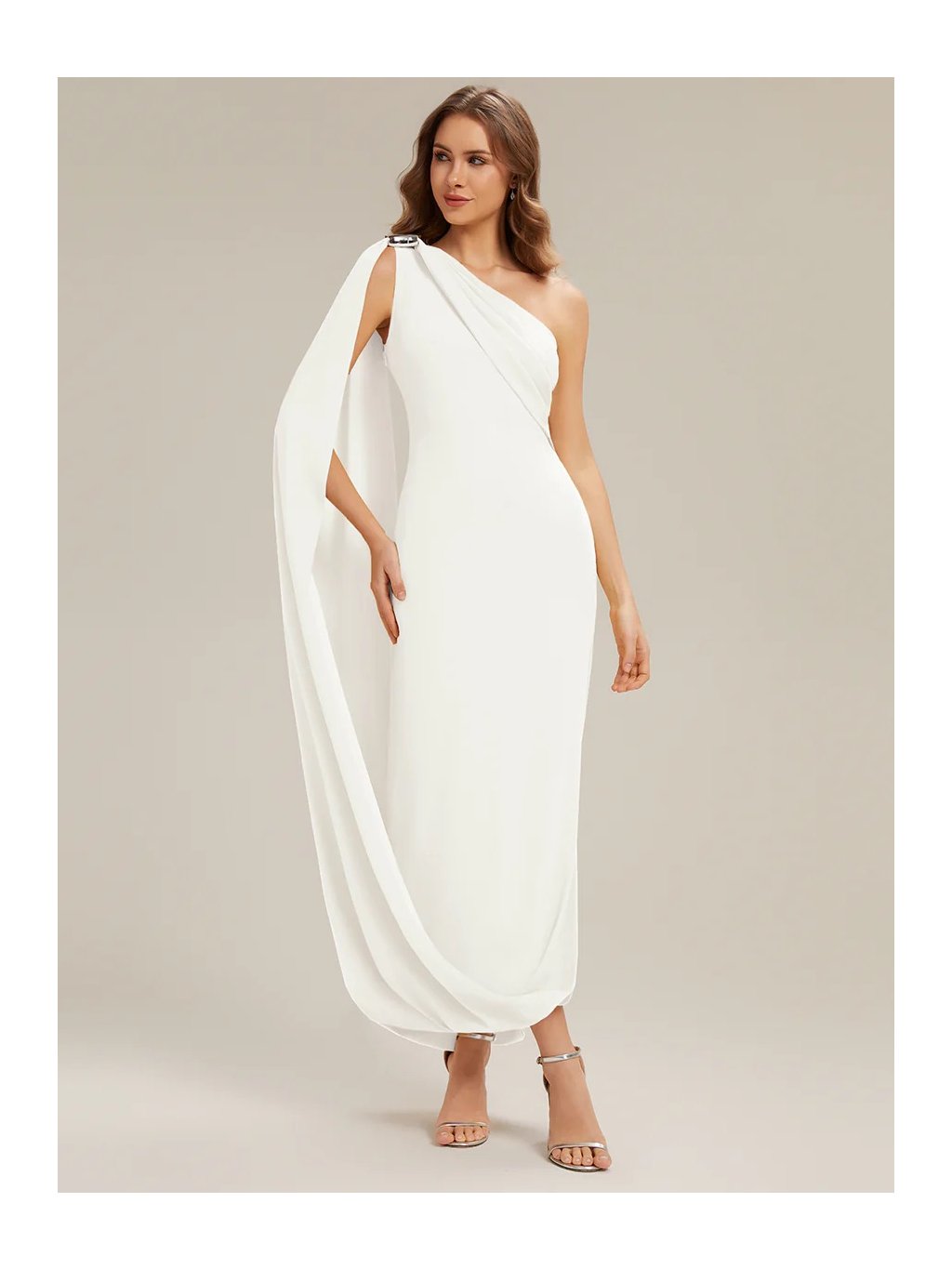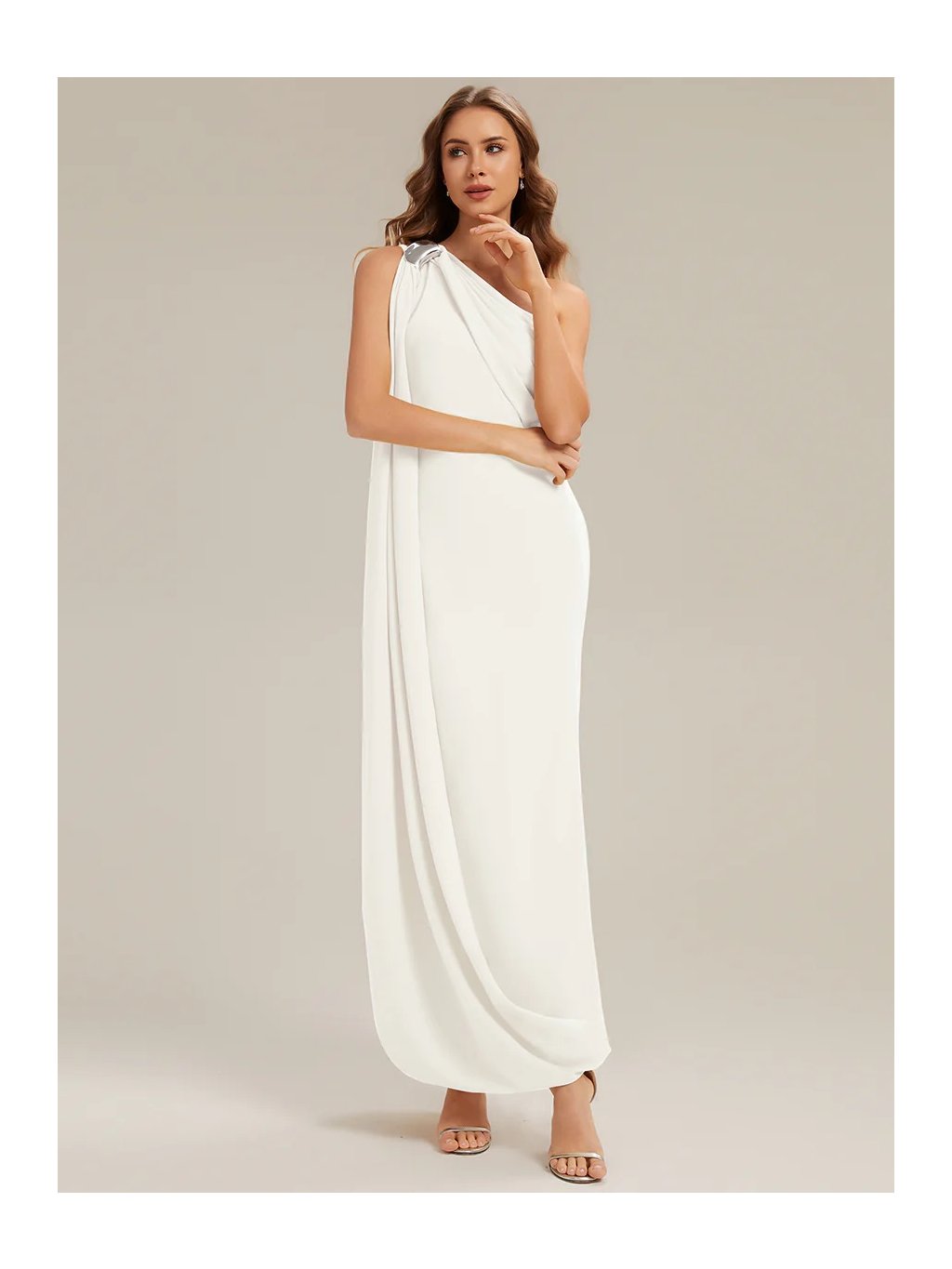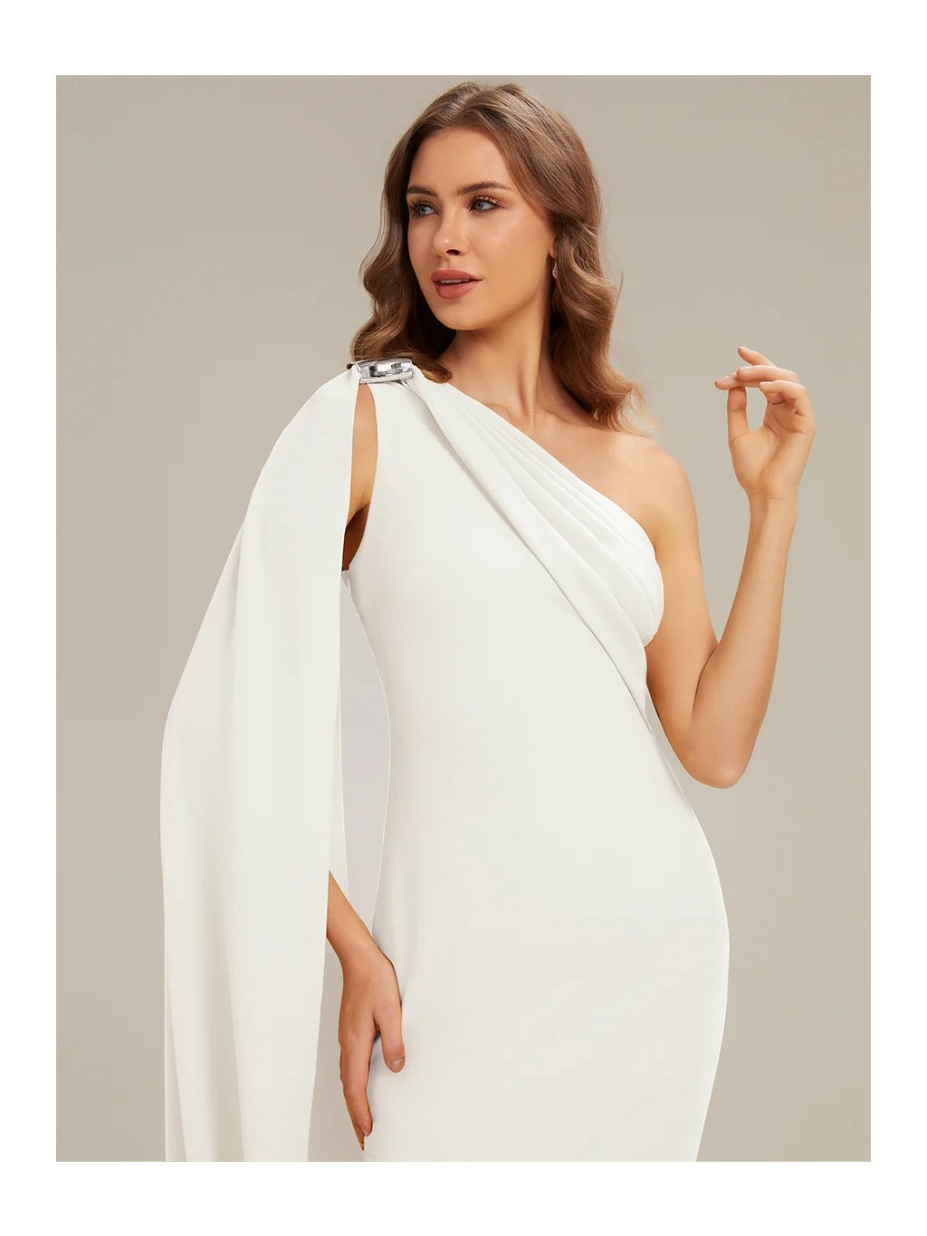 Představujeme vám model, který nepotřebuje metry krajek, aby zaujal a působil slavnostně. Základem těchto šatů je čistá linie a jeden výrazný prvek v podobě látky volně padající z ramene až k zemi. Na rameni je ozdobná spona, která hází odlesky a nahrazuje náhrdelník. Střih lichotivě obepíná postavu přesně tam, kde má, ale díky elasticitě materiálu se v něm dá pohodlně strávit celý večer. Rozparek na straně sukně není jen pro parádu – dává nohám svobodu a brání pocitu, že vás šaty při chůzi omezují.