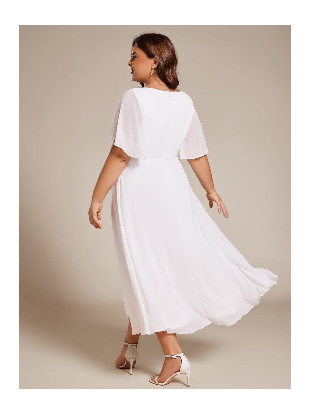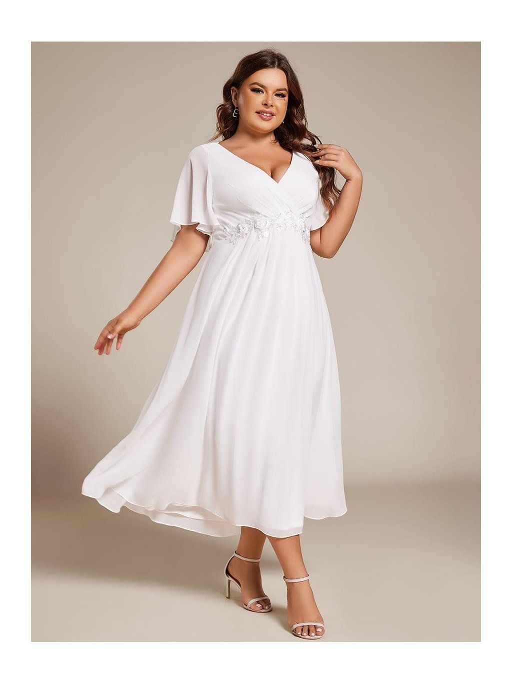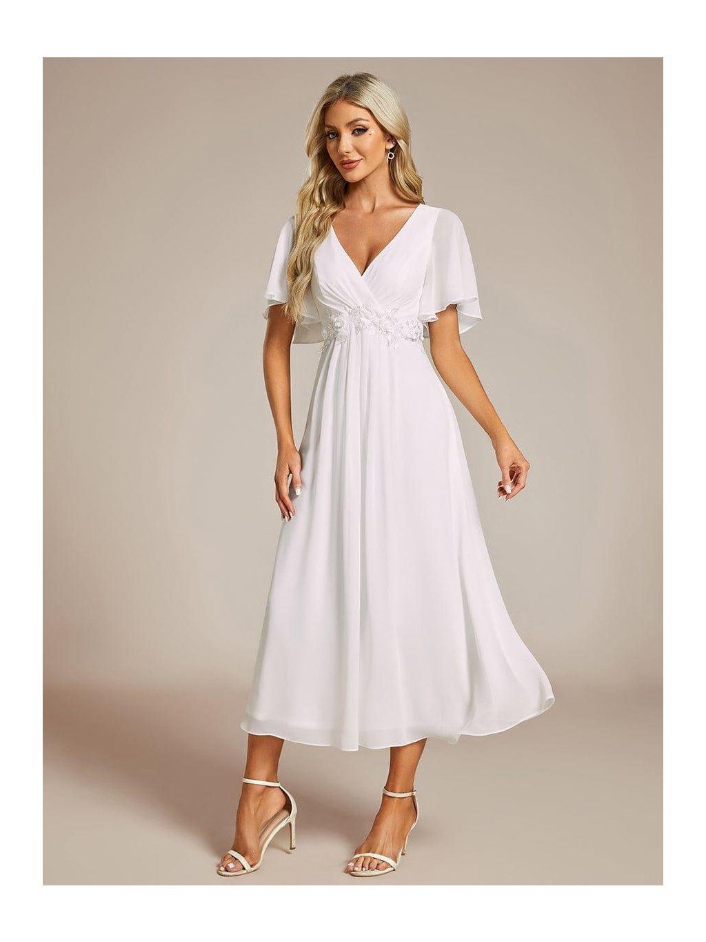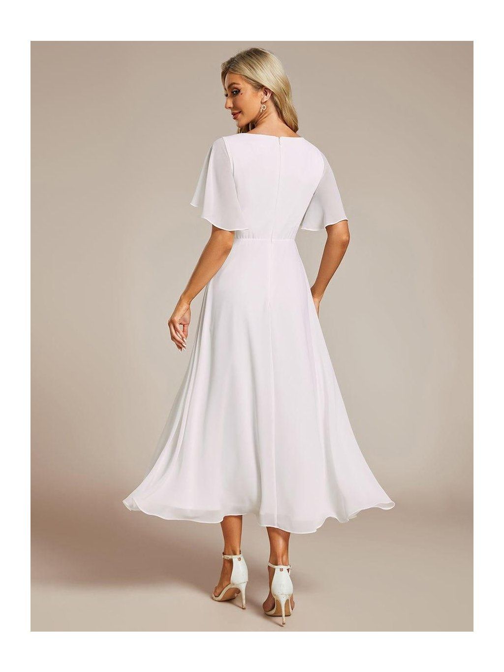 Sukně sahá přibližně do poloviny lýtek a díky lehkému šifonu se při chůzi přirozeně pohybuje. Horní část tvoří výstřih do V s jemným řasením, které směřuje do pasu. V jeho linii je umístěná nenápadná aplikace, která opticky odděluje živůtek od sukně a dodává šatům decentní detail. Rukávy jsou krátké, volné a lehce rozšířené. Nepřiléhají k paži a zachovávají vzdušnost celého modelu.