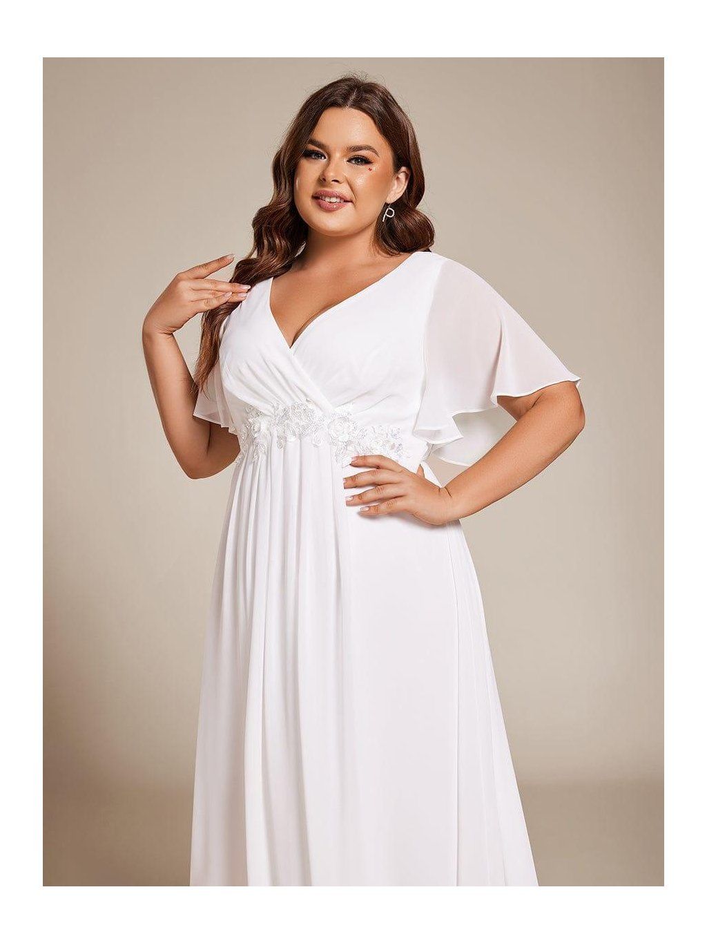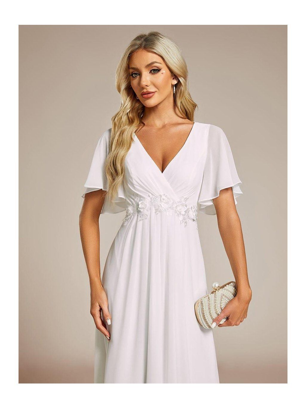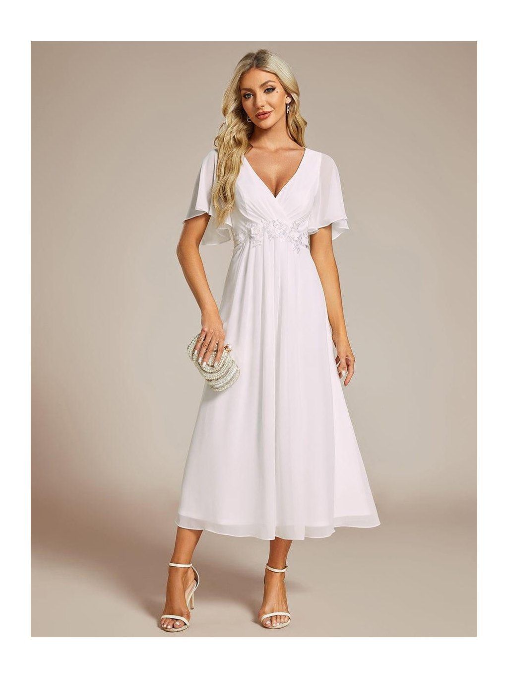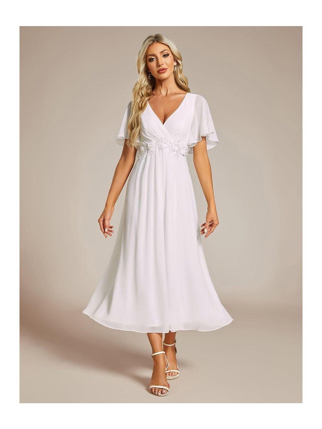 Sukně sahá přibližně do poloviny lýtek a díky lehkému šifonu se při chůzi přirozeně pohybuje. Horní část tvoří výstřih do V s jemným řasením, které směřuje do pasu. V jeho linii je umístěná nenápadná aplikace, která opticky odděluje živůtek od sukně a dodává šatům decentní detail. Rukávy jsou krátké, volné a lehce rozšířené. Nepřiléhají k paži a zachovávají vzdušnost celého modelu.