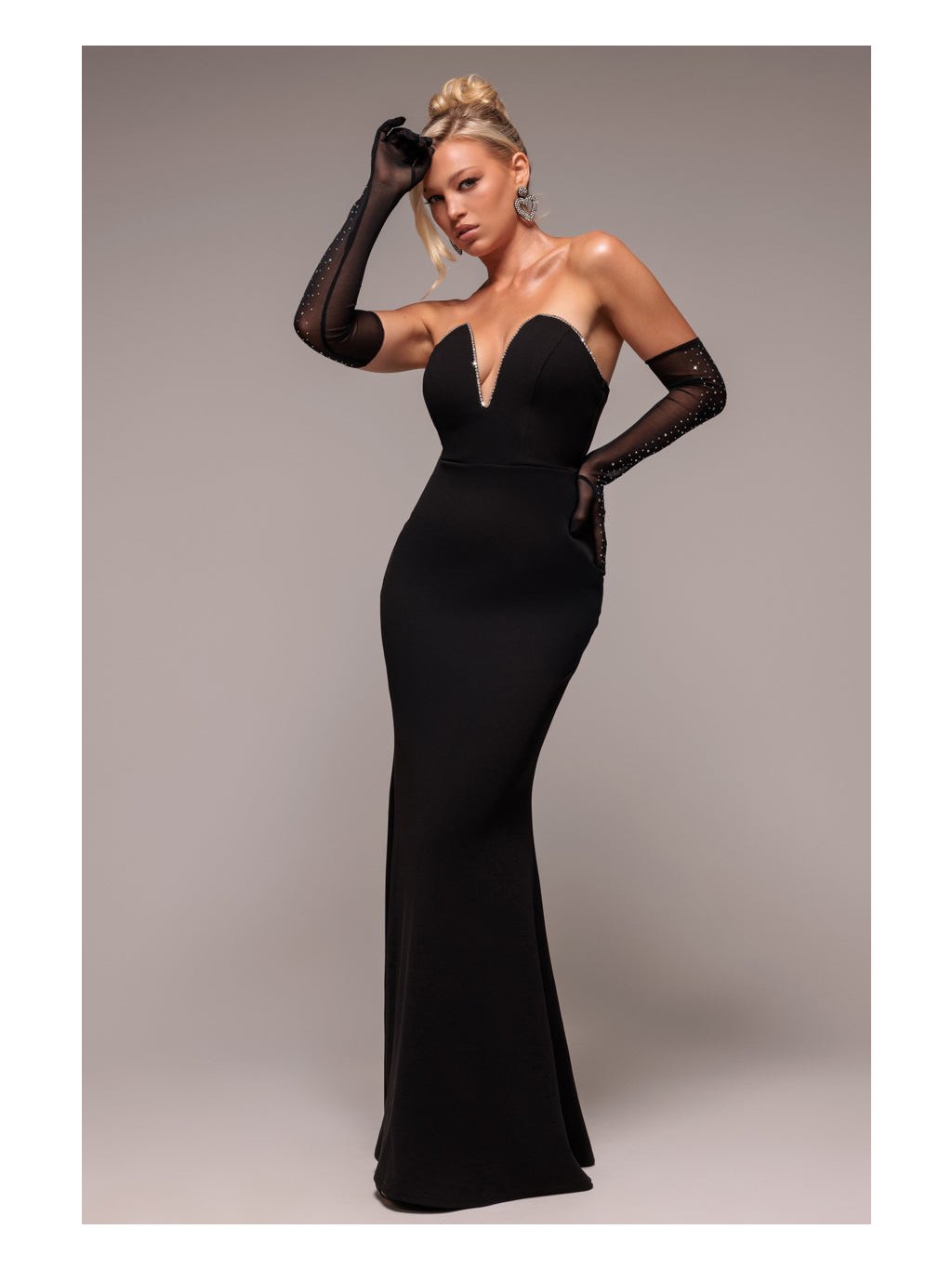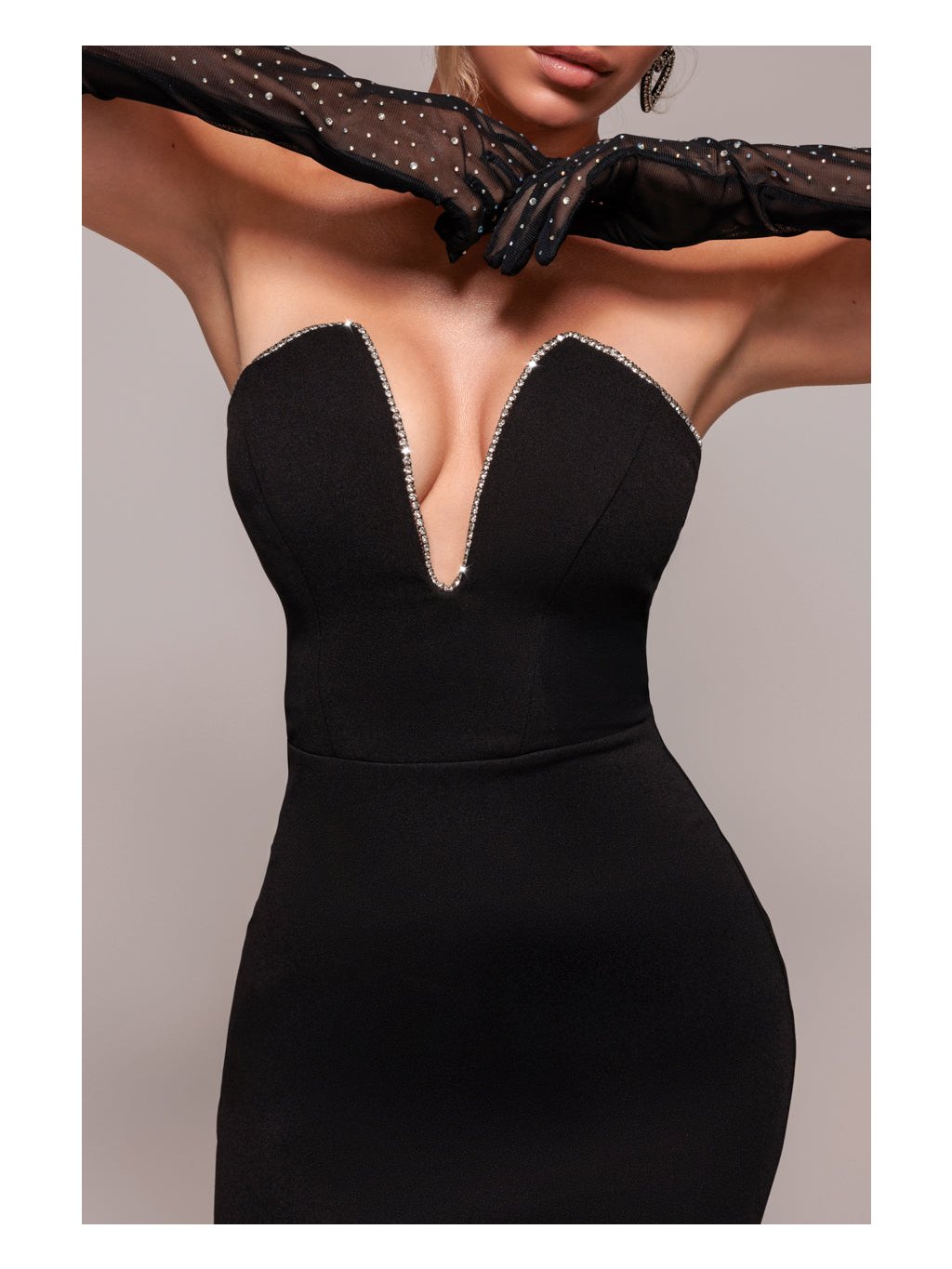 Tyto černé večerní šaty působí maximálně sofistikovaně a zvýrazní ženské křivky díky hladké přiléhavé siluetě a hlubokému výstřihu ve tvaru V. Jemná třpytivá linie dodává šatům luxusní nádech a efektně přitahuje pohled. Délka až na zem vytváří elegantní, protáhlou postavu – ideální na galavečery, večírky a formální společenské akce.