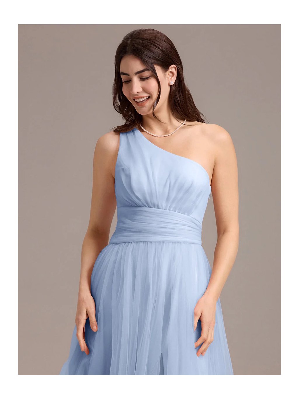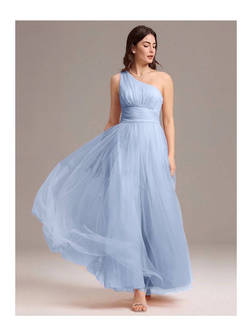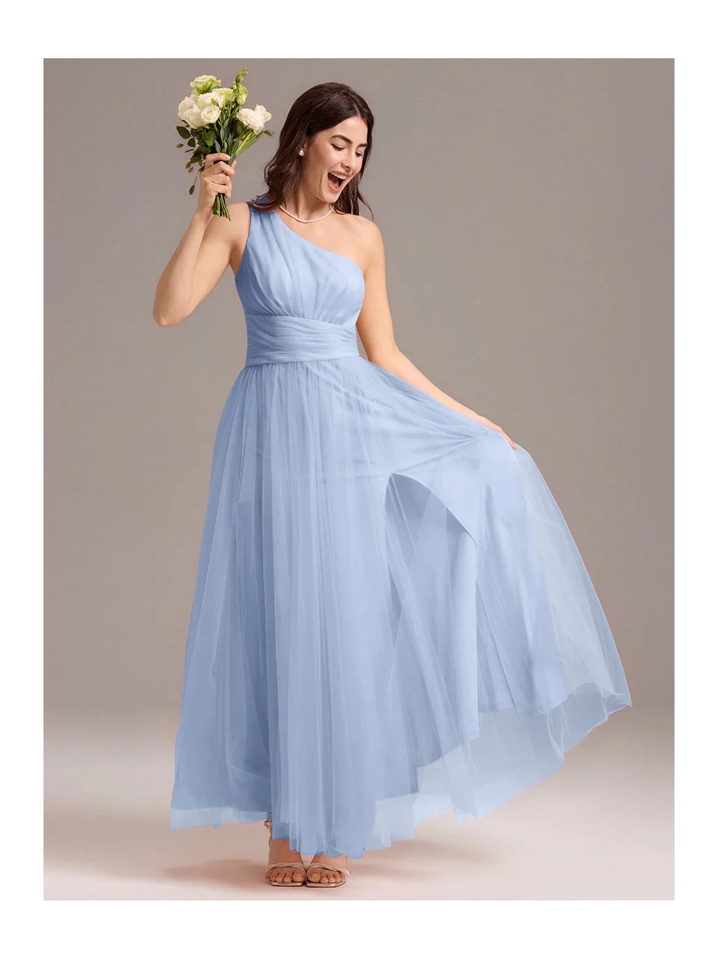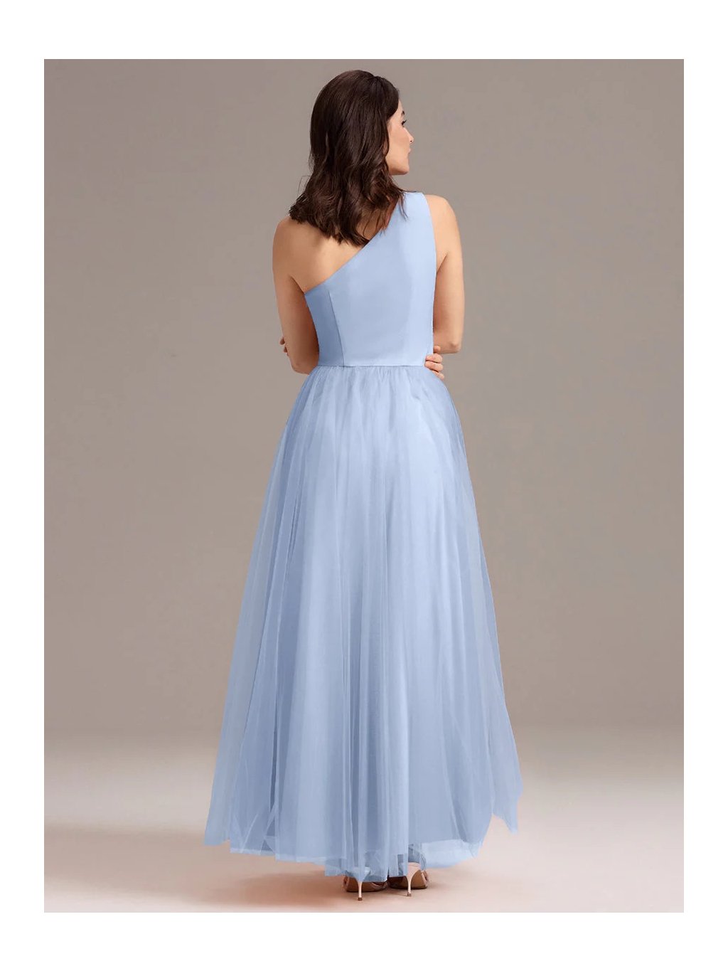 Elegantní a šik volba pro družičky nebo do tanečních. Asymetrický střih na jedno rameno působí moderně a zároveň jemně zvýrazňuje ženský půvab. Jemná síťovina a vrstvený tyl tvoří vzdušný, sofistikovaný vzhled, který se krásně pohybuje při chůzi i tanci. Stylové řasení a decentní rozparek dodávají šatům lehkost a šmrnc. Délka ke kotníkům je ideální pro slavnostní příležitosti – od svateb až po plesy. Model nemá vyztužené košíčky.