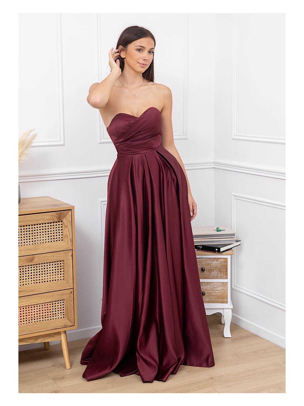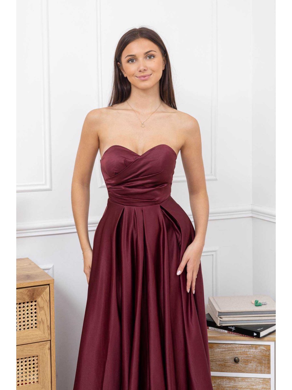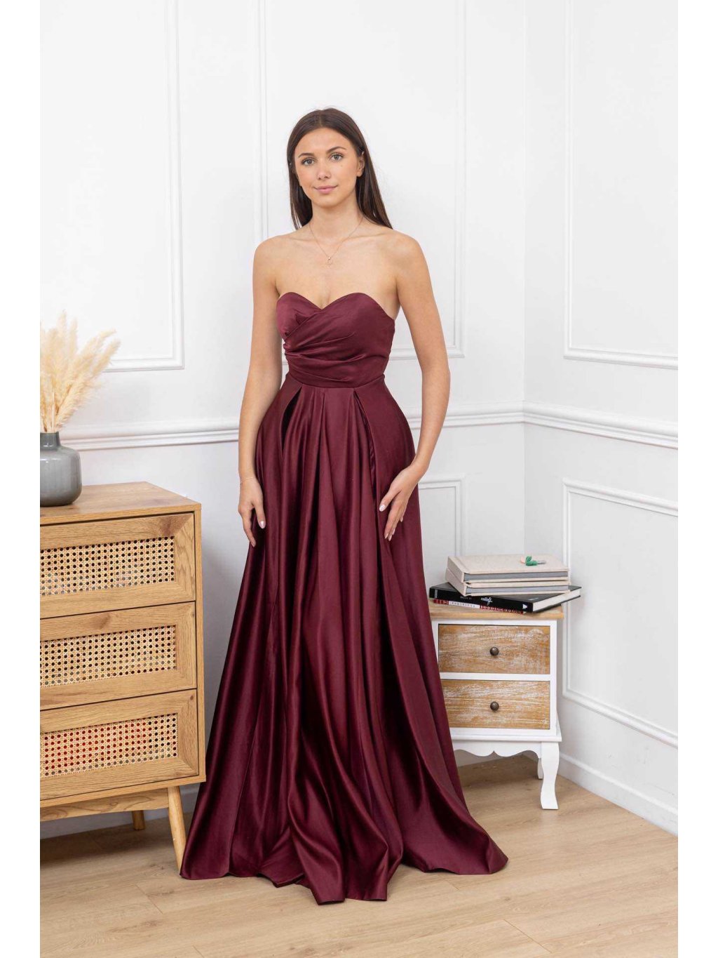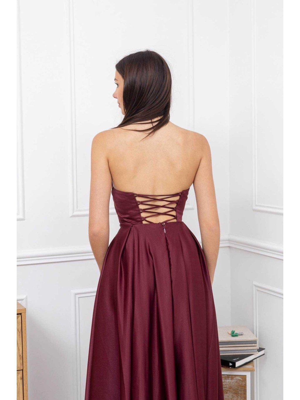 Saténové šaty v bordó barvě kombinují jednoduchý střih s praktickými detaily. Hladký živůtek bez ramínek má skládaný dekolt, který dobře sedí a drží tvar. Pas je konstruovaný tak, aby zvýraznil postavu a plynule navazoval do rozšířené sukně. Na zádech je funkční šněrování, díky němuž lze šaty přizpůsobit postavě, a pod ním skrytý zip, který usnadňuje oblékání. Dlouhá sukně splývá a vytváří elegantní siluetu vhodnou pro plesy, večírky i svatební oslavy.
