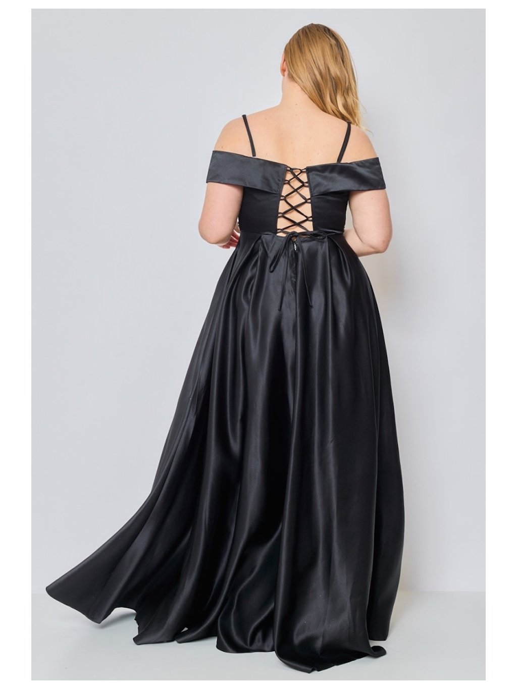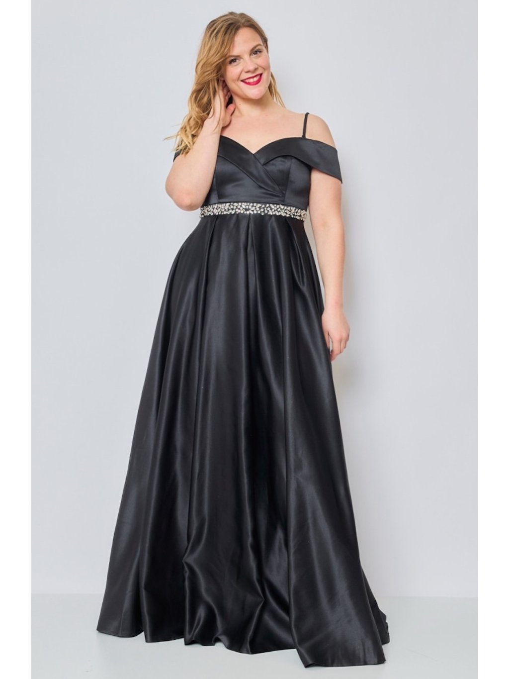 Černé společenské šaty z jemného saténu působí elegantně, ale zároveň velmi ženským dojmem. Spadlý rukáv a ramínka nechávají vyniknout ramenům a kamínkový pásek dodává modelu decentní třpyt. Díky šněrování na zádech se šaty snadno přizpůsobí postavě a perfektně sedí. Skvělá volba na ples, slavnostní galavečer nebo jinou večerní událost.