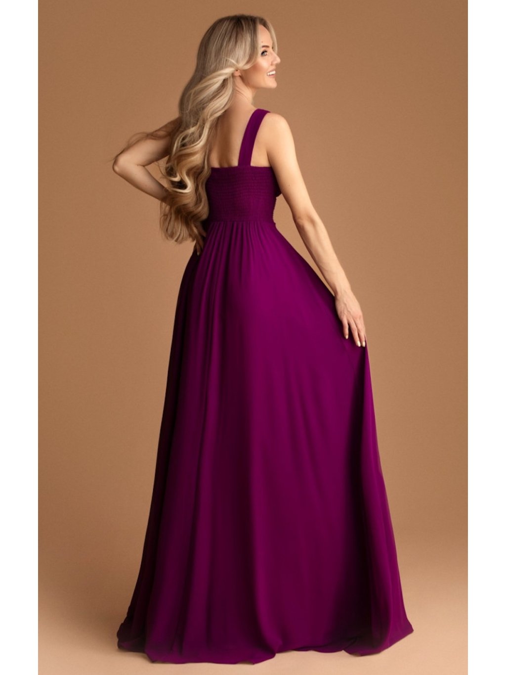 Dlouhé fialové šaty s rozparkem a hlubším výstřihem