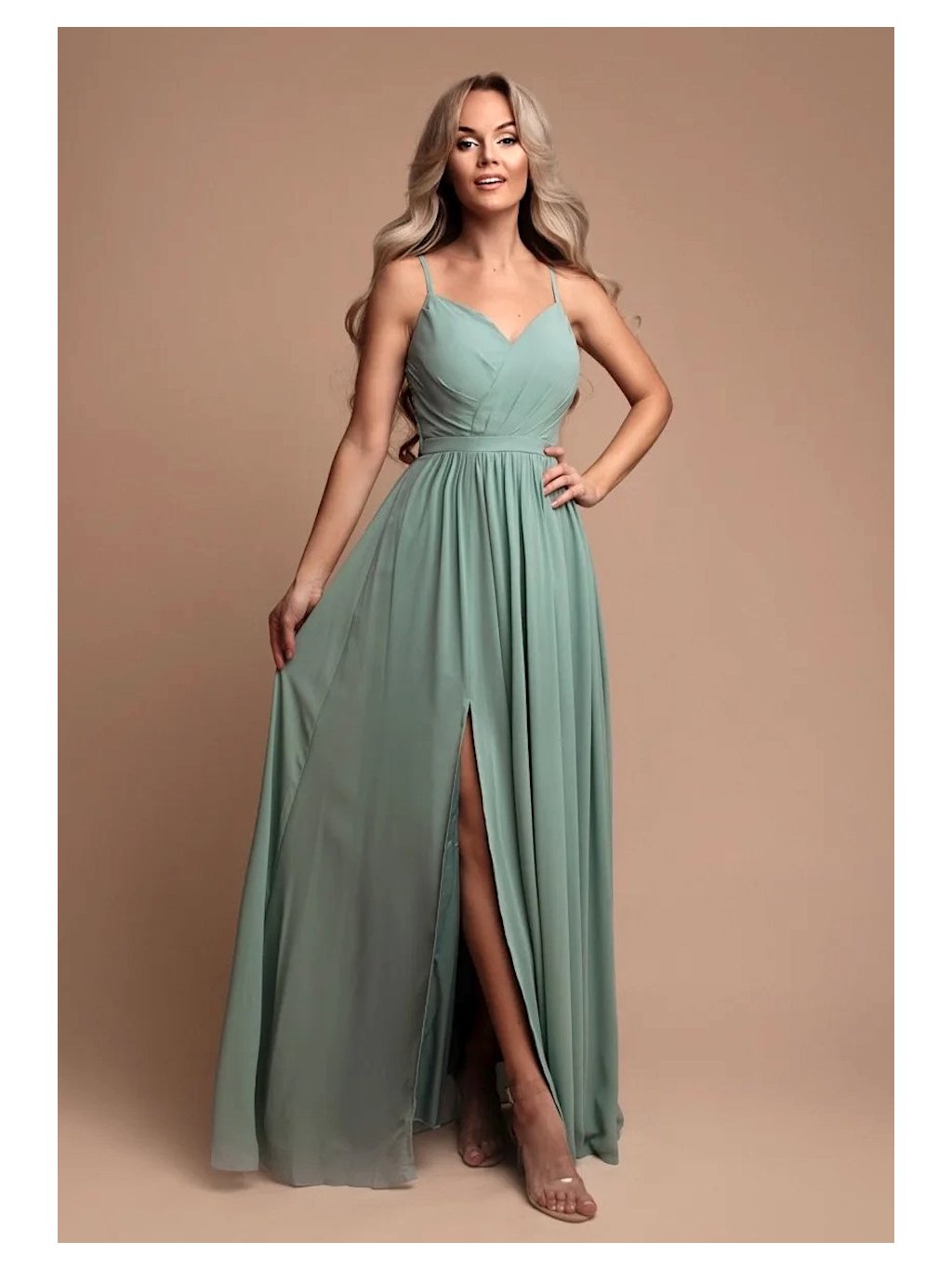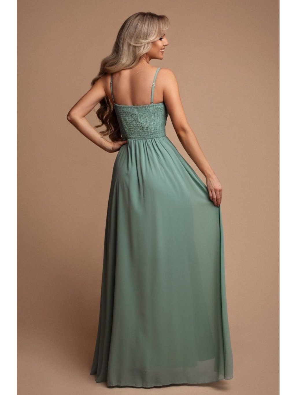 Dlouhé šaty s rozparkem ve světlém mentolovém odstínu jsou jako stvořené pro družičky, do tanečních, na ples, ale i na letní zahradní párty. Šaty skvěle padnou díky žabičkování na zádech a mají prsní vycpávky.