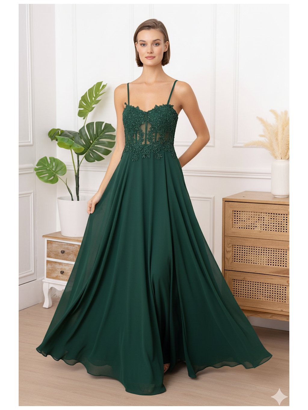 Smaragdově laděný odstín v kombinaci s krajkovým živůtkem vytváří šaty, které přitáhnou pohledy hned při vstupu do místnosti. Precizní krajkové zdobení působí elegantně a zároveň trendy, zatímco jemná ramínka krásně podtrhují ženské linie. Lehká splývavá sukně se ladně pohybuje s každým krokem a dodává celému outfitu pohádkový šmrnc. Tento model je perfektní volbou pro večerní akce, plesy nebo svatby, kde chcete zazářit ve stylu, který se jen tak neokouká.