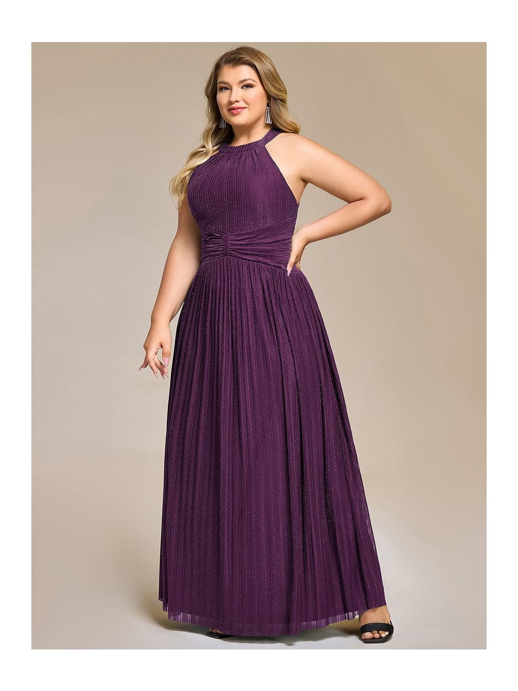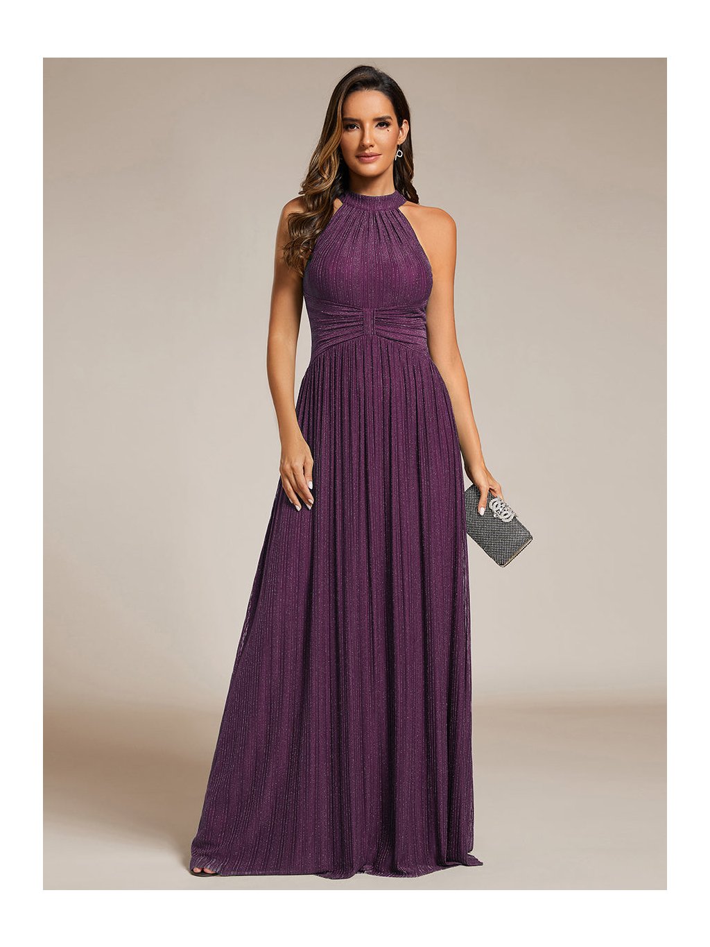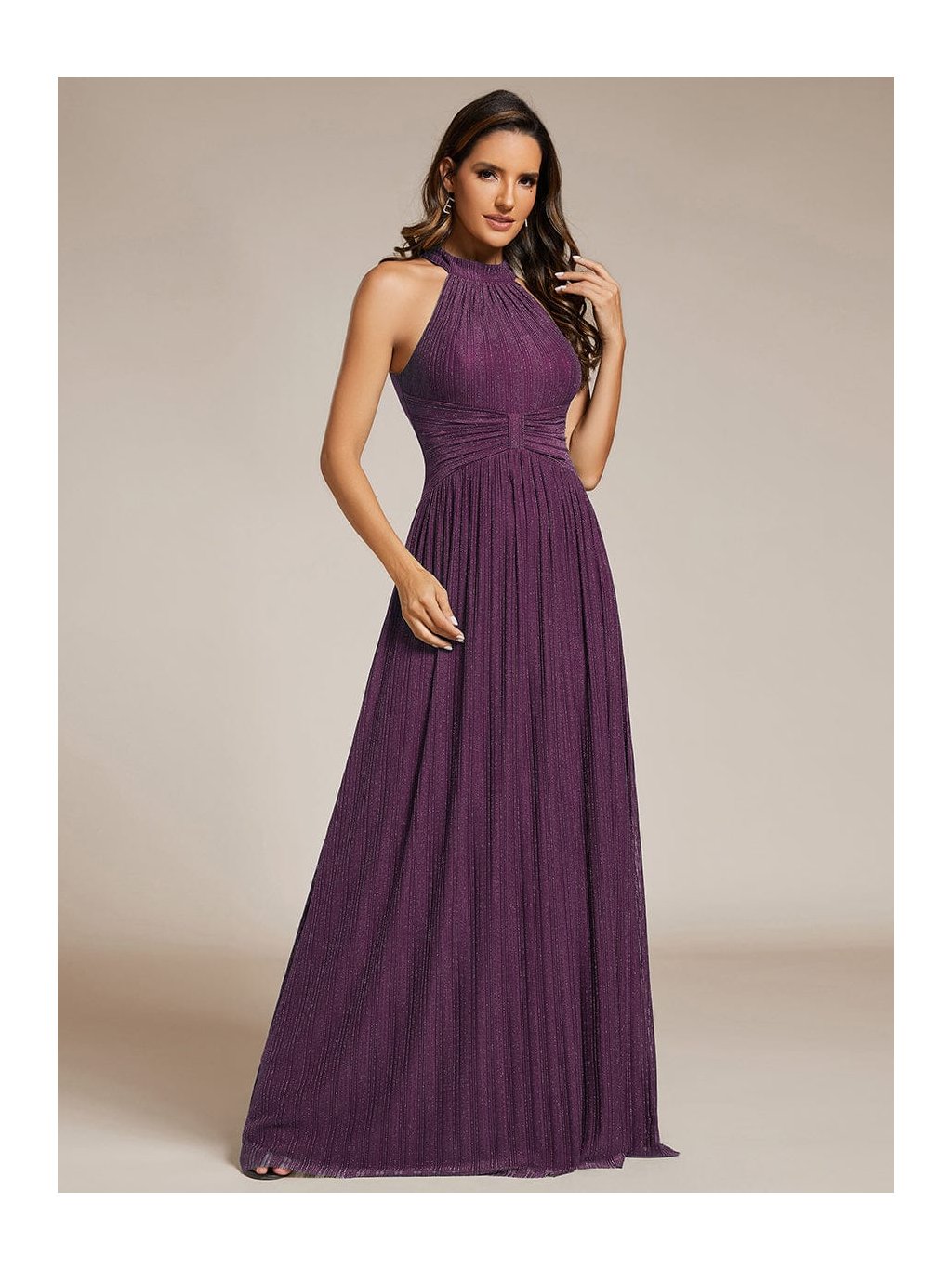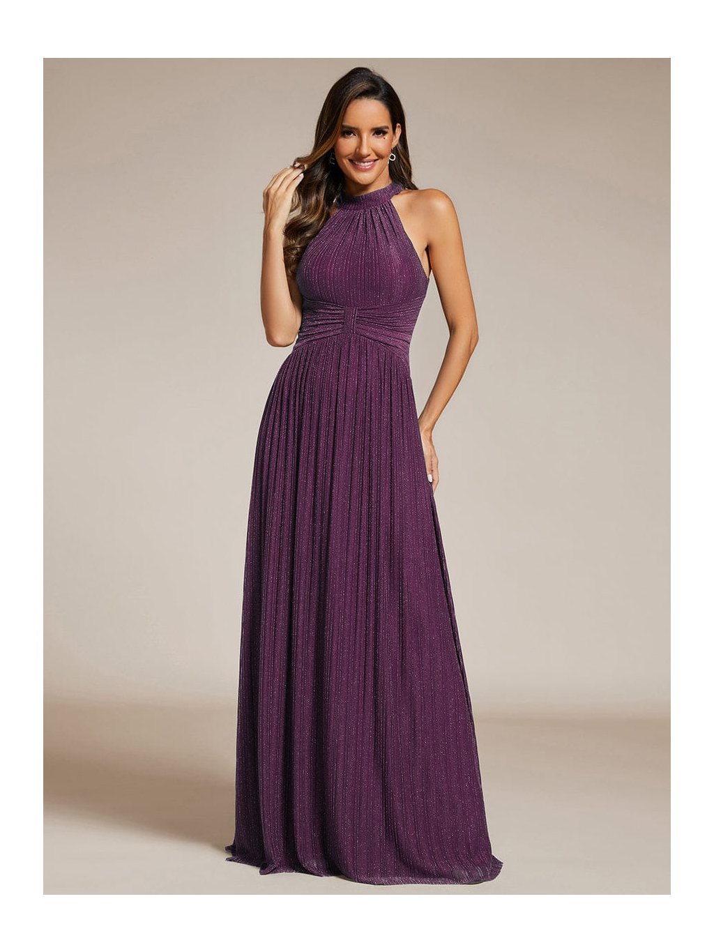 Tyto společenské šaty v maxi délce působí výrazně, ale stále velmi vkusně. Stojáčkový halter výstřih přitahuje pozornost k ramenům a krku, jemné řasení v oblasti pasu vytváří efekt zeštíhlení a pěkně pracuje s proporcemi. Materiál s decentním třpytem podtrhuje pohyb sukně, která volně splývá až k zemi a působí lehce při chůzi i tanci. Model je skvělou volbou na ples, večerní gala i reprezentativní firemní akce, kde chcete vypadat elegantně a jistě.