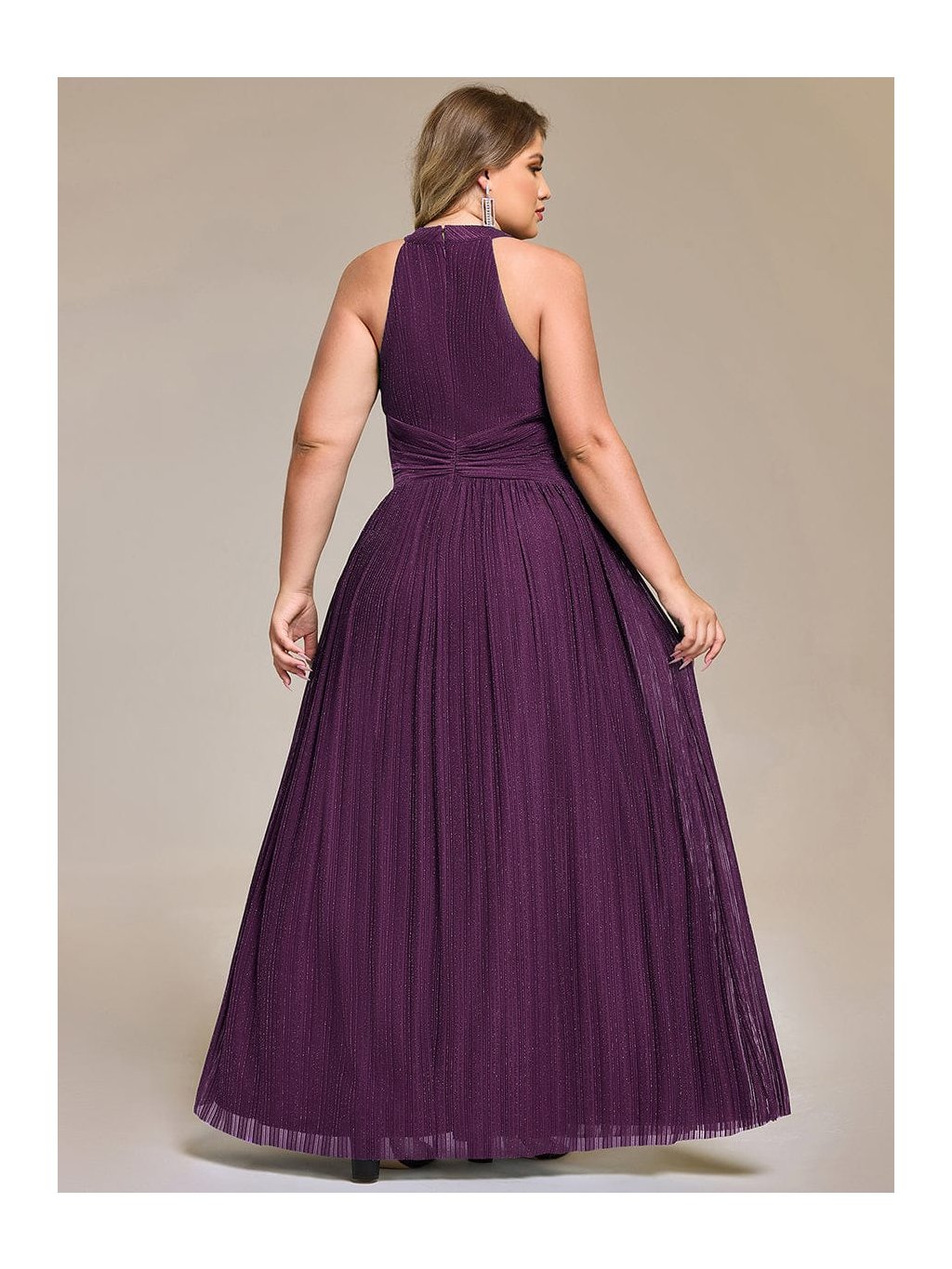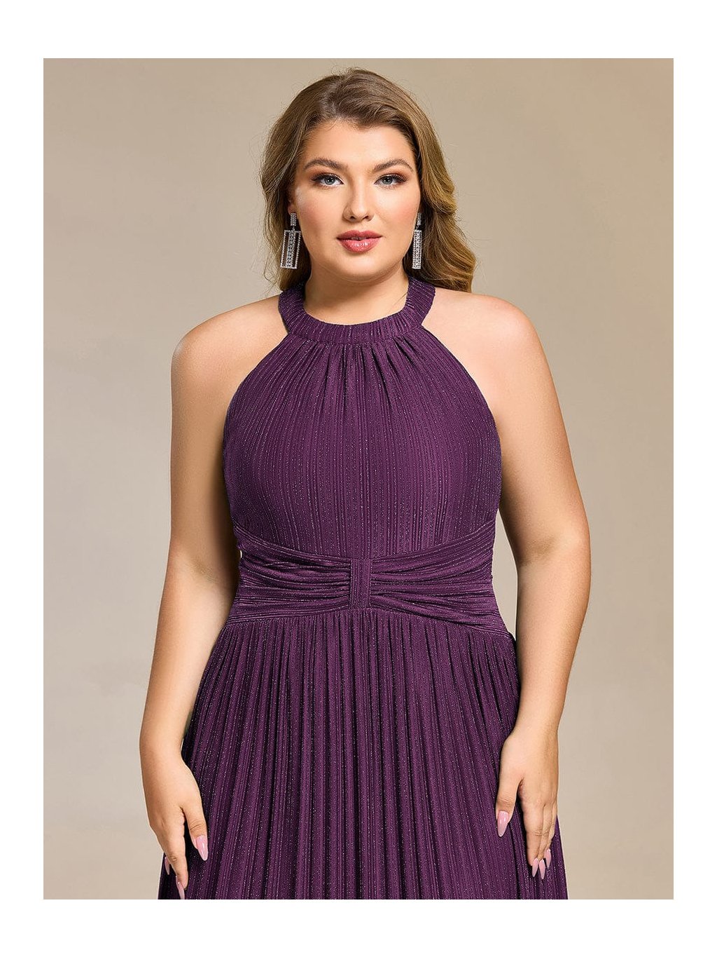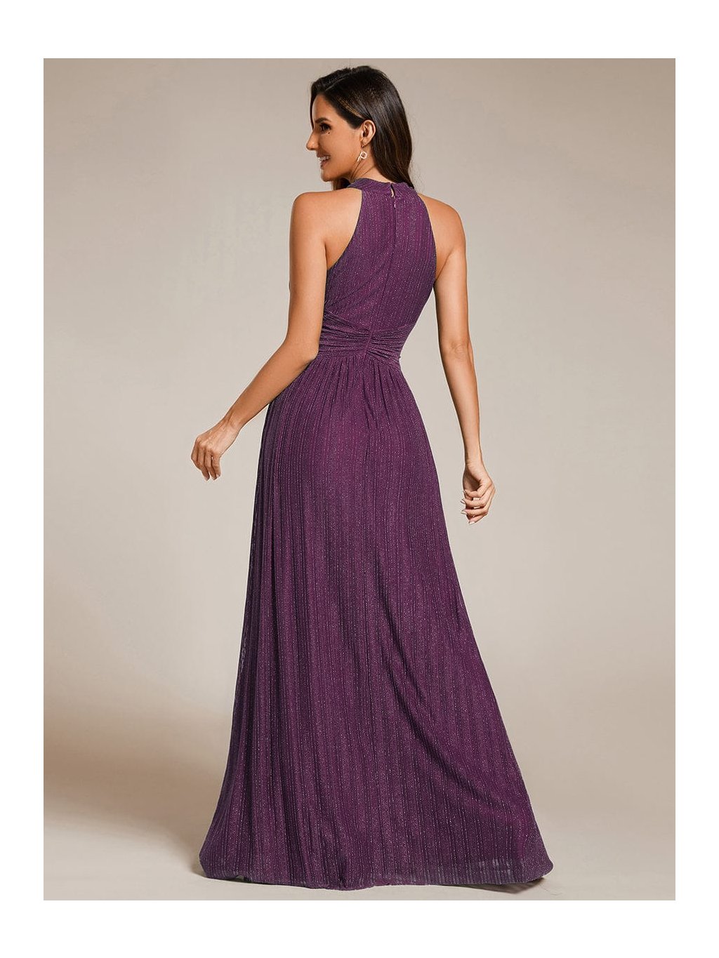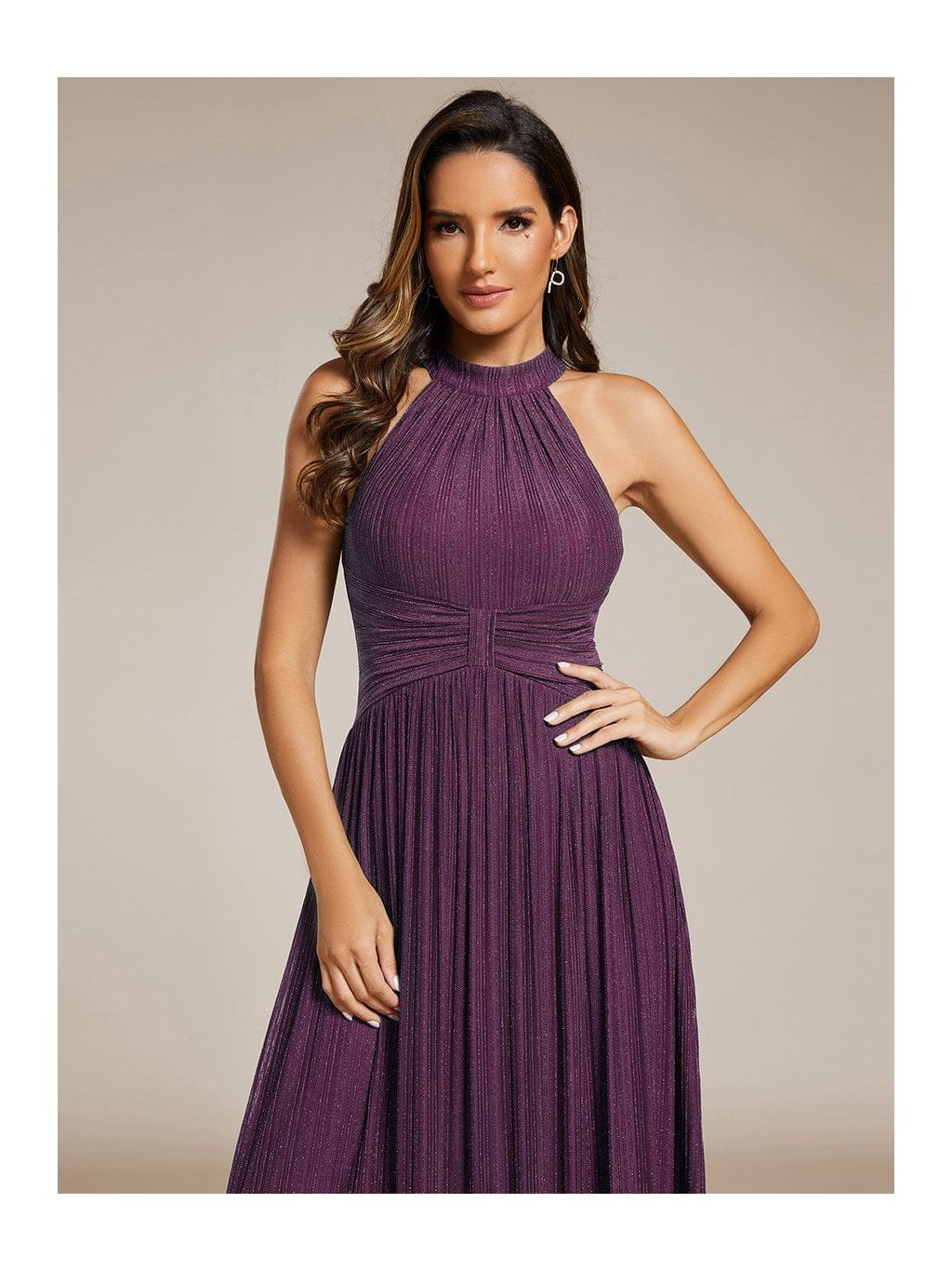 Tyto společenské šaty v maxi délce působí výrazně, ale stále velmi vkusně. Stojáčkový halter výstřih přitahuje pozornost k ramenům a krku, jemné řasení v oblasti pasu vytváří efekt zeštíhlení a pěkně pracuje s proporcemi. Materiál s decentním třpytem podtrhuje pohyb sukně, která volně splývá až k zemi a působí lehce při chůzi i tanci. Model je skvělou volbou na ples, večerní gala i reprezentativní firemní akce, kde chcete vypadat elegantně a jistě.