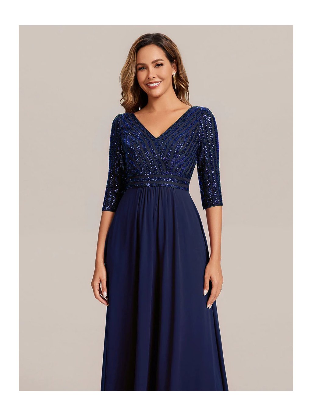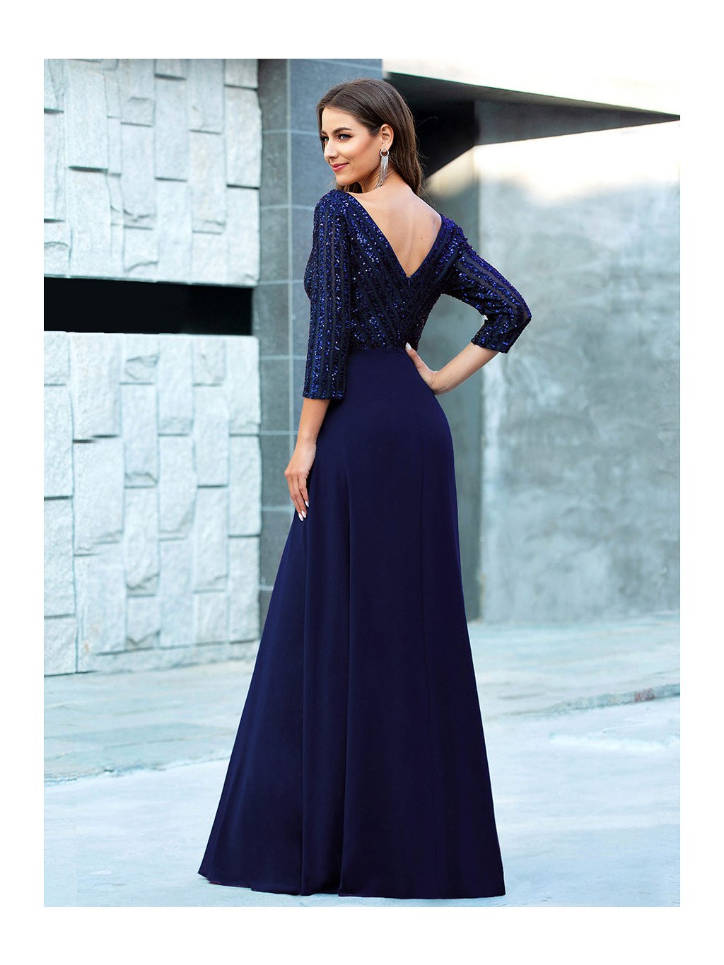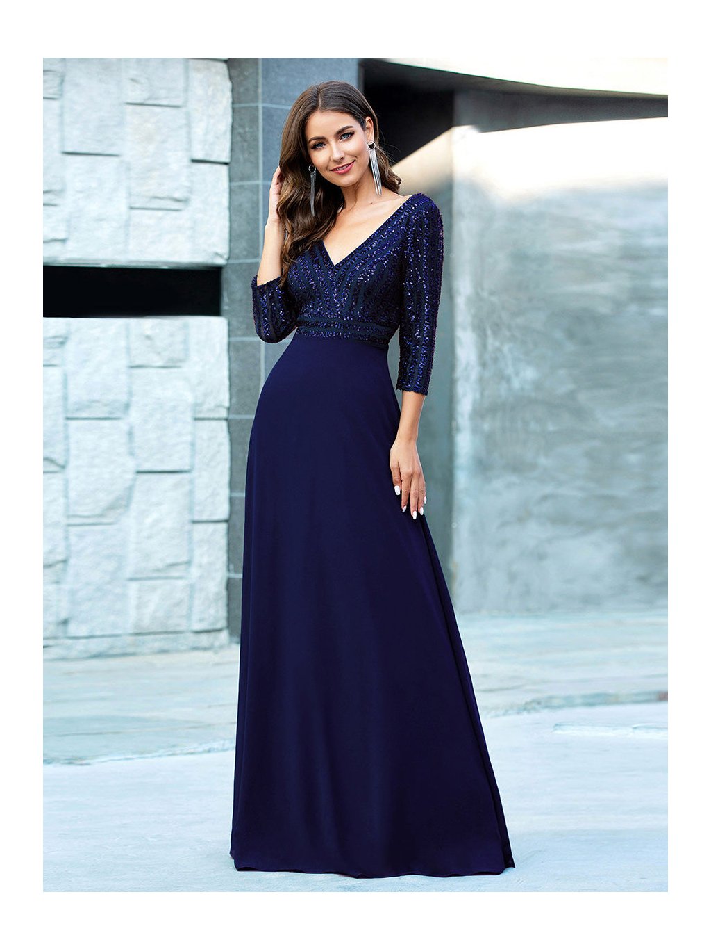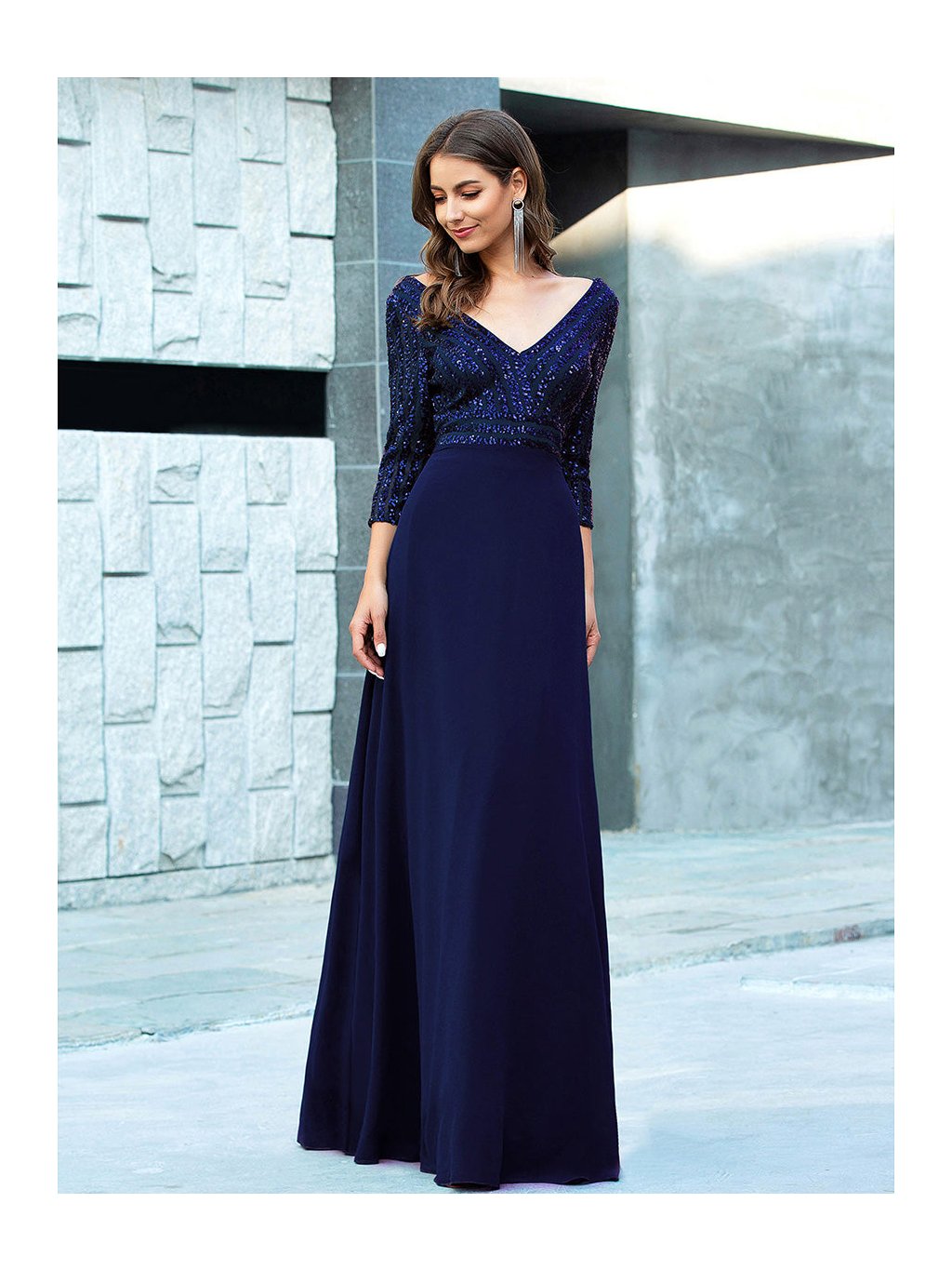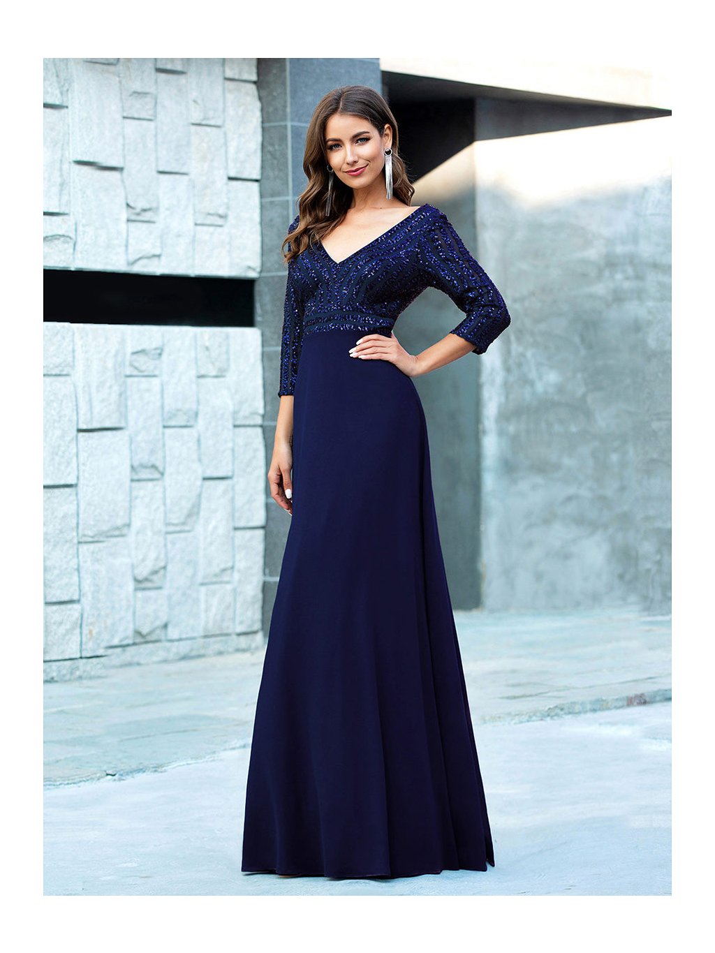 Tyto večerní šaty staví na kontrastu zdobeného horního dílu a čisté, plynulé linie sukně. Flitrový živůtek dodává modelu slavnostní charakter a jemný lesk, aniž by působil přehnaně výrazně. Výstřih do V vpředu i na zádech opticky prodlužuje postavu. Tříčtvrteční rukávy přidávají šatům noblesu a činí je vhodnými i pro formálnější události. Díky vyváženému střihu a kvalitnímu zpracování působí celý model velmi kultivovaně a nadčasově. Šaty se hodí na plesy, slavnostní večery, svatby i jiné společenské příležitosti, kde je žádoucí elegantní a reprezentativní vzhled.