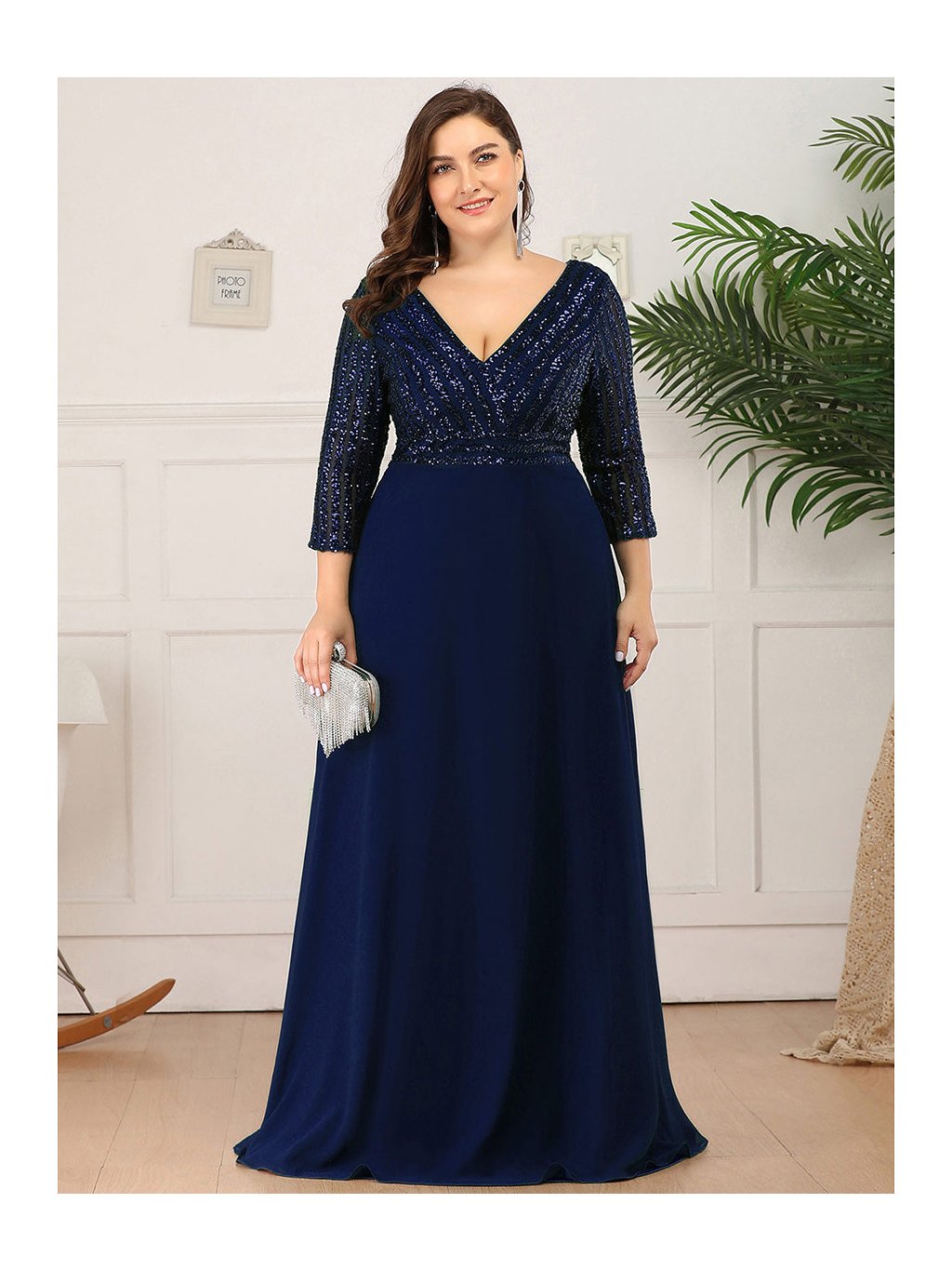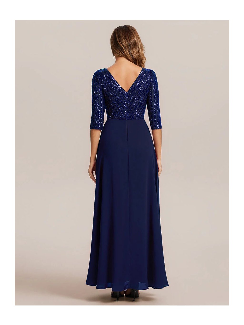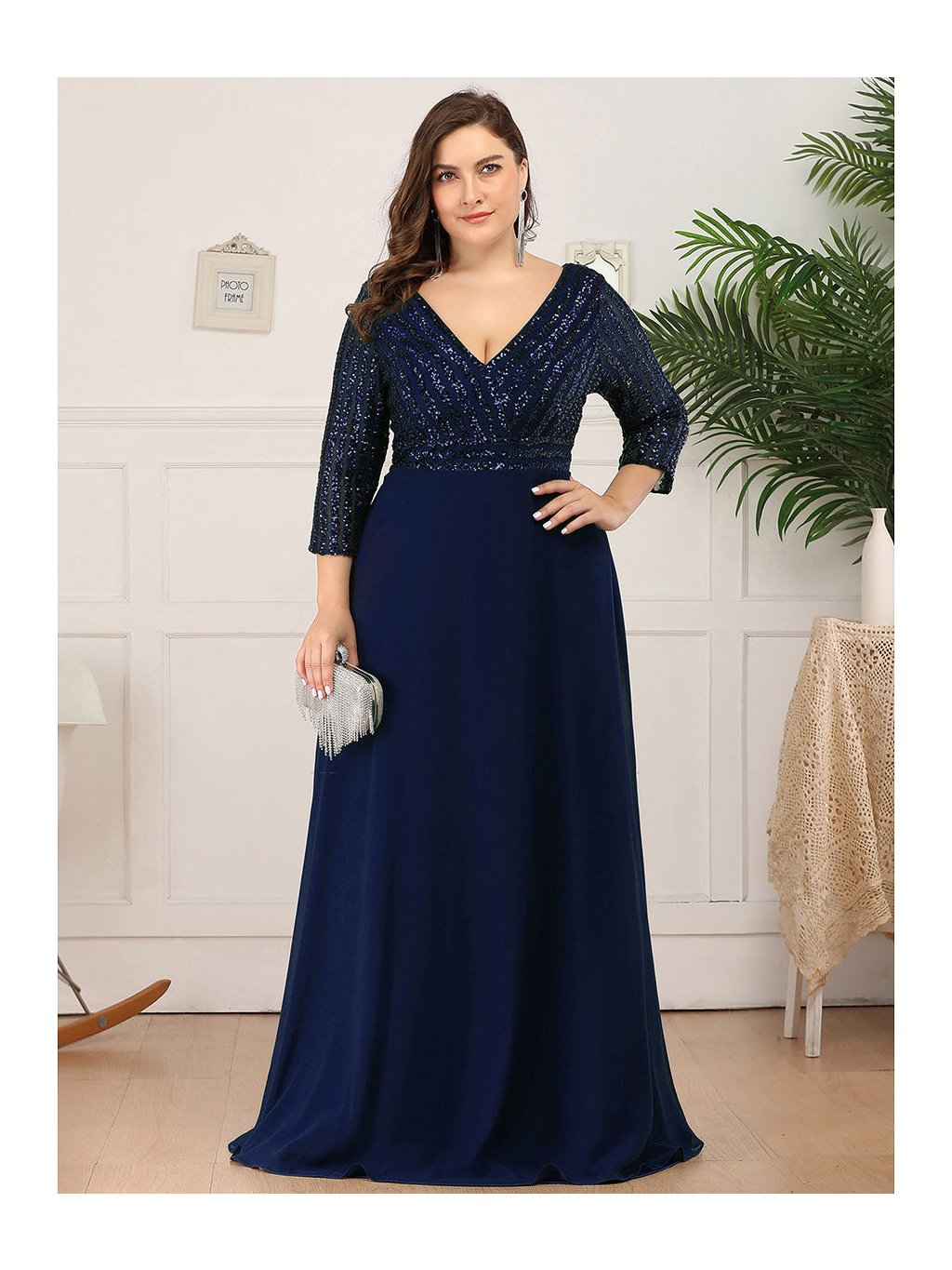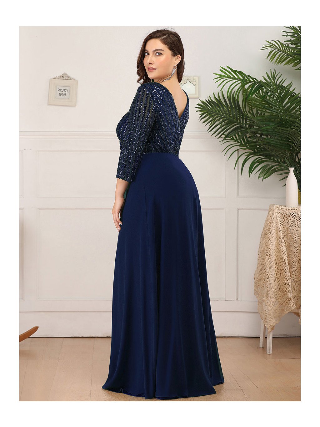 Tyto večerní šaty staví na kontrastu zdobeného horního dílu a čisté, plynulé linie sukně. Flitrový živůtek dodává modelu slavnostní charakter a jemný lesk, aniž by působil přehnaně výrazně. Výstřih do V vpředu i na zádech opticky prodlužuje postavu. Tříčtvrteční rukávy přidávají šatům noblesu a činí je vhodnými i pro formálnější události. Díky vyváženému střihu a kvalitnímu zpracování působí celý model velmi kultivovaně a nadčasově. Šaty se hodí na plesy, slavnostní večery, svatby i jiné společenské příležitosti, kde je žádoucí elegantní a reprezentativní vzhled.