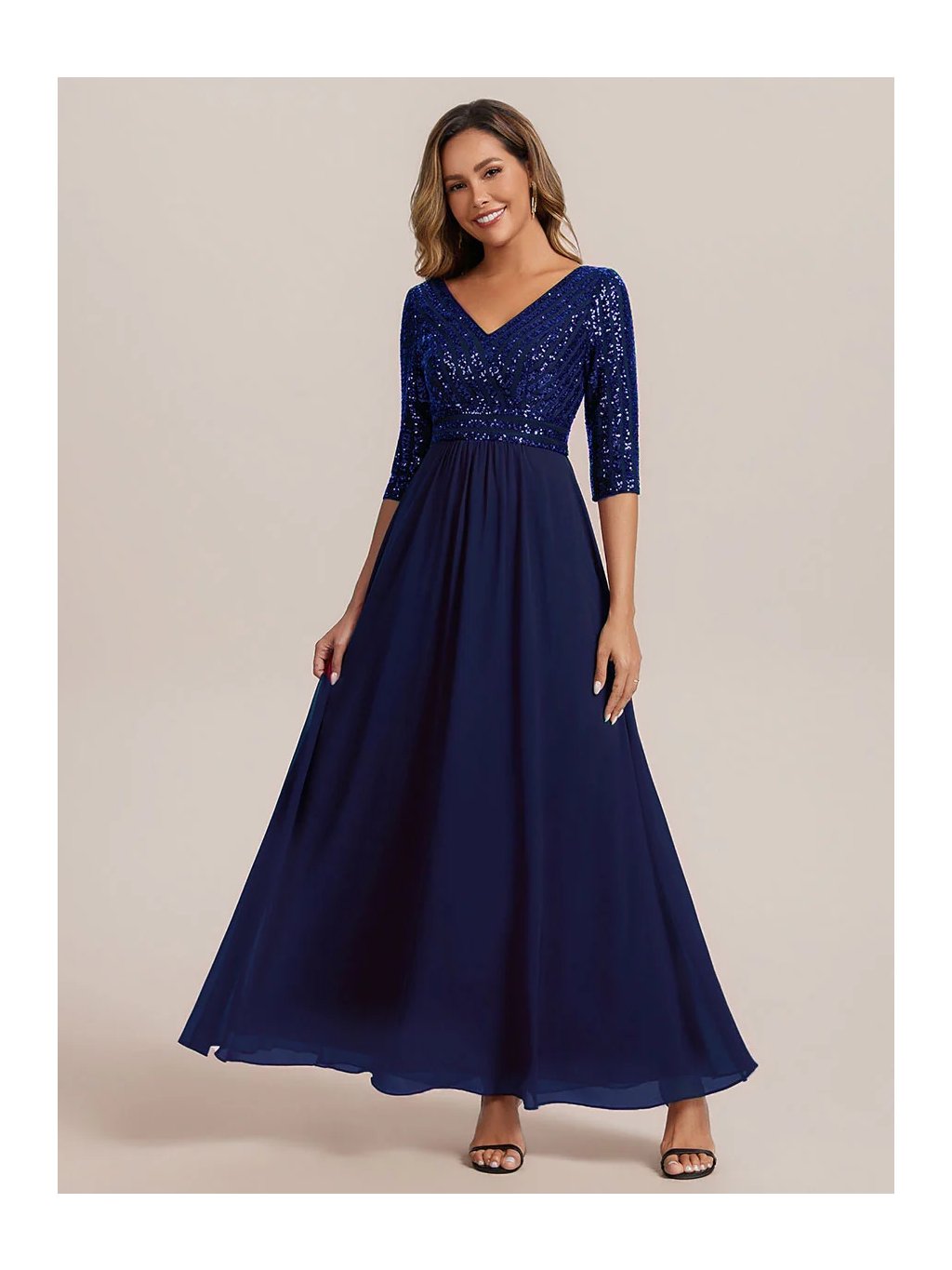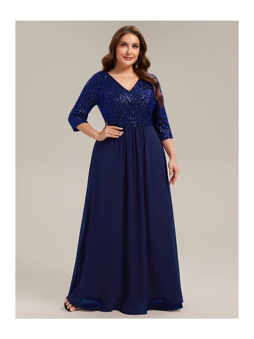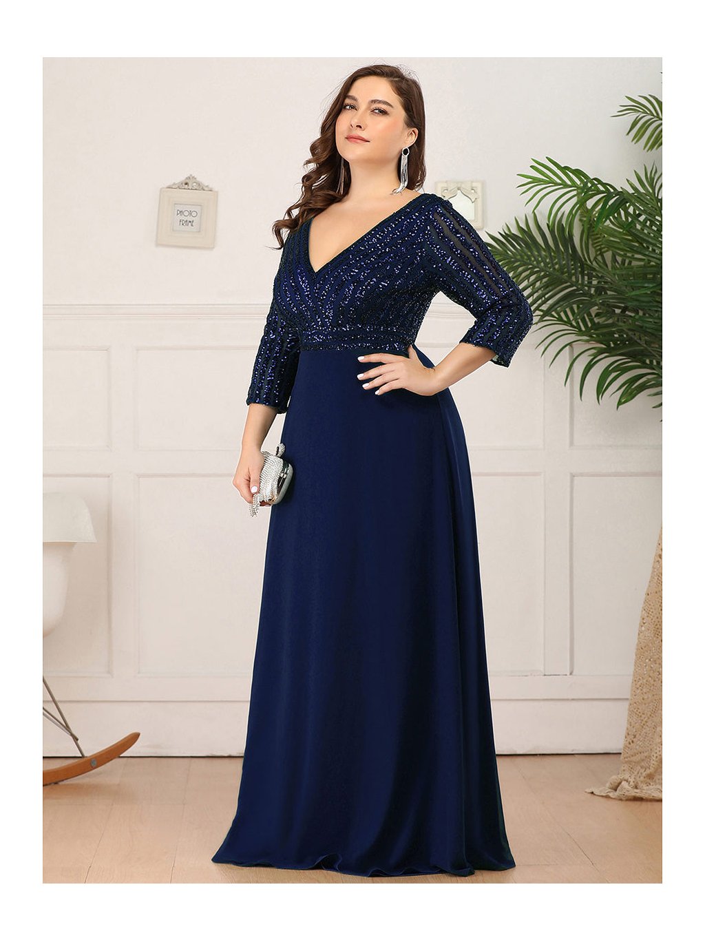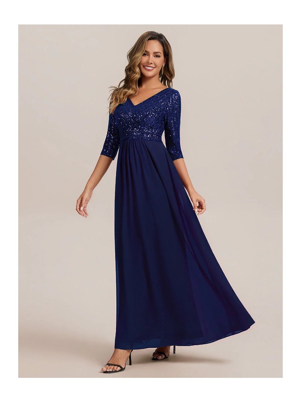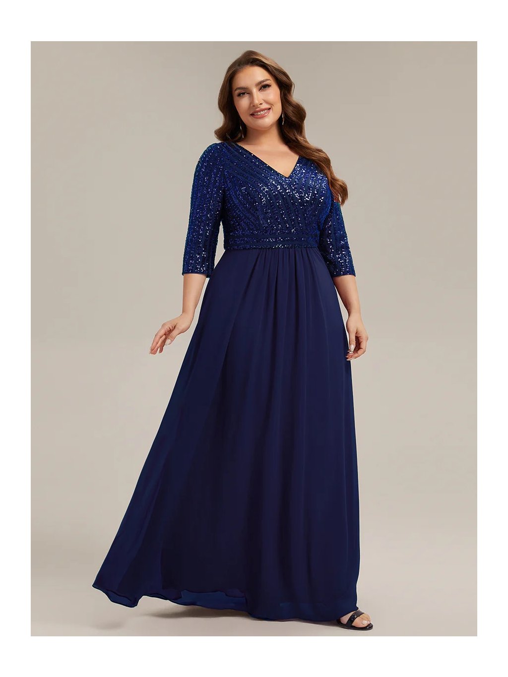 Tyto večerní šaty staví na kontrastu zdobeného horního dílu a čisté, plynulé linie sukně. Flitrový živůtek dodává modelu slavnostní charakter a jemný lesk, aniž by působil přehnaně výrazně. Výstřih do V vpředu i na zádech opticky prodlužuje postavu. Tříčtvrteční rukávy přidávají šatům noblesu a činí je vhodnými i pro formálnější události. Díky vyváženému střihu a kvalitnímu zpracování působí celý model velmi kultivovaně a nadčasově. Šaty se hodí na plesy, slavnostní večery, svatby i jiné společenské příležitosti, kde je žádoucí elegantní a reprezentativní vzhled.
