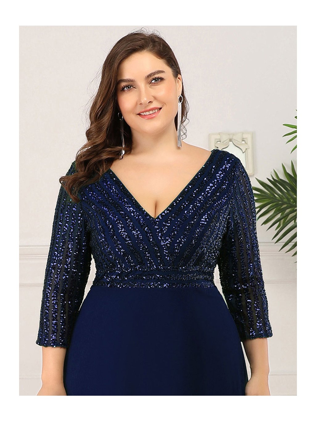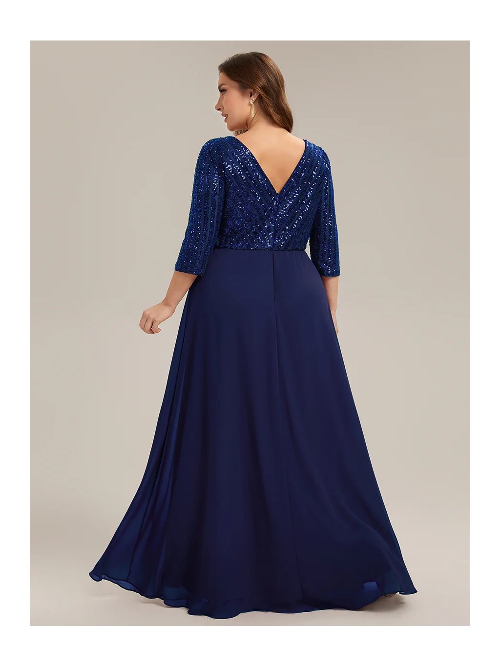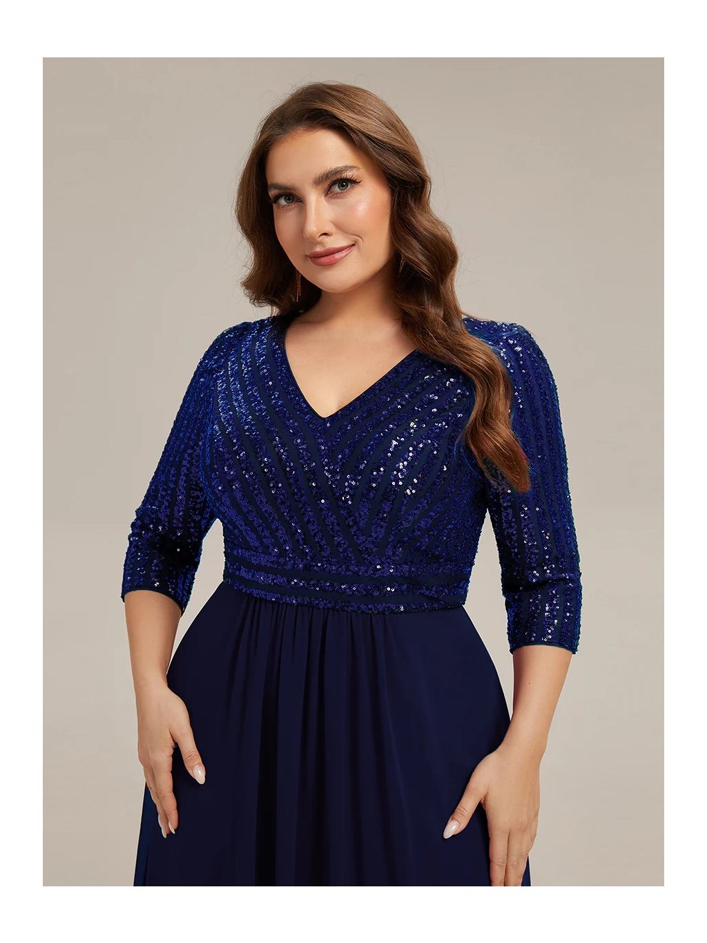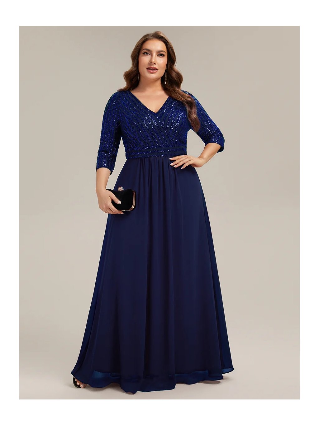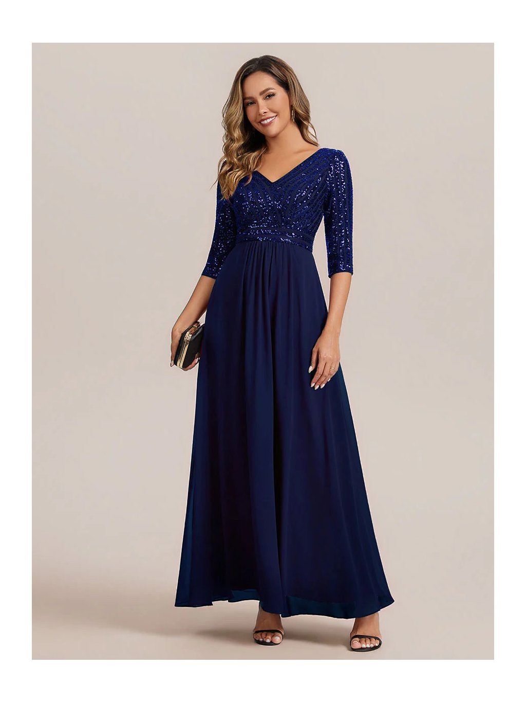 Tyto večerní šaty staví na kontrastu zdobeného horního dílu a čisté, plynulé linie sukně. Flitrový živůtek dodává modelu slavnostní charakter a jemný lesk, aniž by působil přehnaně výrazně. Výstřih do V vpředu i na zádech opticky prodlužuje postavu. Tříčtvrteční rukávy přidávají šatům noblesu a činí je vhodnými i pro formálnější události. Díky vyváženému střihu a kvalitnímu zpracování působí celý model velmi kultivovaně a nadčasově. Šaty se hodí na plesy, slavnostní večery, svatby i jiné společenské příležitosti, kde je žádoucí elegantní a reprezentativní vzhled.