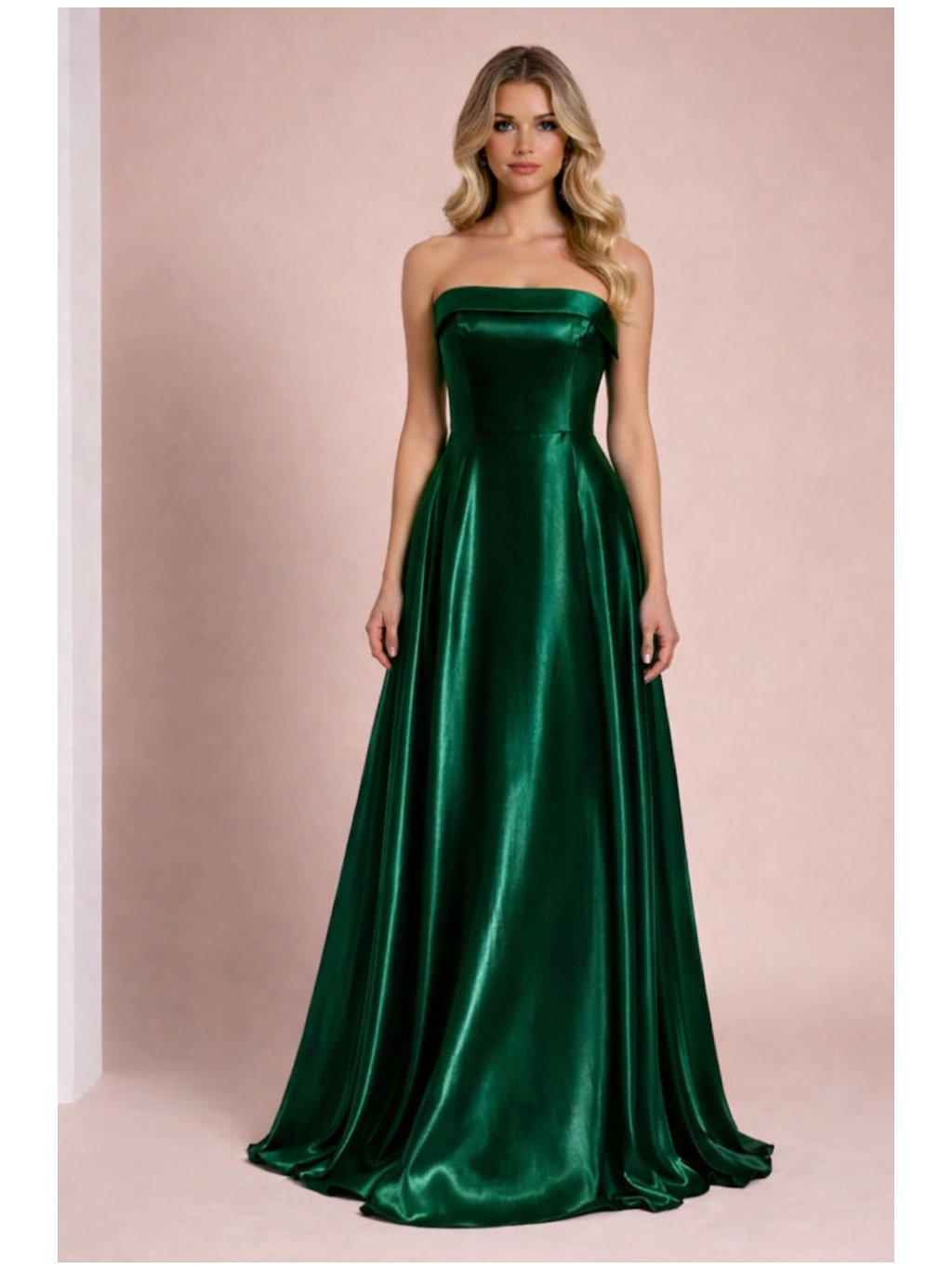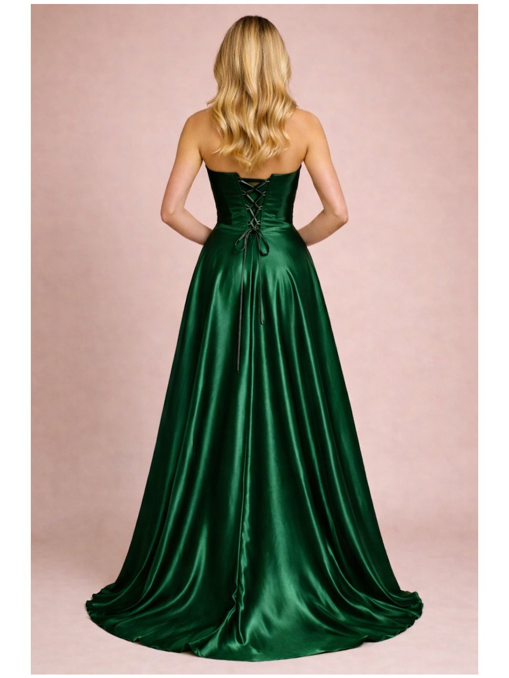 Šaty mají korzetový živůtek bez ramínek, který nechává vyniknout linii ramen a krku. Pevně tvarovaný pas vytváří krásně definovanou siluetu. Zadní šněrování není jen dekorativním prvkem – umožňuje přizpůsobení přesně podle potřeby a dodává modelu jemně smyslný detail. Materiál odráží světlo při každém pohybu a dává šatům luxusní charakter. Bohatá sukně volně splývá až k zemi a vytváří efektní, plynulou linii, která působí velmi elegantně. Ideální volba na plesy, galavečery, formální události i výjimečné večery, kdy vynikne výrazná barva a precizní zpracování.
