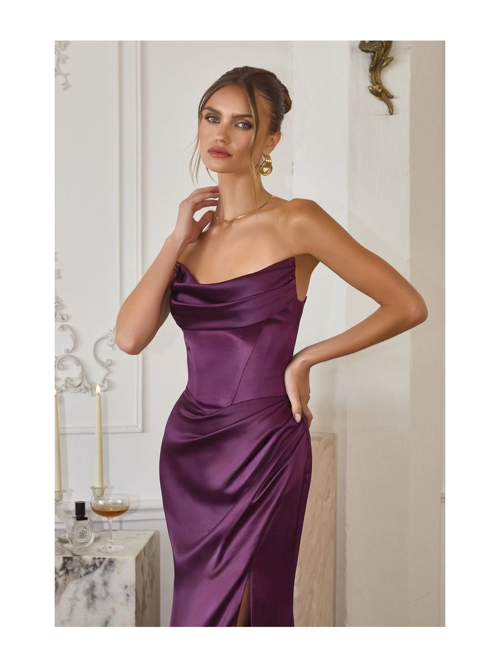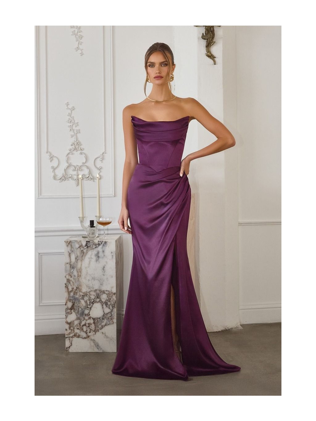 Tyto fialové večerní šaty jsou ušité z hladké látky, která na světle slavnostně odráží lesk. Horní část má korzetový střih s přehnutým okrajem, který pevně drží na těle a vytváří čistou linii dekoltu bez ramínek. Švy na živůtku pomáhají vytvarovat pas a dodávají šatům elegantní siluetu. Sukně sahá až k zemi a má rozparek, který usnadňuje chůzi a zároveň dodává modelu výraznější večerní vzhled. Tento model je ideální volbou na ples, svatbu, galavečer nebo slavnostní večeři.