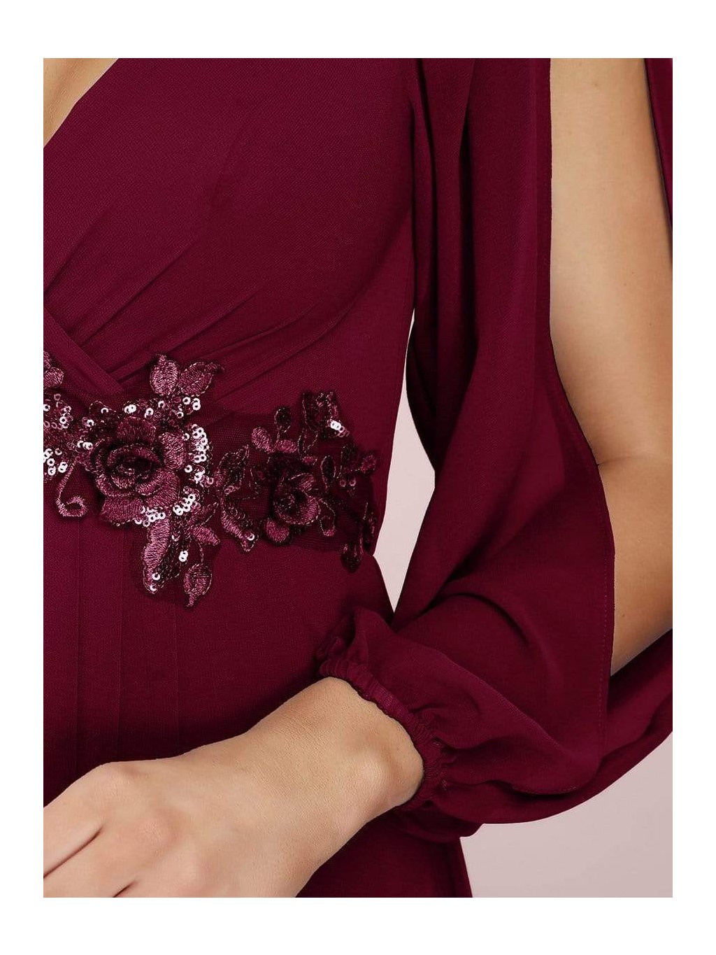 Nádherné společenské šaty s dlouhým prostřiženým rukávem a krajkovou výšivkou v živůtku. Sukně šatů je vsazena trochu výše, což opticky prodlouží postavu. Skvěle se hodí na společenské akce, maturitní večírky, galavečery.