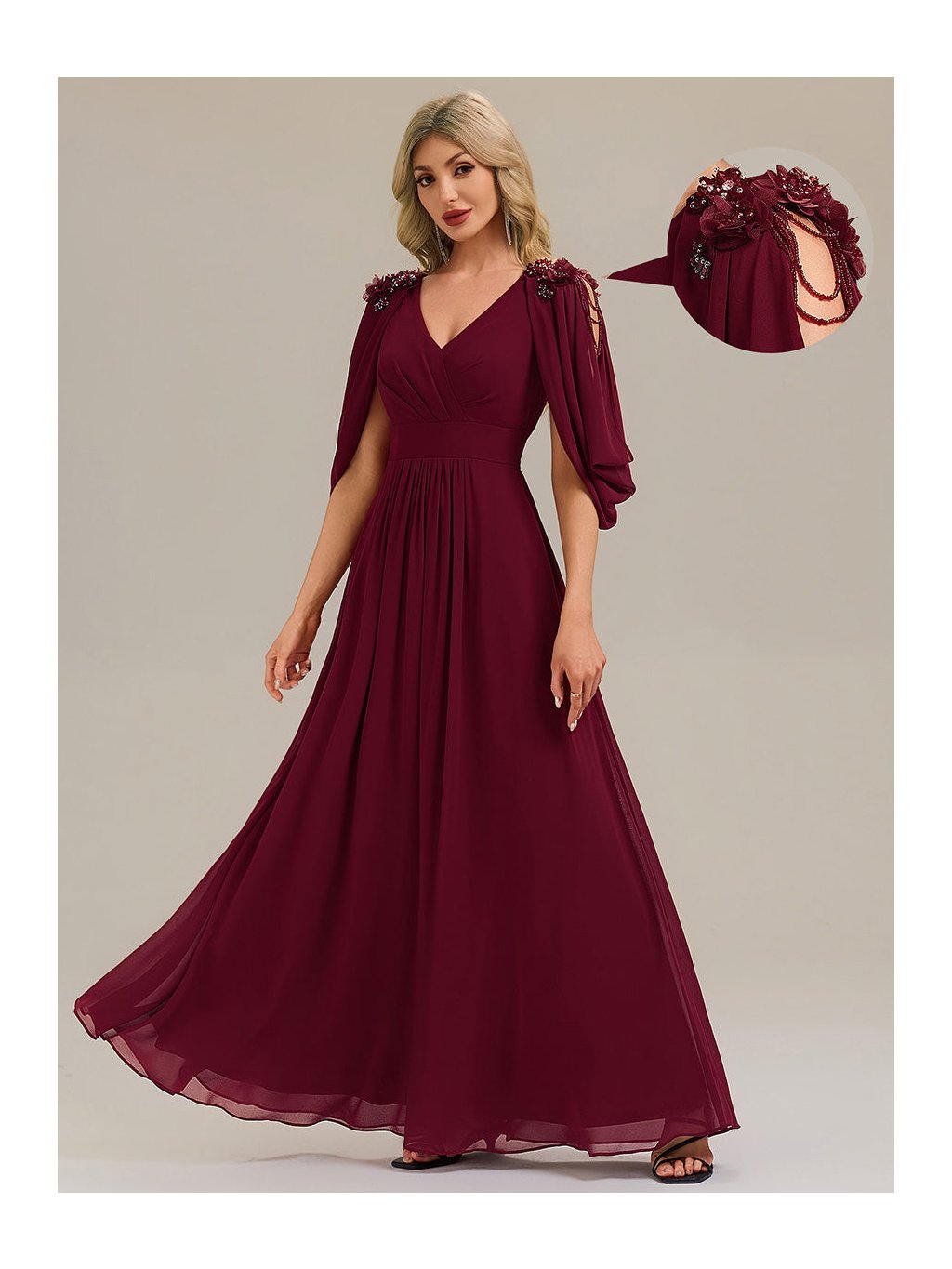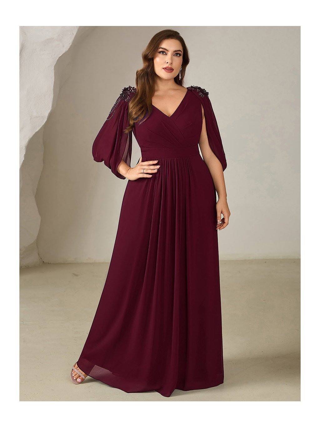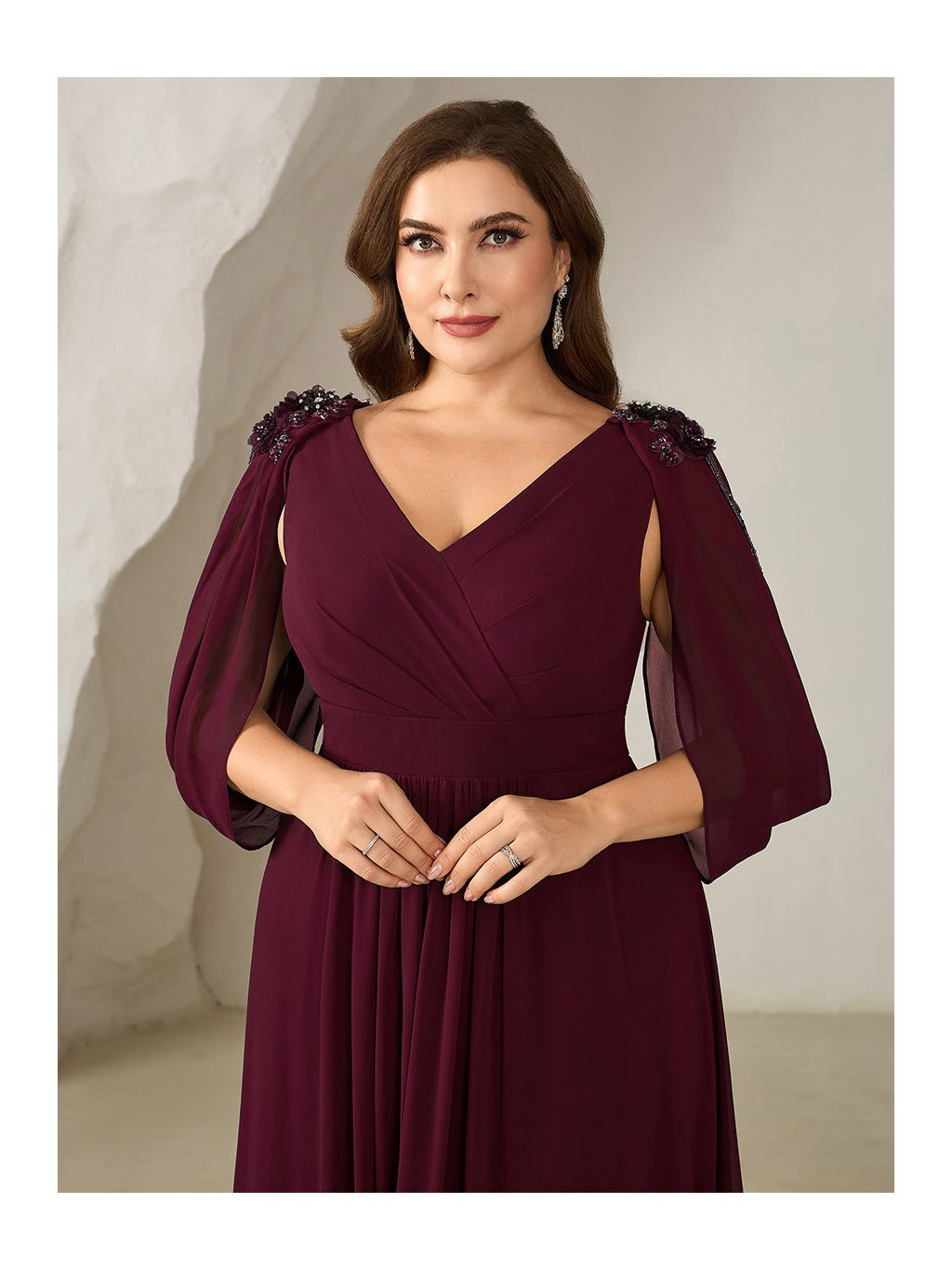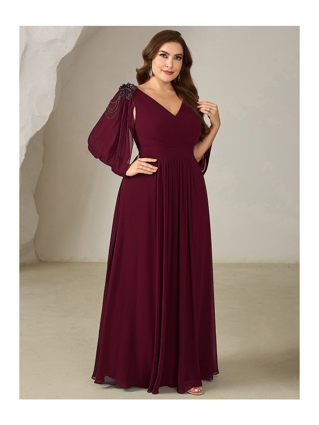 Tyto vínové dlouhé společenské šaty Vás zaujmou na první pohled svou nadčasovou elegancí a ženským střihem. Výstřih do V zvýrazňuje dekolt a jemně řasený živůtek a zvýrazněný pas vytvářejí krásnou siluetu. Lehký šifonový materiál dodává šatům vzdušnost a ladný pohyb při každém kroku. Výrazným detailem jsou elegantní rukávy s jemným zdobením na ramenou, které dodávají modelu slavnostní a sofistikovaný vzhled. Šaty jsou ideální volbou na plesy, svatby, galavečery.