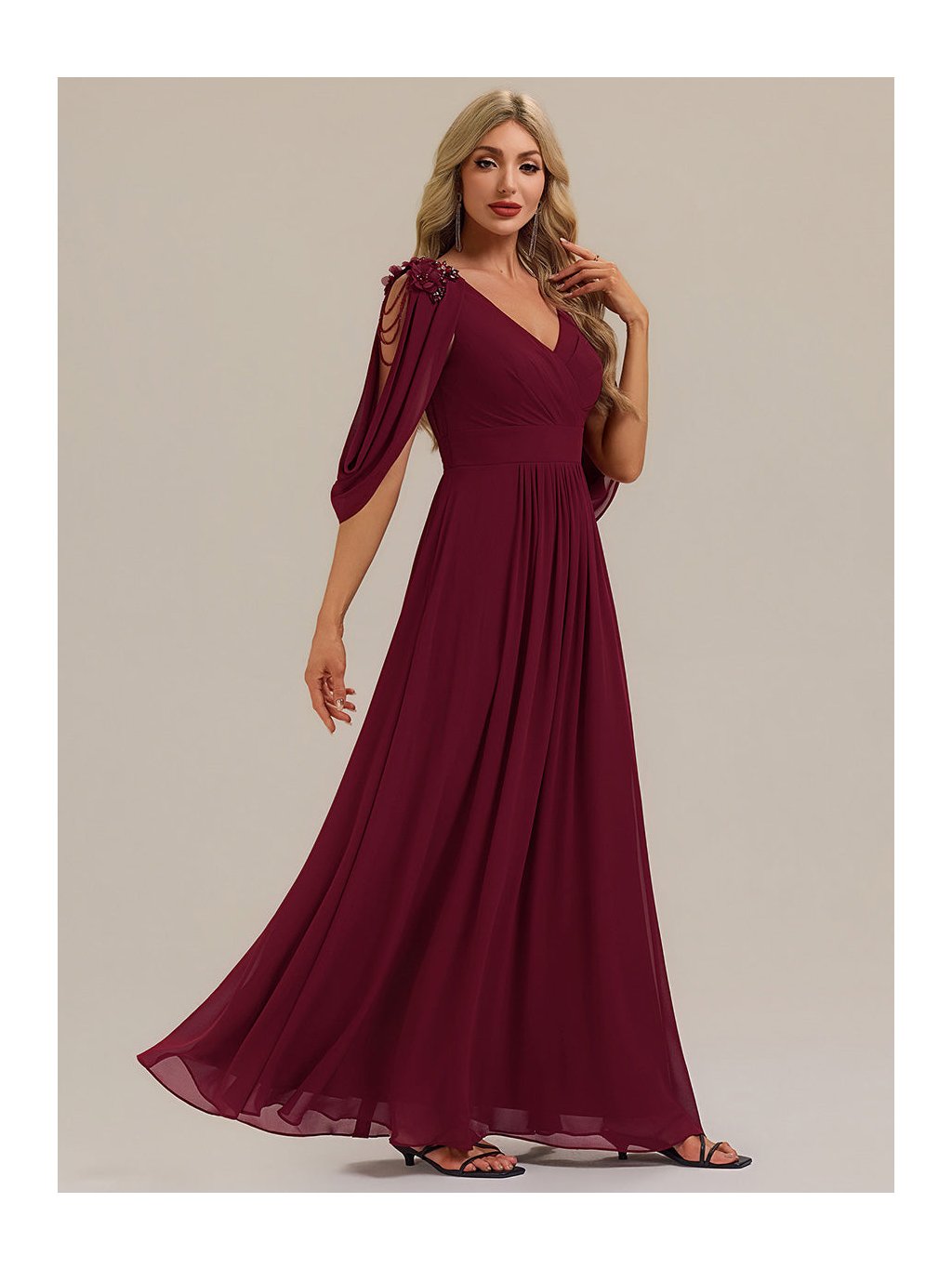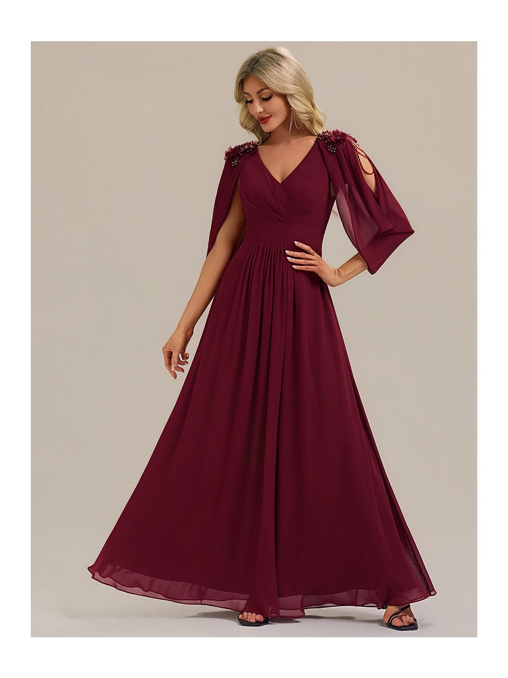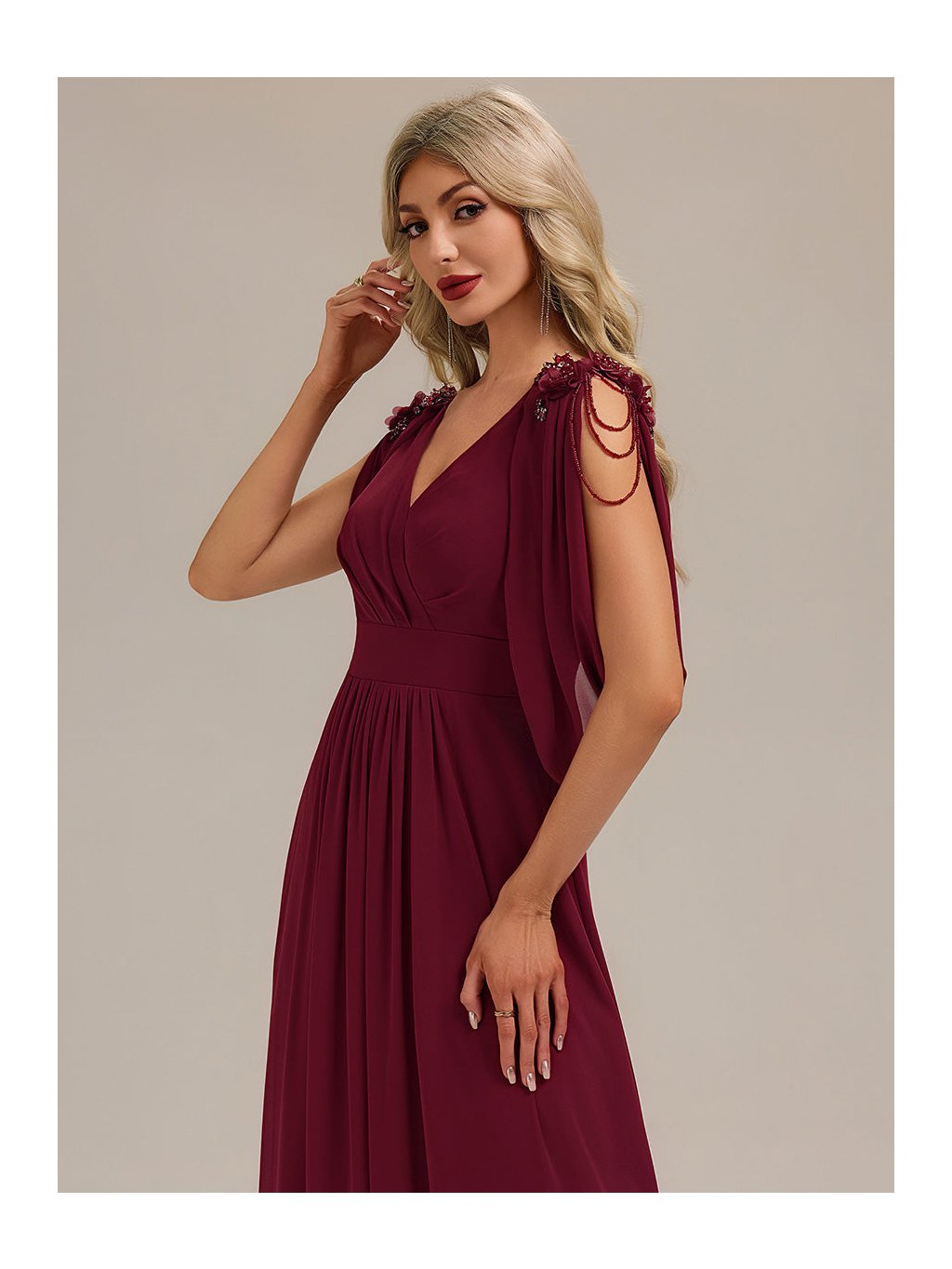 Tyto vínové dlouhé společenské šaty Vás zaujmou na první pohled svou nadčasovou elegancí a ženským střihem. Výstřih do V zvýrazňuje dekolt a jemně řasený živůtek a zvýrazněný pas vytvářejí krásnou siluetu. Lehký šifonový materiál dodává šatům vzdušnost a ladný pohyb při každém kroku. Výrazným detailem jsou elegantní rukávy s jemným zdobením na ramenou, které dodávají modelu slavnostní a sofistikovaný vzhled. Šaty jsou ideální volbou na plesy, svatby, galavečery.