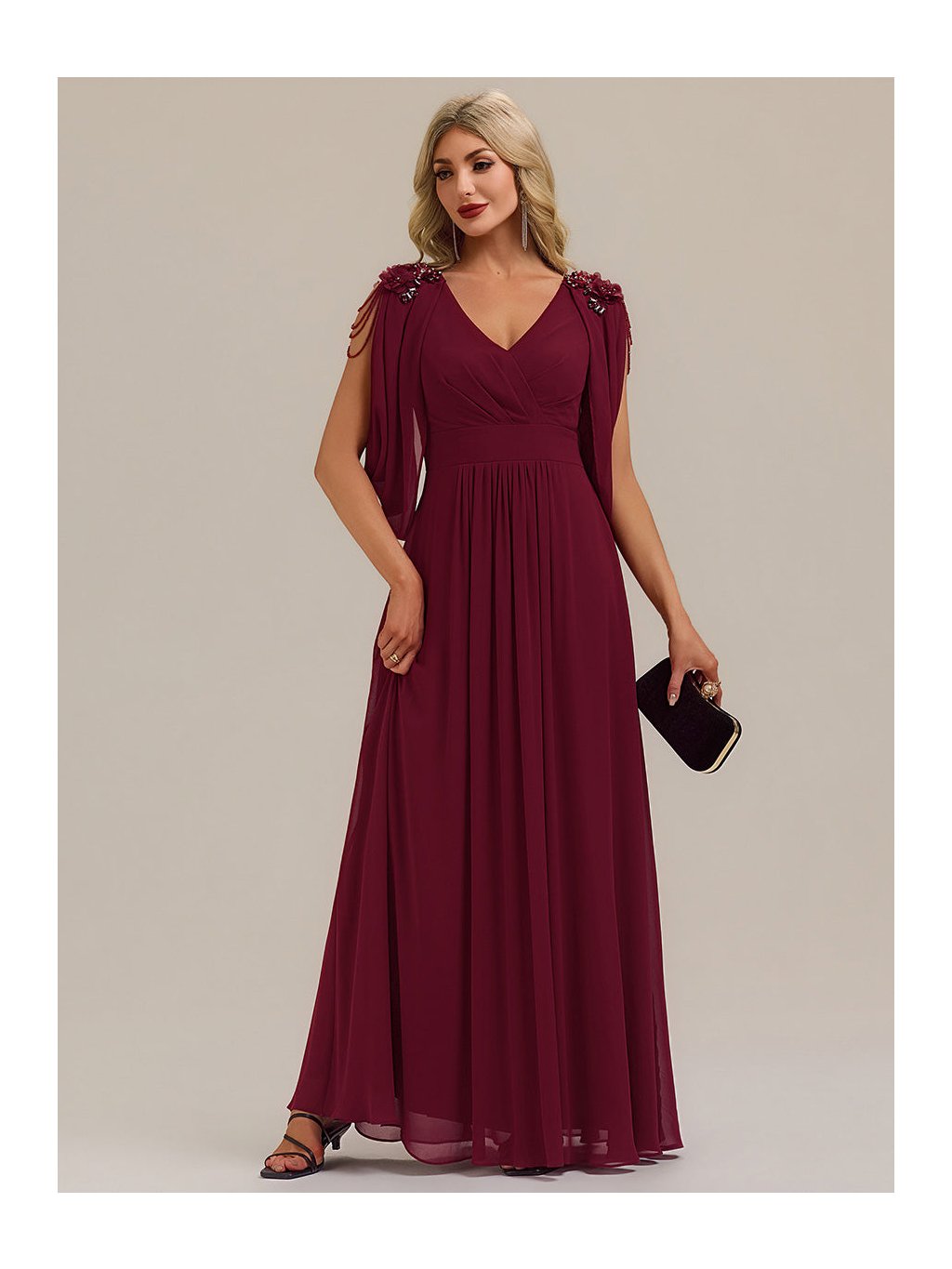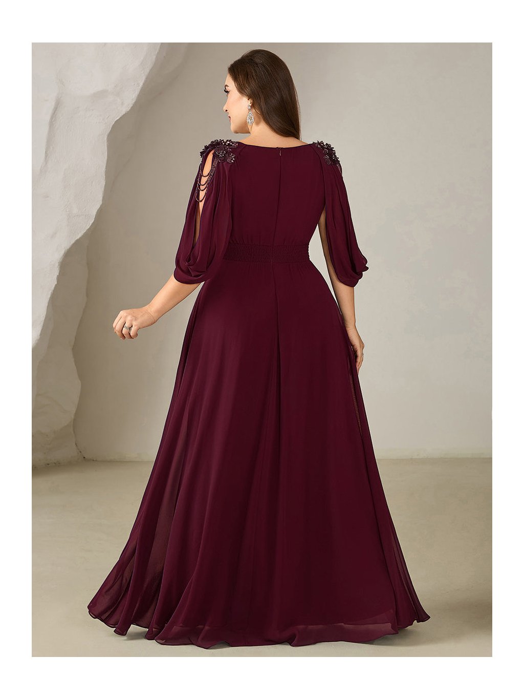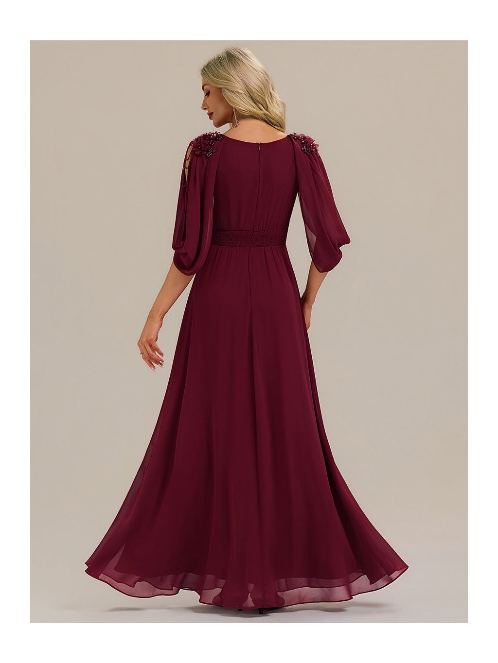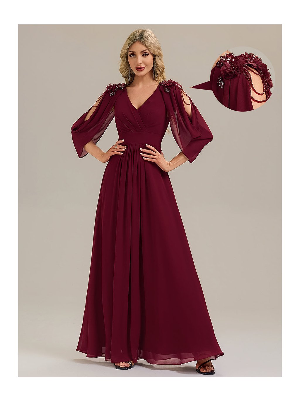 Tyto vínové dlouhé společenské šaty Vás zaujmou na první pohled svou nadčasovou elegancí a ženským střihem. Výstřih do V zvýrazňuje dekolt a jemně řasený živůtek a zvýrazněný pas vytvářejí krásnou siluetu. Lehký šifonový materiál dodává šatům vzdušnost a ladný pohyb při každém kroku. Výrazným detailem jsou elegantní rukávy s jemným zdobením na ramenou, které dodávají modelu slavnostní a sofistikovaný vzhled. Šaty jsou ideální volbou na plesy, svatby, galavečery.