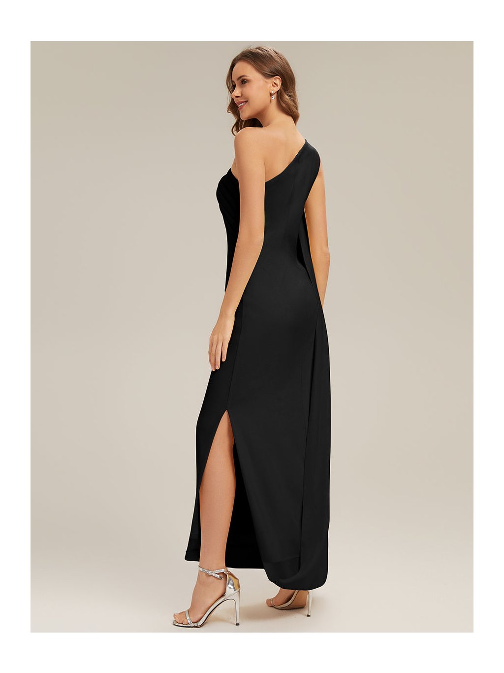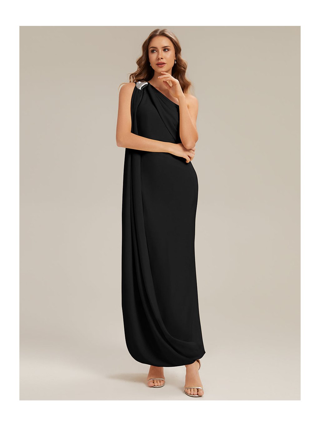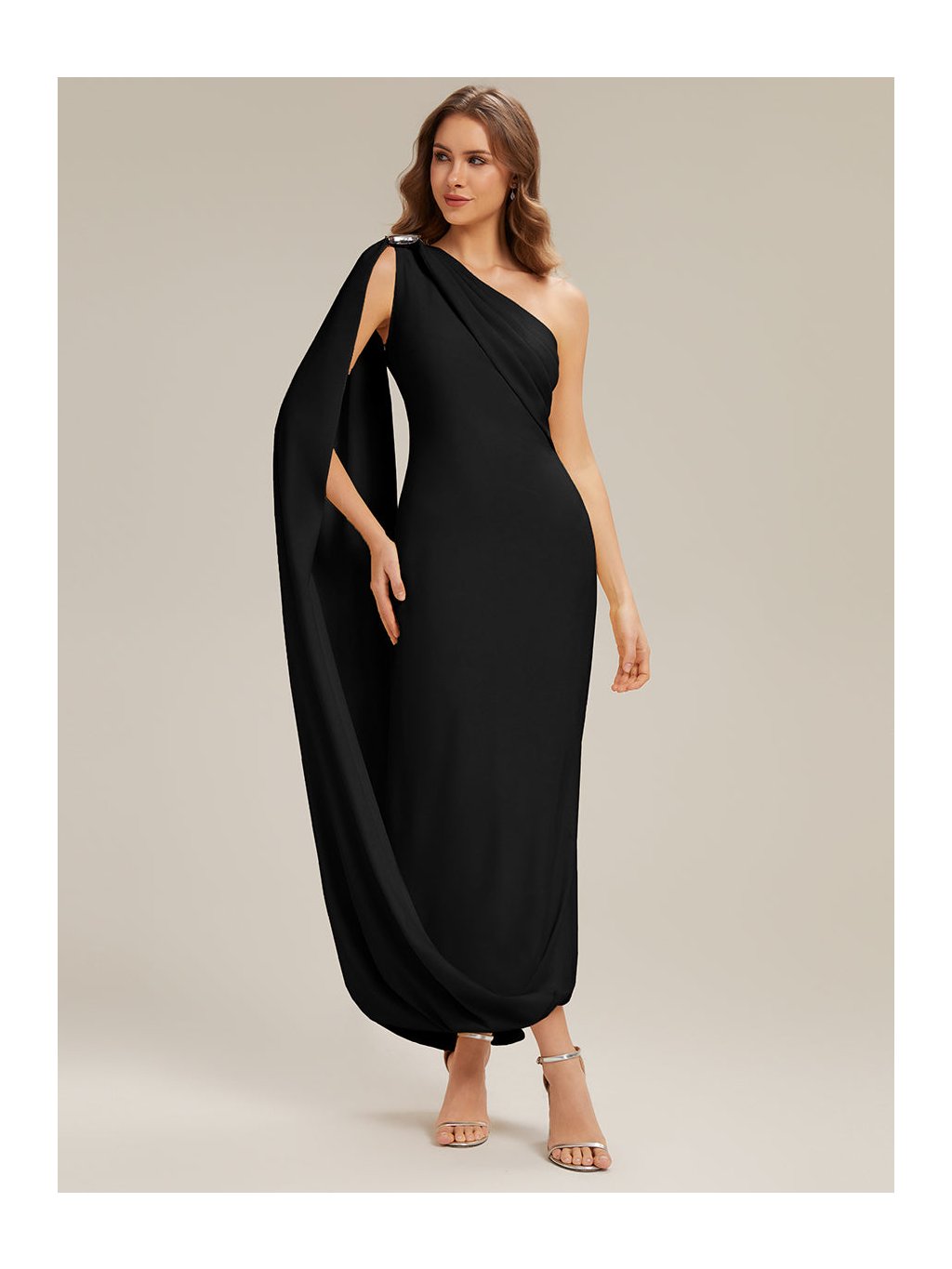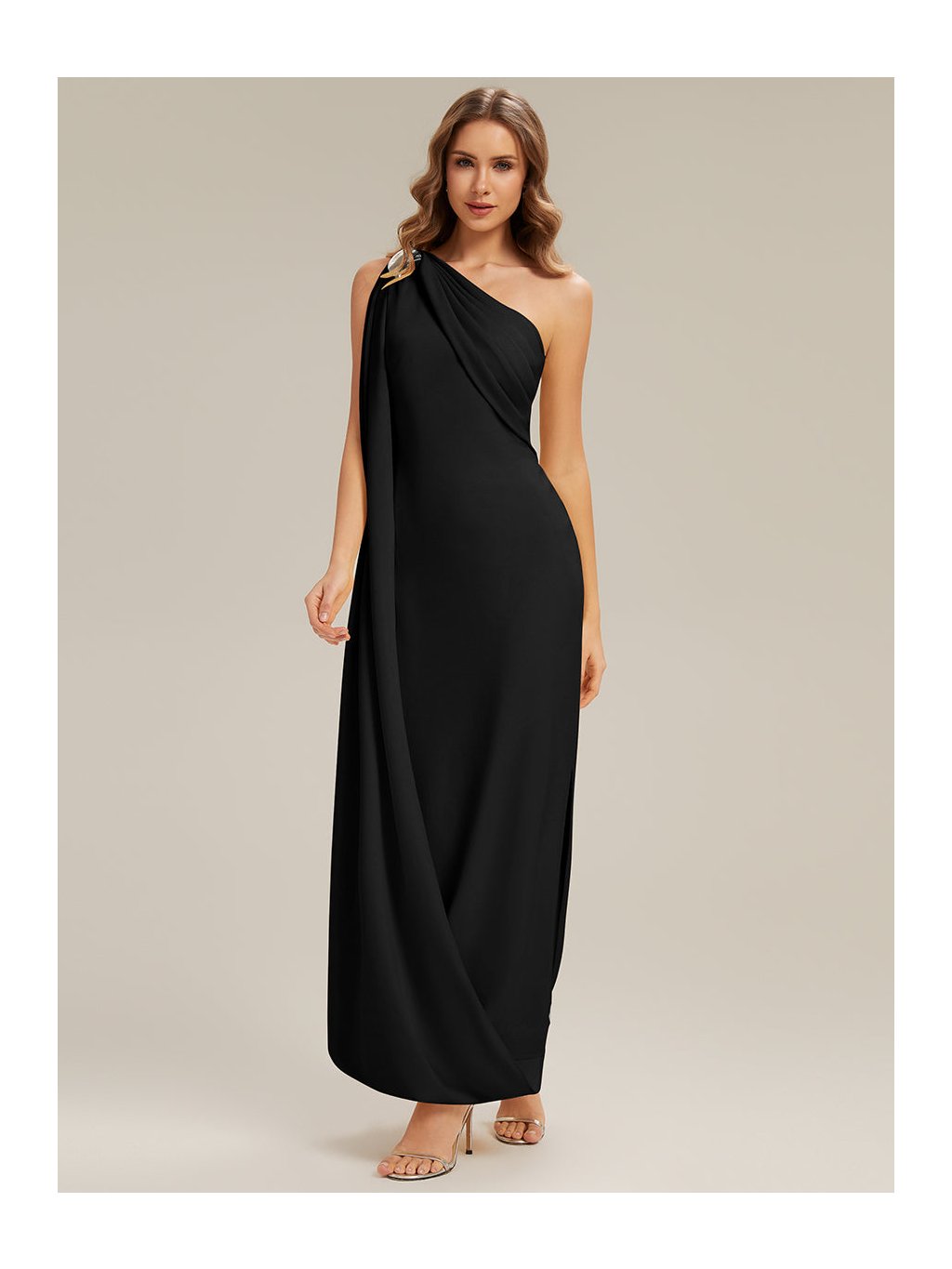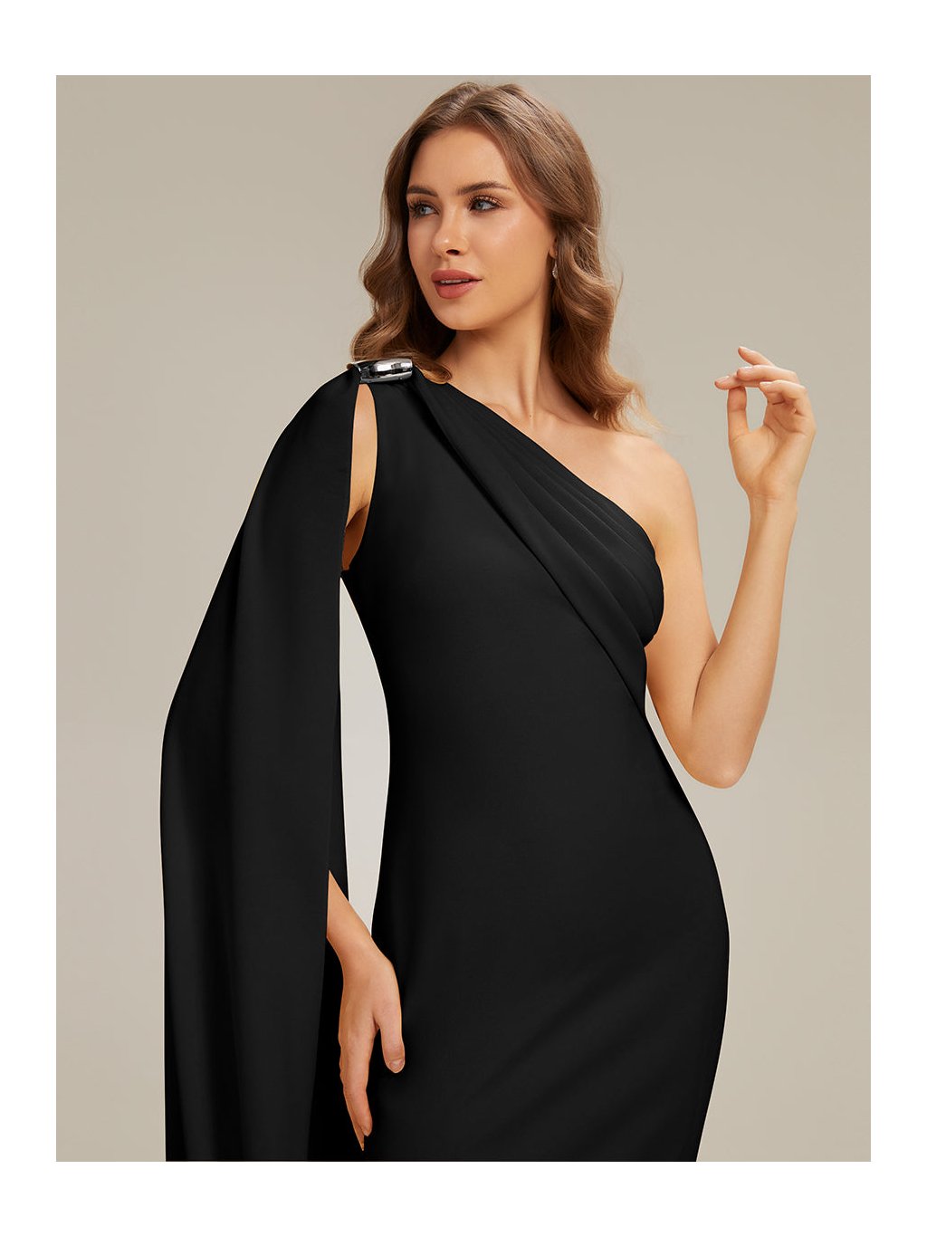 Model, který si získá pozornost hned při prvním kroku do místnosti. Tyto dlouhé černé šaty na jedno rameno pracují s čistou linií, asymetrií a efektním splývavým panelem, který vytváří dojem lehkého pláště. Látka krásně obepíná postavu a nechává vyniknout ženské křivky, rozparek na sukni přináší svůdný detail i pohodlí při chůzi. Ideální volba na ples, galavečer a další slavnostní události, kde chcete zazářit sebevědomím a stylem.