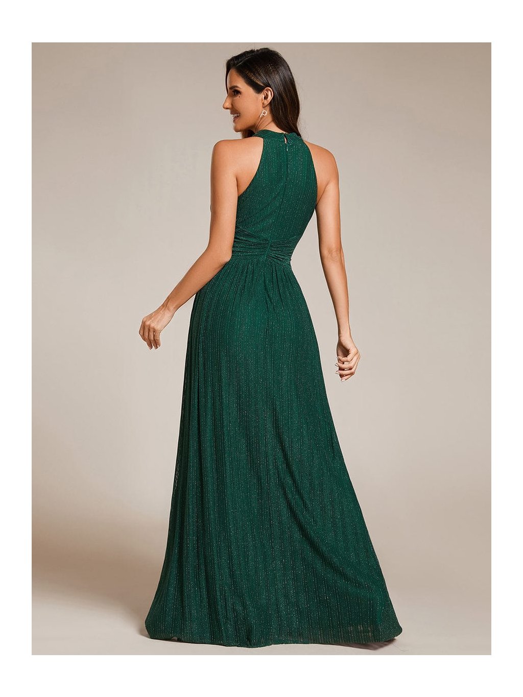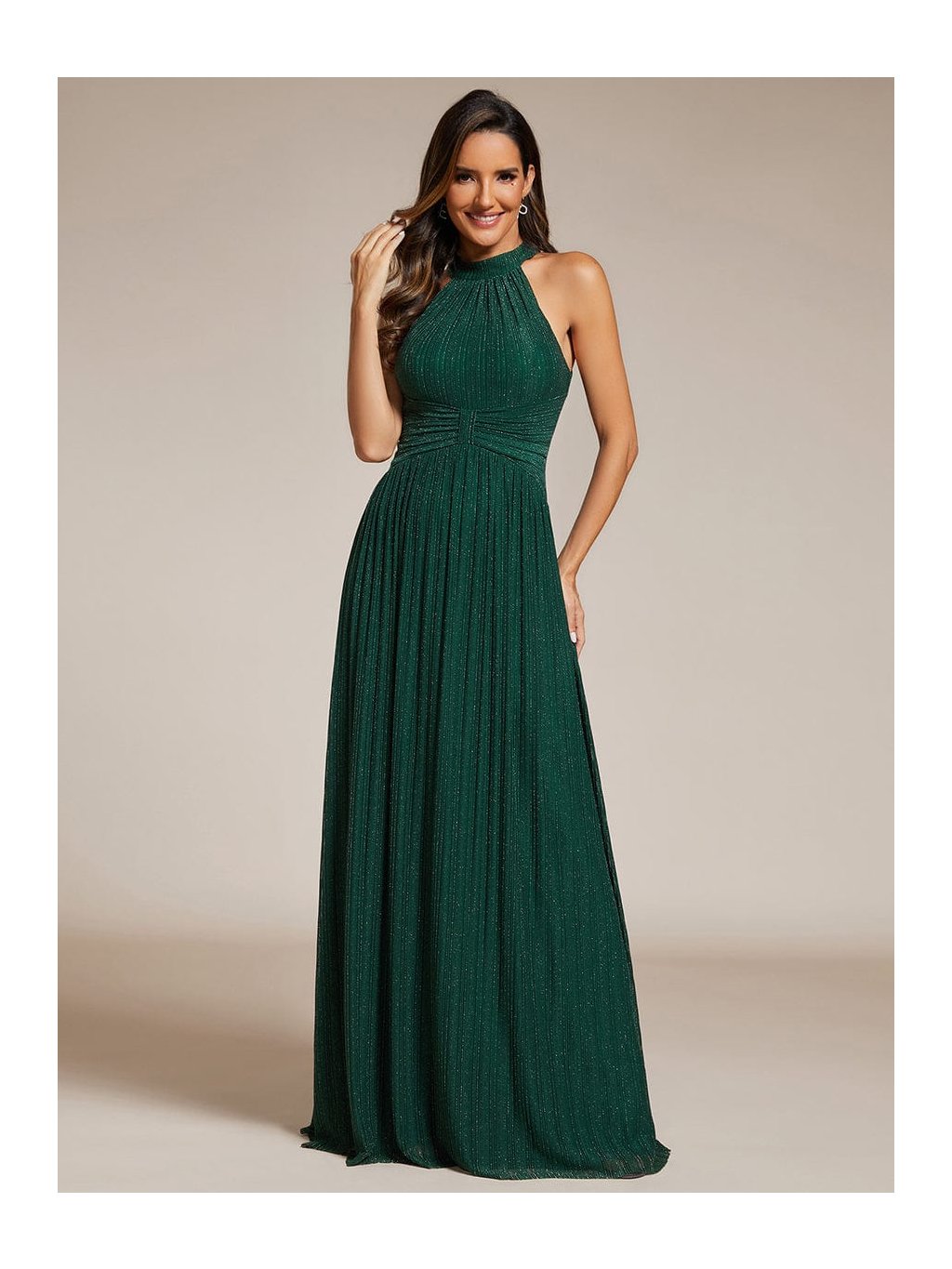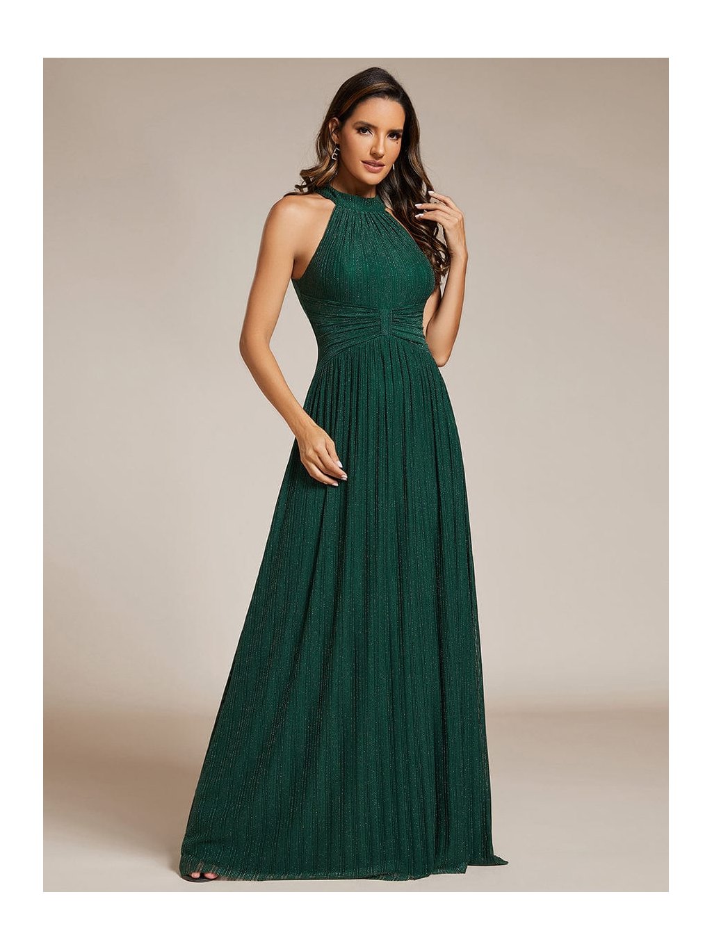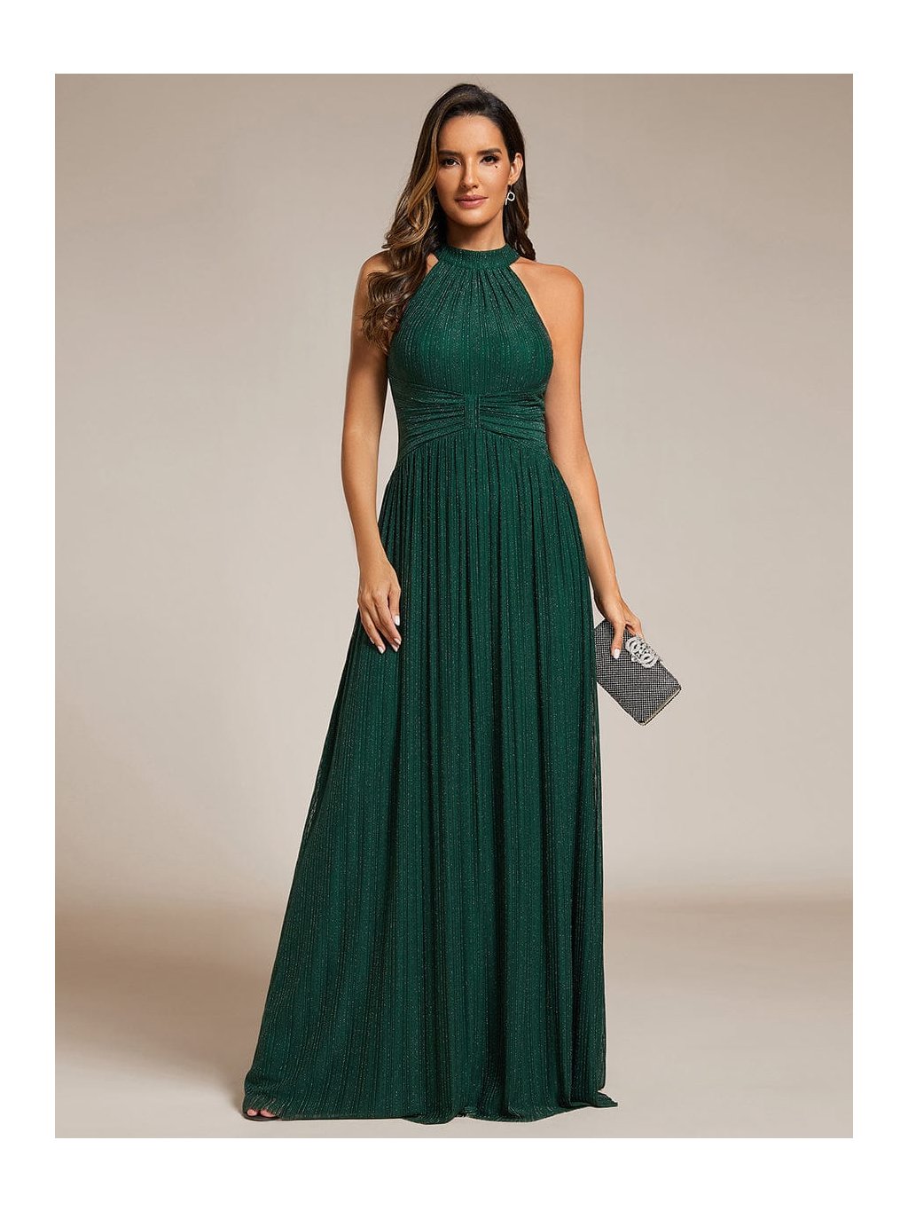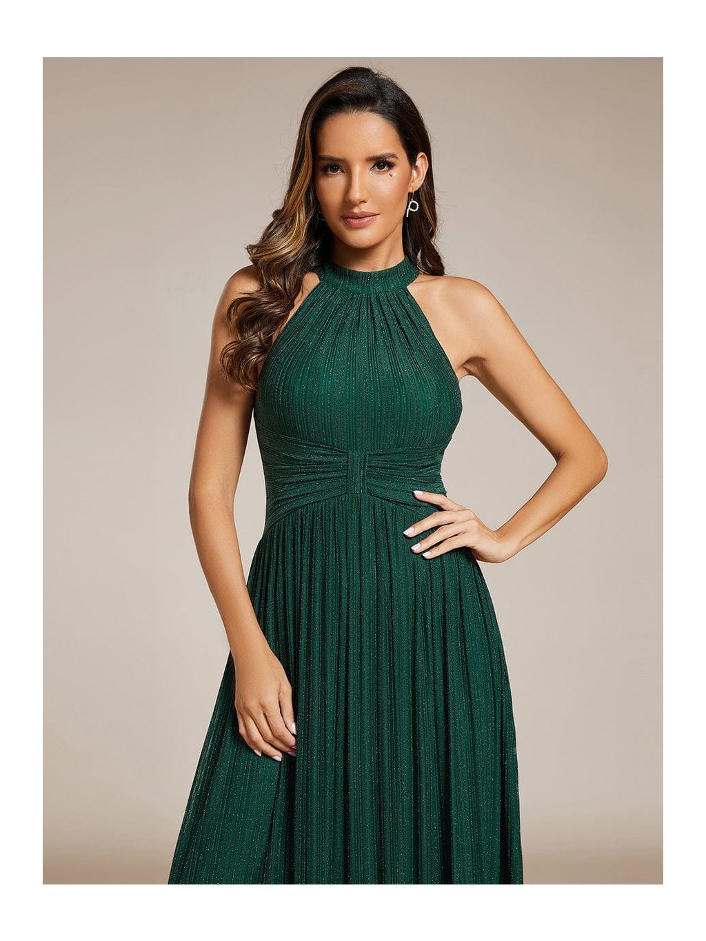 Pozvedněte svůj večerní styl s našimi třpytivými formálními šaty s halter výstřihem a plisovaným designem, které se skvěle hodí na galavečery a plesy. Tyto šaty vytváří okouzlující siluetu a opticky prodlužují postavu díky lehce výše vsazené dlouhé sukni ve tvaru A. Třpytivá látka se pod světlem leskne, což šaty činí ideálními pro formální příležitosti.