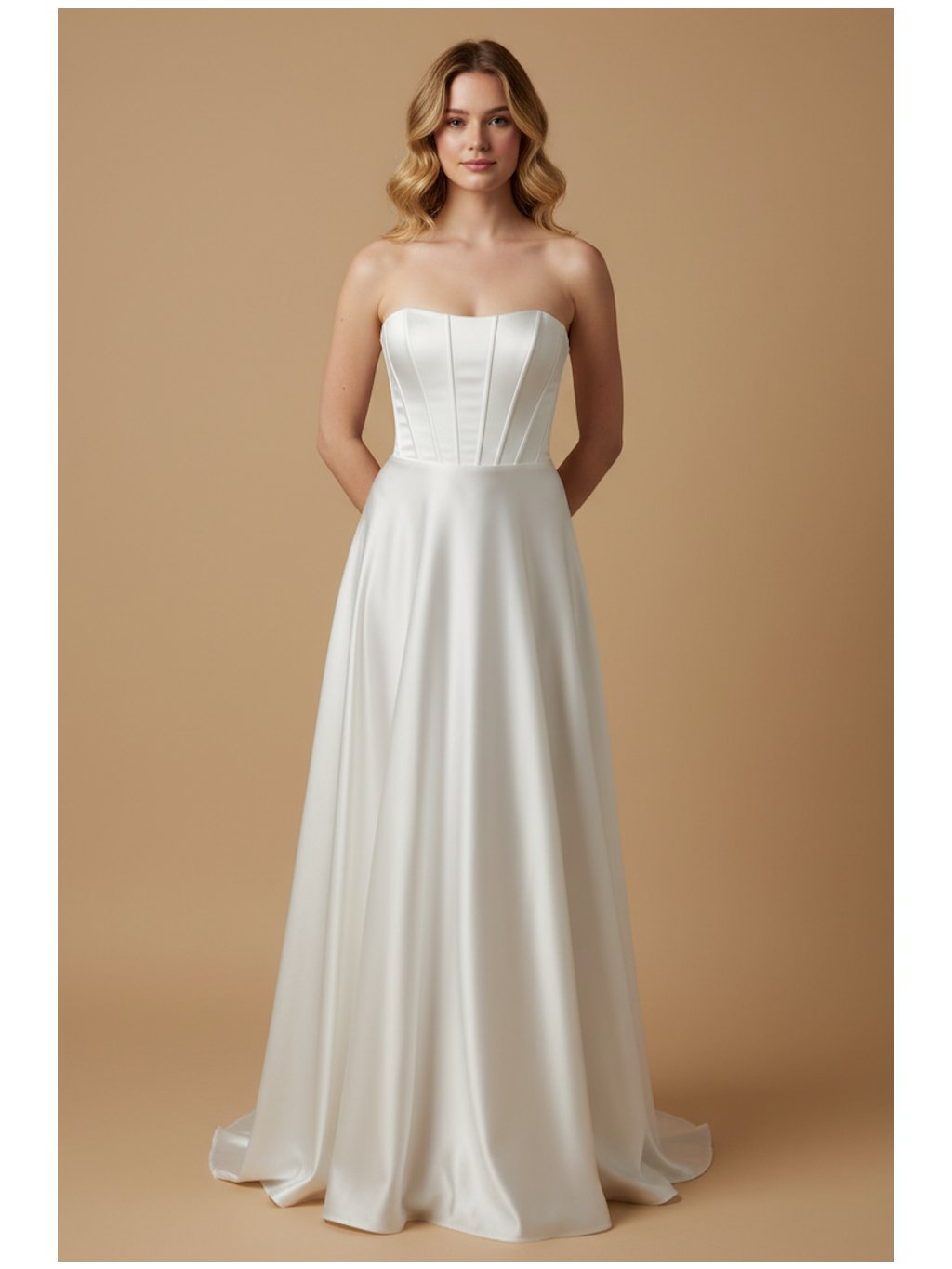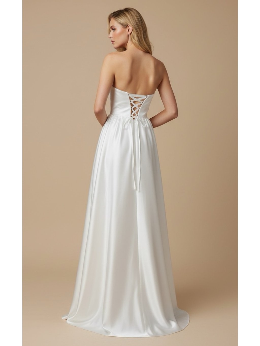 Tyto dlouhé bílé šaty stojí na jednoduchosti, která působí velmi luxusně. Čistá barva a hladká silueta vytvářejí model, který je elegantní, ale zároveň moderní. Korzetový živůtek s jemnými vertikálními švy krásně tvaruje postavu a zvýrazňuje pas. Díky tomu šaty drží perfektní linii. Zadní šněrování navíc umožňuje přesné přizpůsobení podle postavy. Sukně je volná a splývavá, takže při chůzi vytváří přirozený pohyb látky. Je to minimalistický model, který se skvěle hodí pro nevěsty, které se řídí heslem "v jednoduchosti je krása."