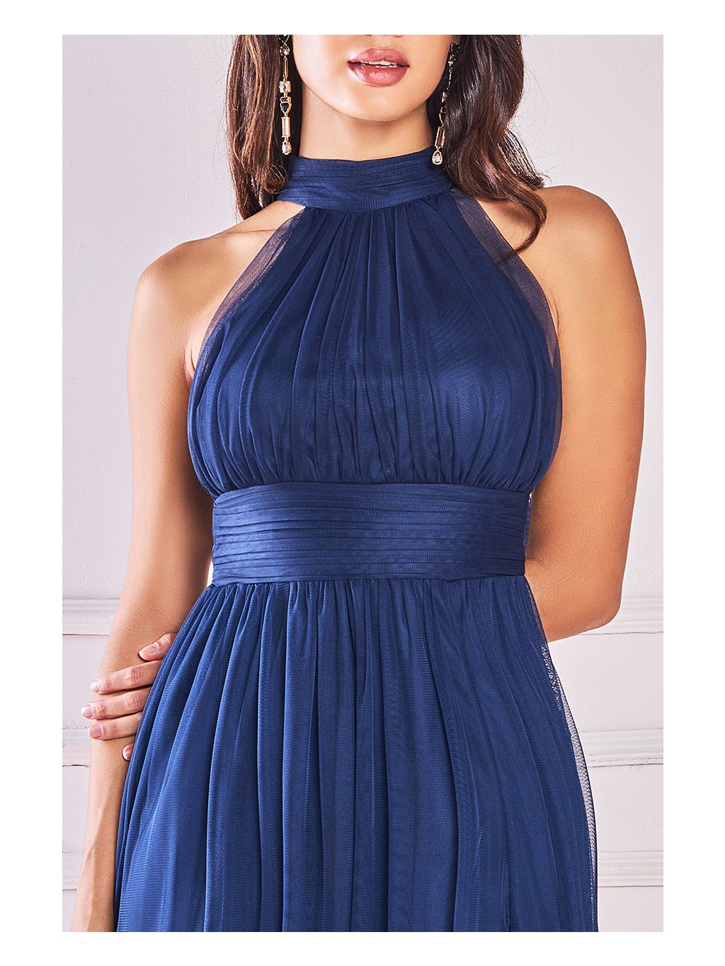 Tyto nádherné námořnicky modré šaty Vás okouzlí svým vznešeným střihovým řešením i lehkostí materiálu. Plisovaný živůtek s elegantním vysokým límečkem krásně prodlouží siluetu a dodává šatům nádech luxusu. Lehoučká tylová sukně se při chůzi nádherně vlní a hluboký rozparek poskytuje atraktivní, ale stále vkusné odhalení nohou. Na zádech je navíc zavazování na mašli. Díky vzdušnému materiálu se v šatech budete cítit pohodlně celý večer. Perfektní volba na svatbu pro hosty, na plesy i jiné slavnostní příležitosti.