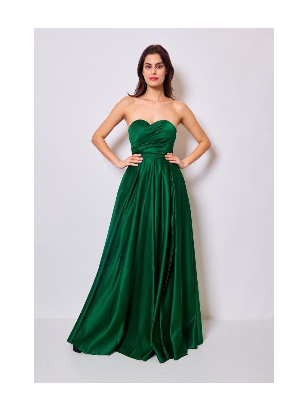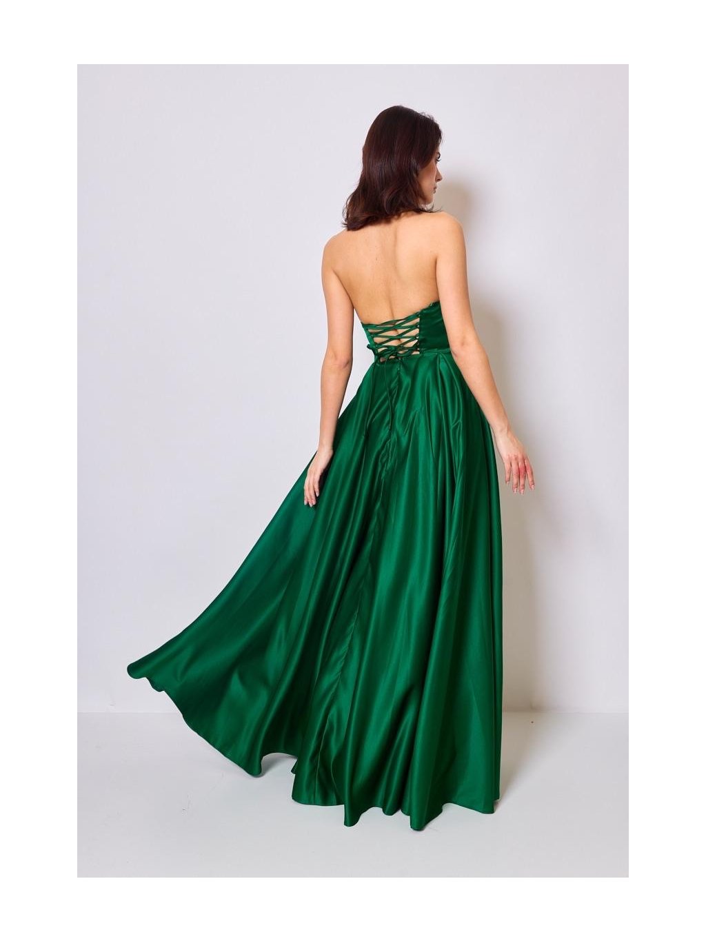 Tyto smaragdově zelené saténové šaty působí výrazně a elegantně zároveň. Hladký materiál se při pohybu jemně leskne a vytváří dojem plynulosti. Živůtek bez ramínek zvýrazní horní část postavy a rozparek vpředu dodává modelu lehkost a špetku odvážnosti. Šněrování na zádech nejen krásně vypadá, ale umožní šaty přizpůsobit postavě přesně podle potřeby. Šaty budou vypadat skvěle jak na maturitním večírku, tak na slavnostní večeři nebo červeném koberci.