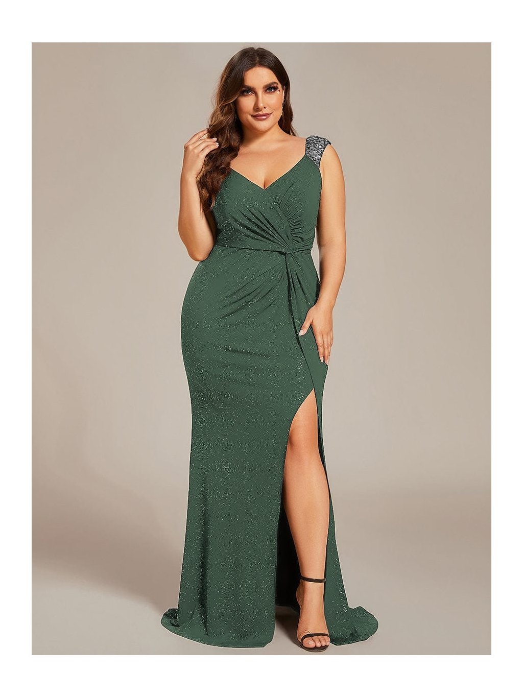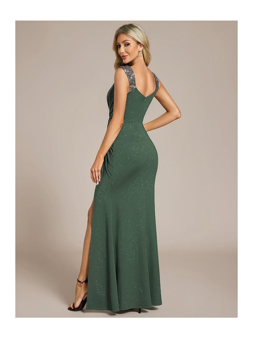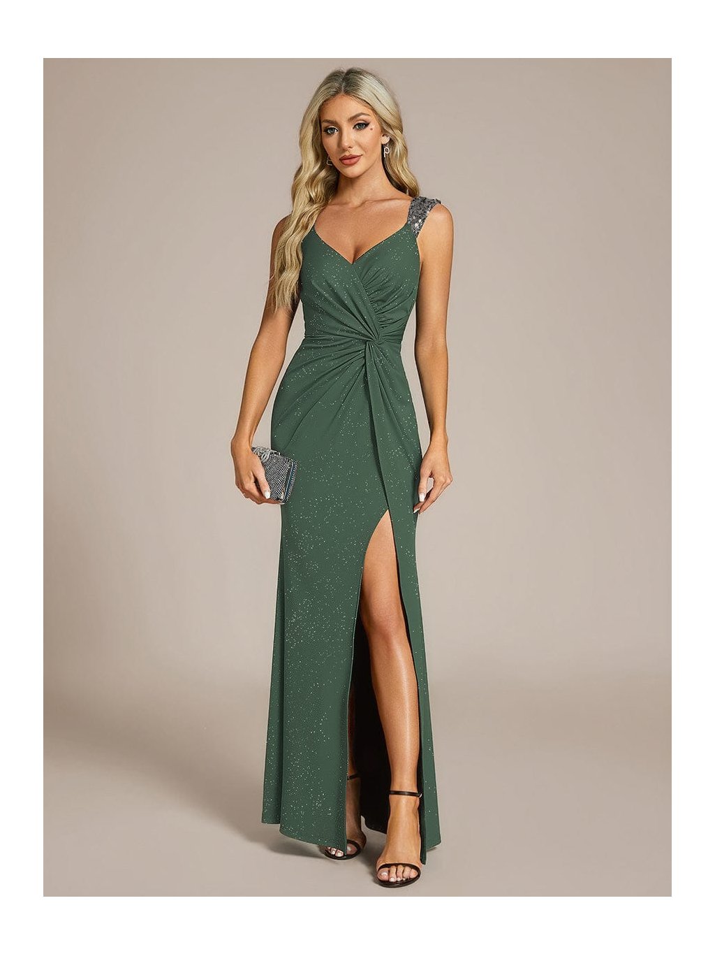 Tyto zelenkavé šaty spojují moderní střih a efekt třpytivého materiálu, který krásně pracuje se světlem. Flitrová ramínka působí jako šperk samy o sobě a přirozeně vedou pohled k jemně řasenému živůtku. Šaty se v pase lehce stahují, čímž vytvářejí lichotivý tvar a přecházejí do splývavé sukně s výrazným rozparkem, který nechá vyniknout dlouhým nohám a elegantním podpatkům. Model je ideální na plesy, večerní akce i svatby.