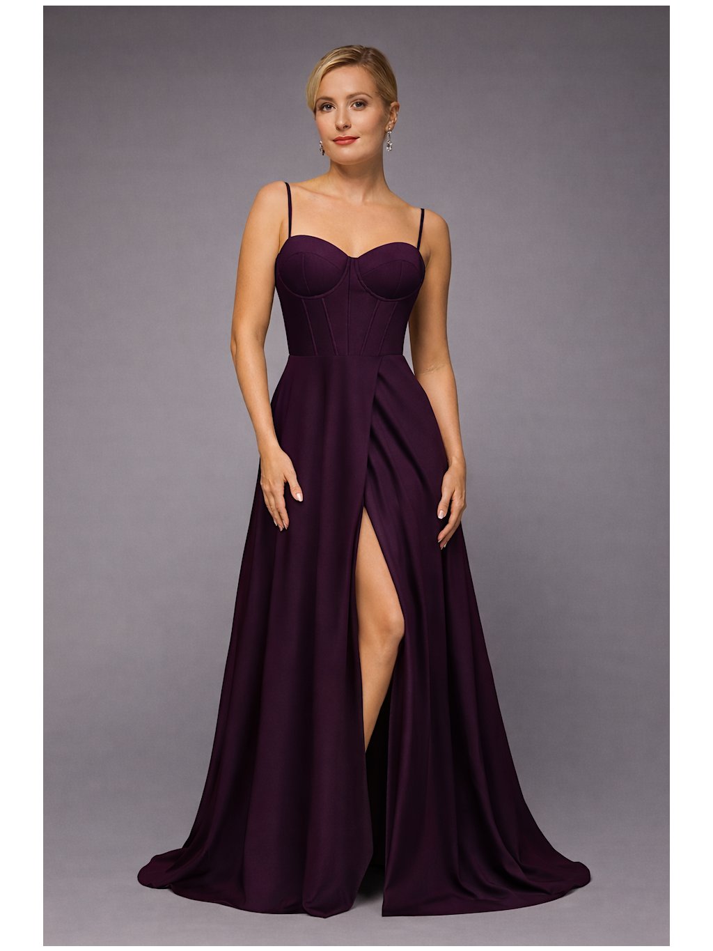 Fialové šaty s rozparkem a korzetovým střihem