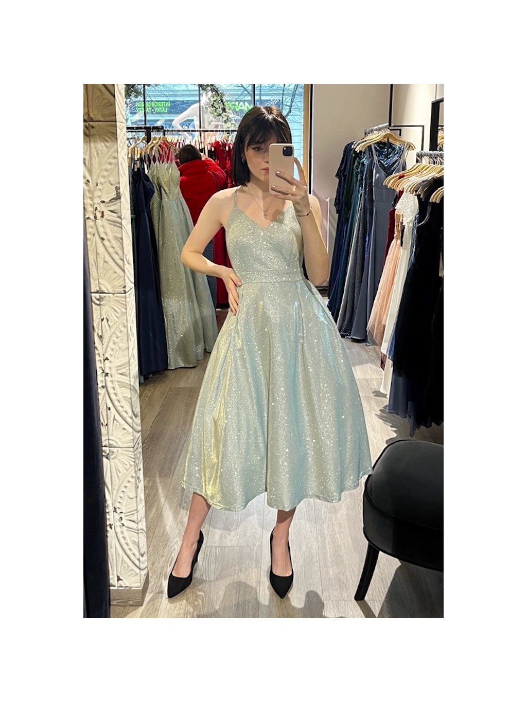 Metalické pistáciové šaty v midi délce s lehce nabranou