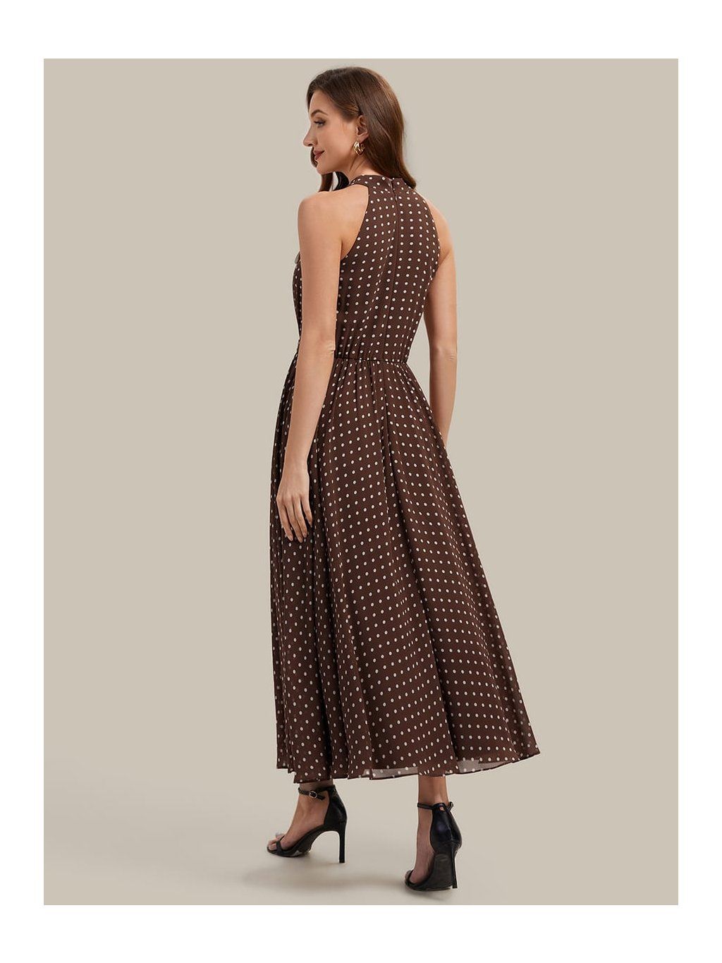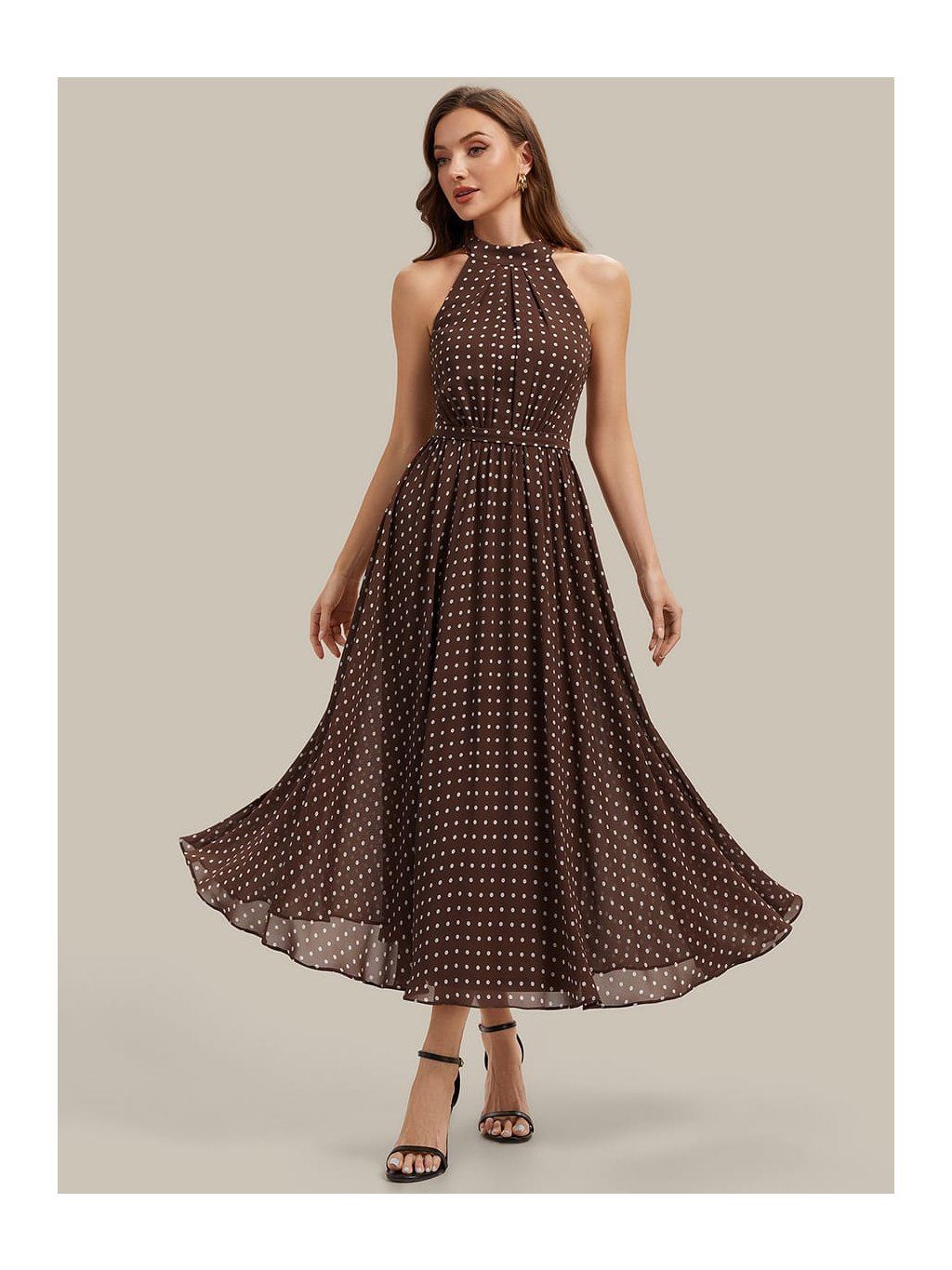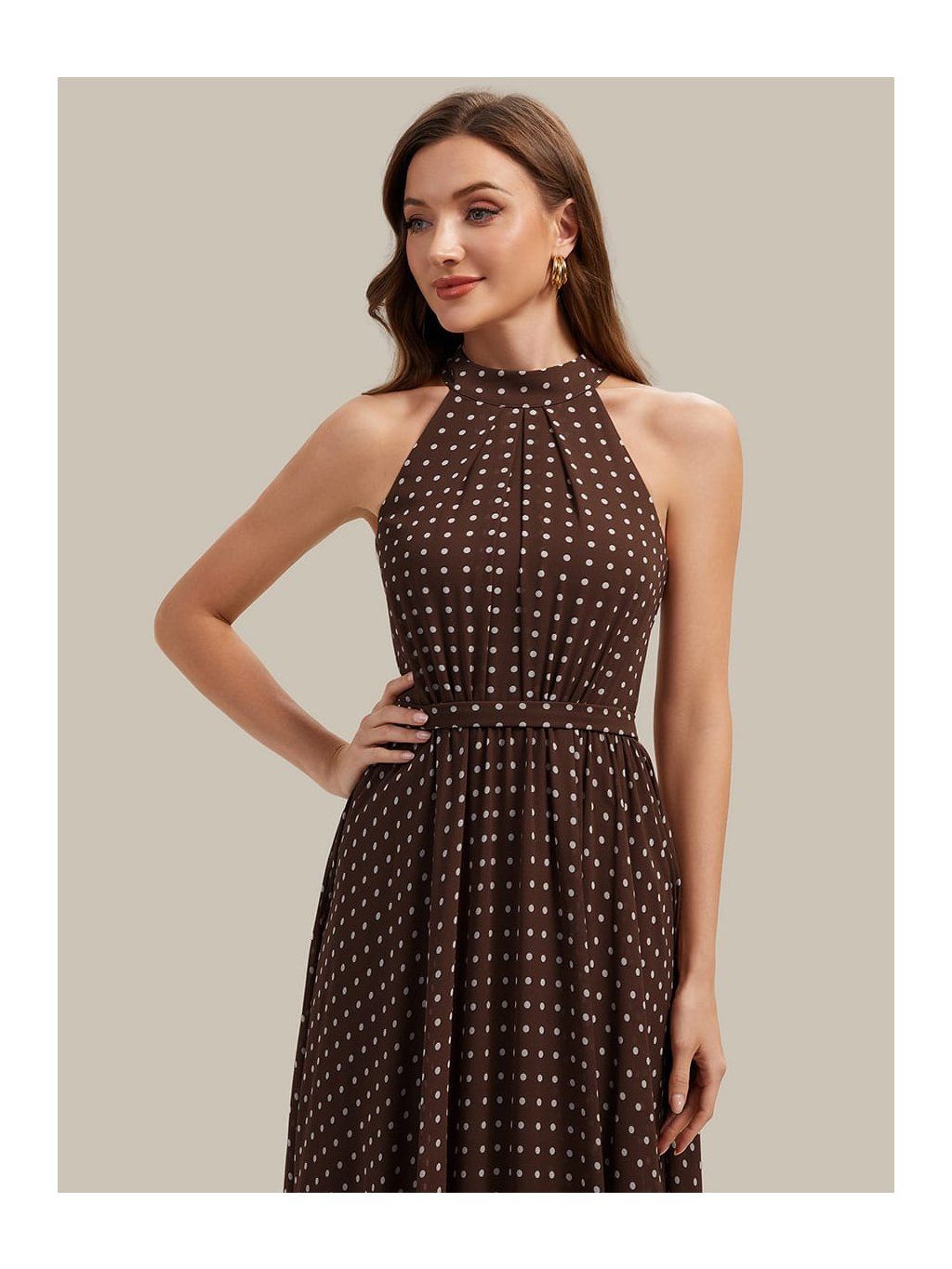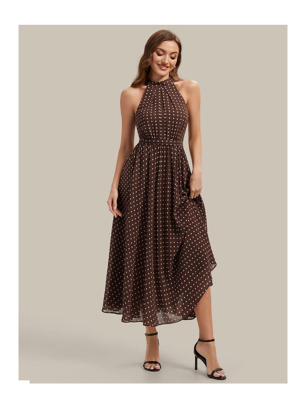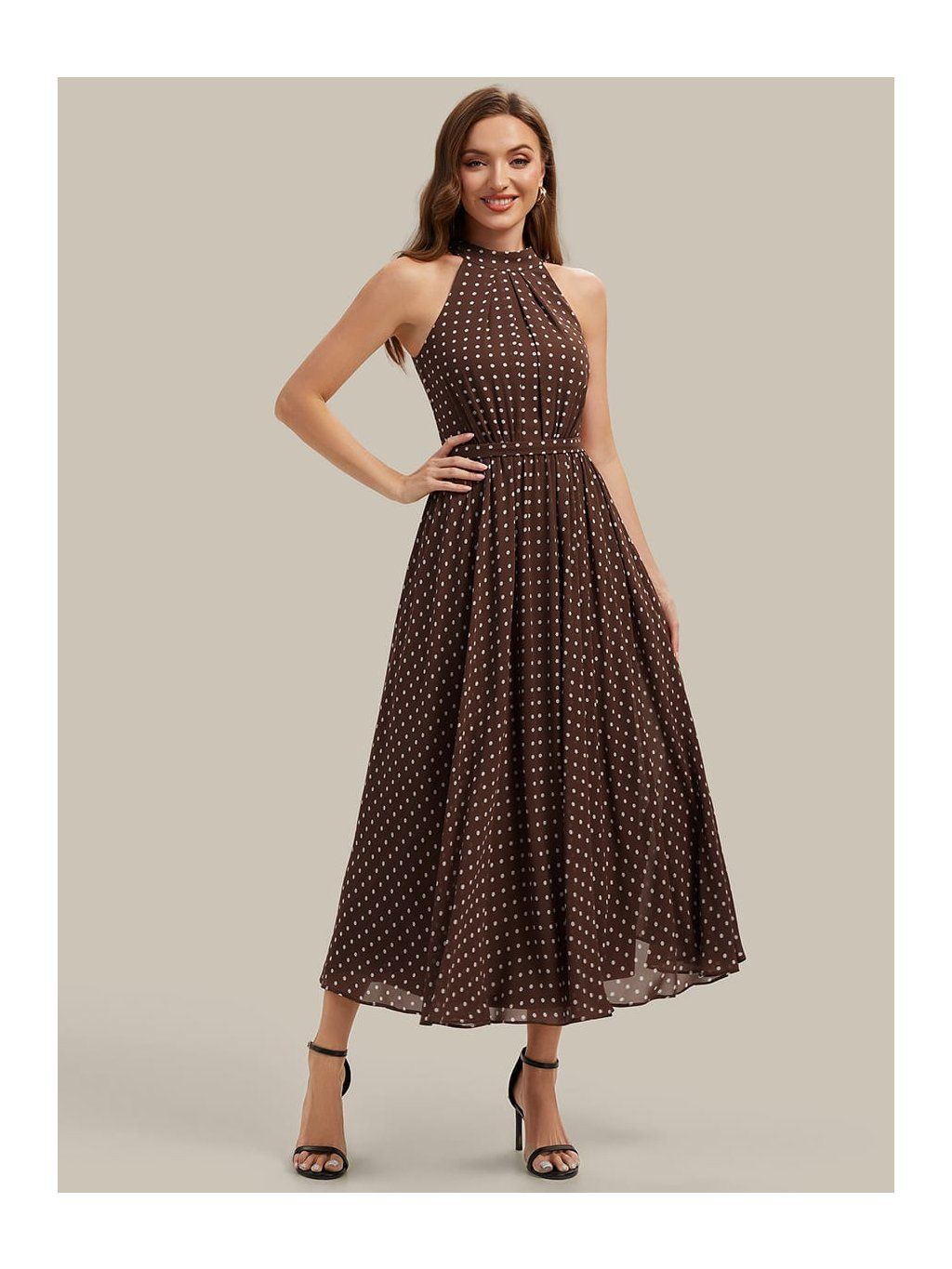 Tyto společenské šaty zaujmou hlavně vzorem. Kombinace hnědého podkladu a drobného puntíku působí uvolněněji než klasické jednobarevné modely, takže se dobře hodí na denní akce nebo méně formální příležitosti. Horní část je řešená halter výstřihem, který se zapíná za krkem a nechává vyniknout ramena. Látka je u krku jemně nařasená a volně navazuje na trup. Pas je lehce stažený úzkým páskem, který vytváří přirozené oddělení živůtku a sukně. Ta je volnější, bez pevného tvarování, a díky šifonovému materiálu se při chůzi lehce pohybuje.