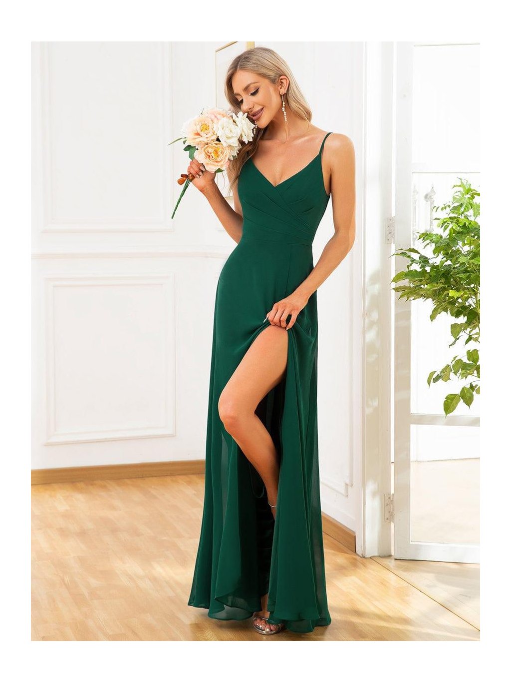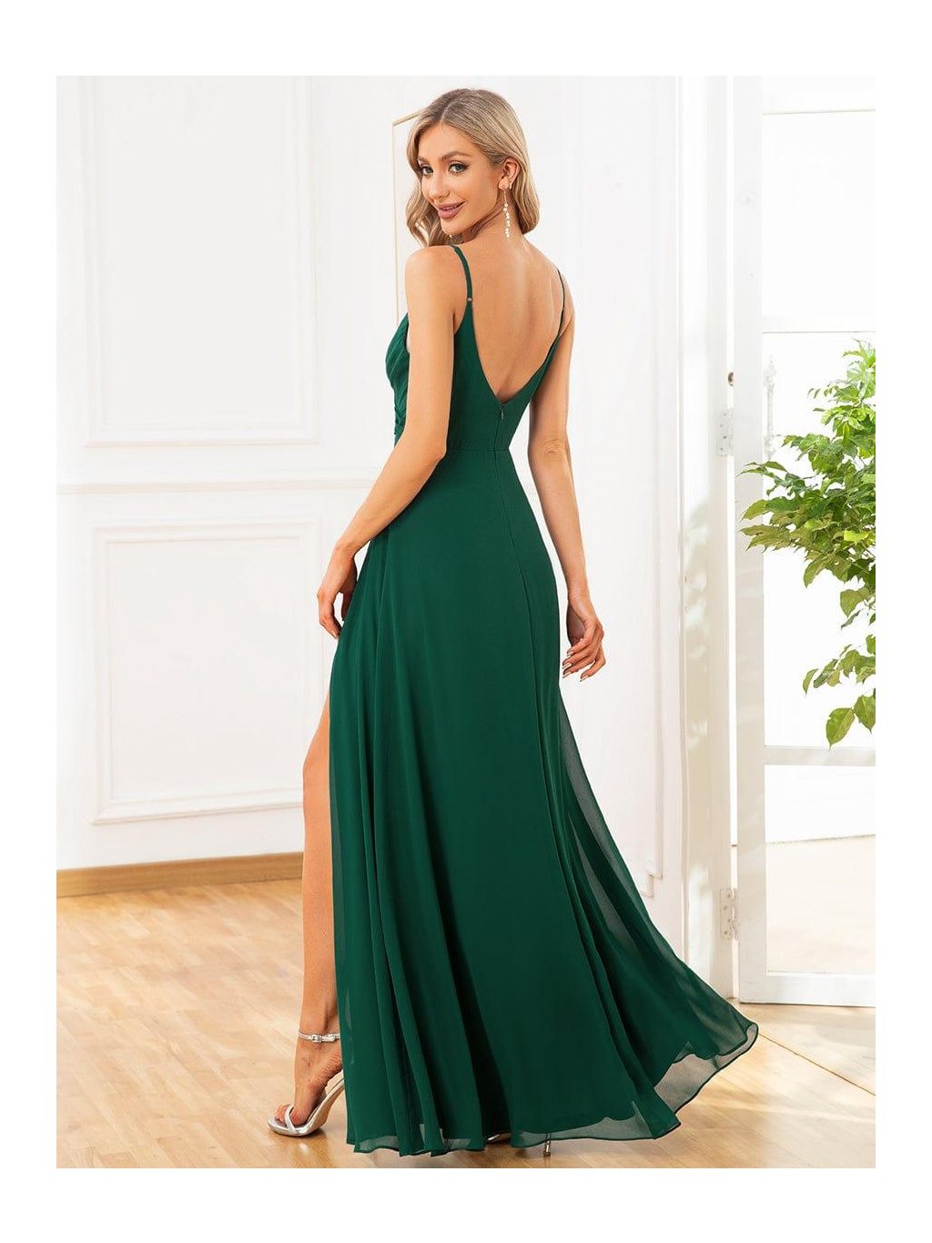 Tento model v hlubokém odstínu smaragdové zelené je sázkou na klasickou eleganci. Živůtek na tenká ramínka zaujme véčkovým výstřihem a jemným řasením, které krásně zvýrazní pas a dekolt. Sukně je ušita z lehkého šifonu, splývá až na zem a díky vysokému rozparku na straně dodává šatům šmrnc a umožňuje pohodlný pohyb při tanci. Záda jsou mírně vykrojená a zapínání zajišťuje skrytý zip. Krásná volba pro svatební družičky.