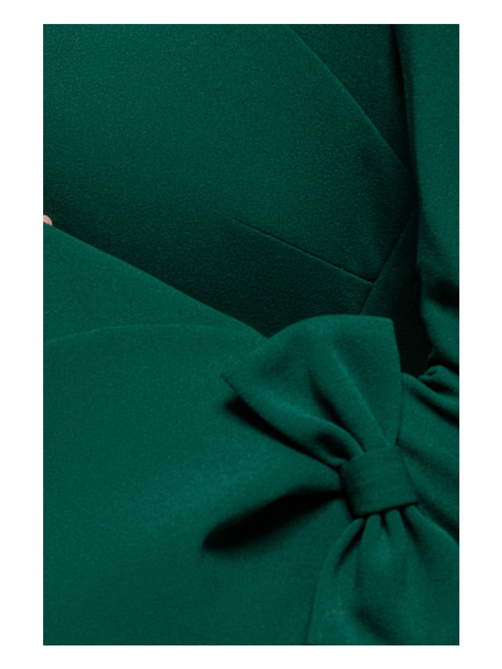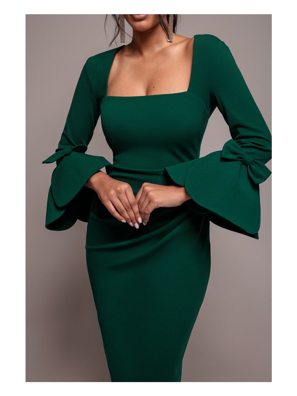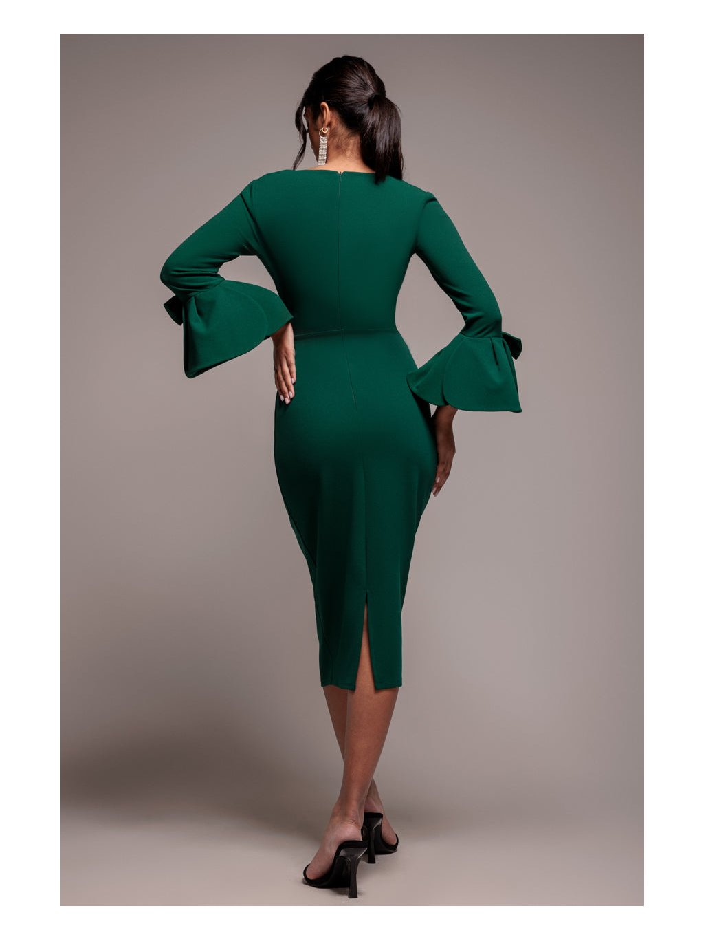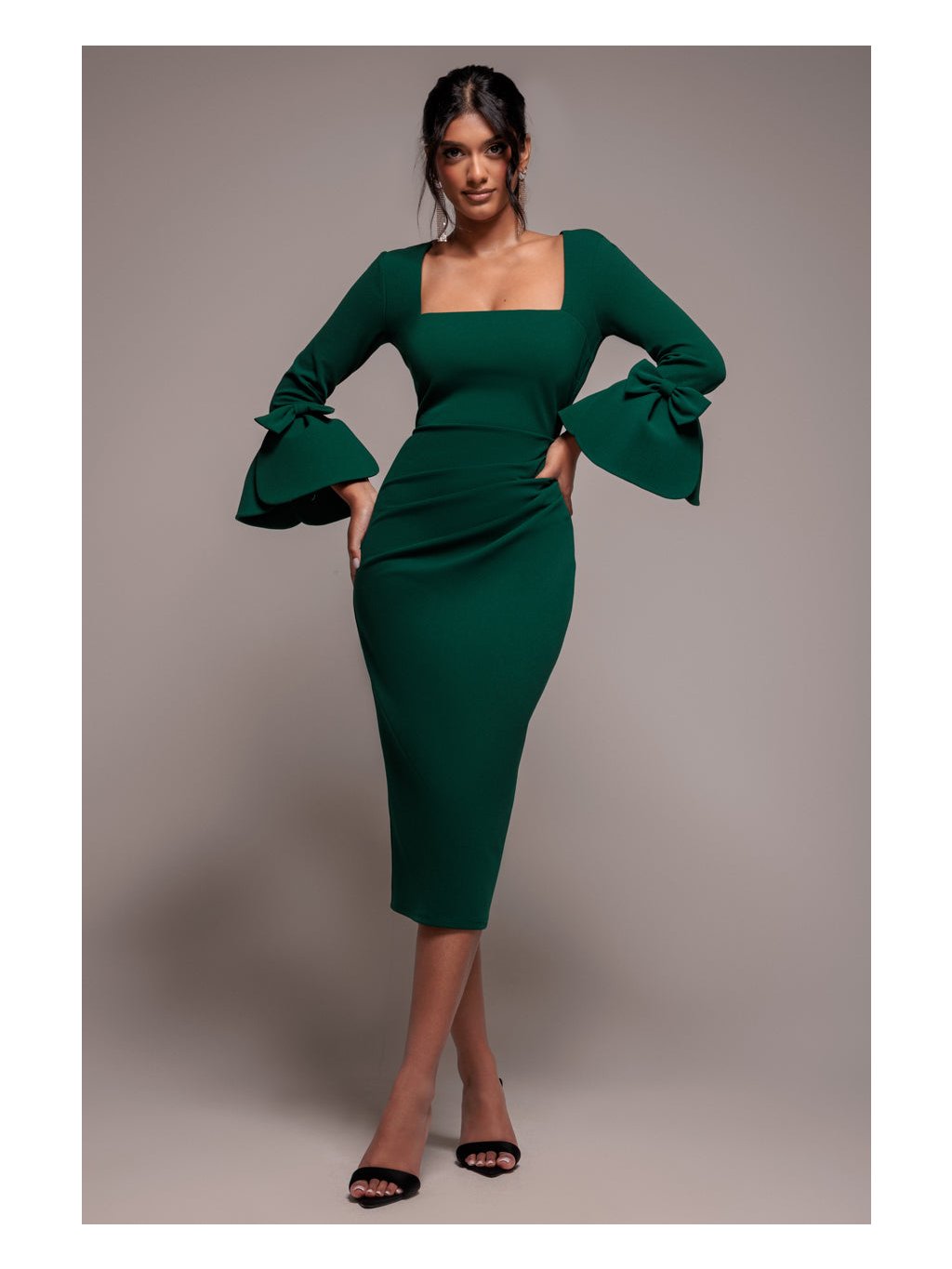 Smaragdově zelené midi šaty působí maximálně žensky a současně velmi sofistikovaně. Hranatý výstřih tvoří moderní nádech a dlouhé rukávy s výraznými volány a mašlemi se postarají o jedinečný detail, který okamžitě přitáhne pozornost. Přiléhavý střih s jemným řasením v oblasti pasu krásně modeluje postavu a vytváří elegantní siluetu. Šaty jsou ideální volbou ke štědrovečerní tabuli a ke stromečku, nebo také na večírky.