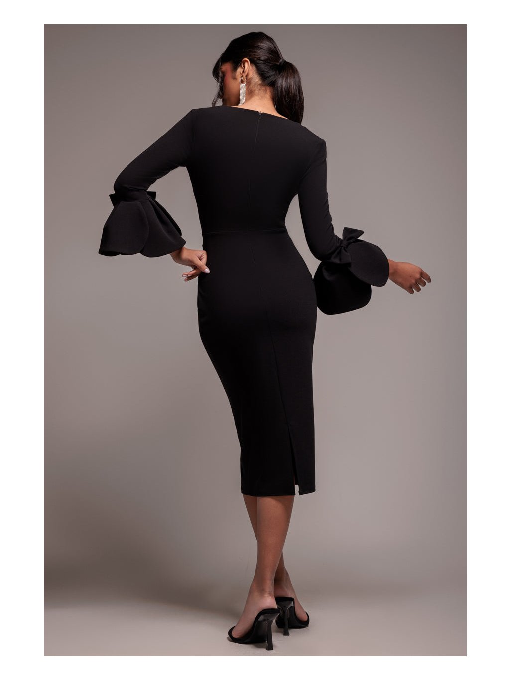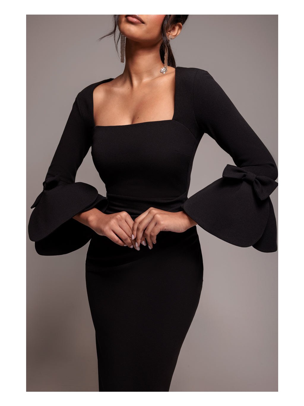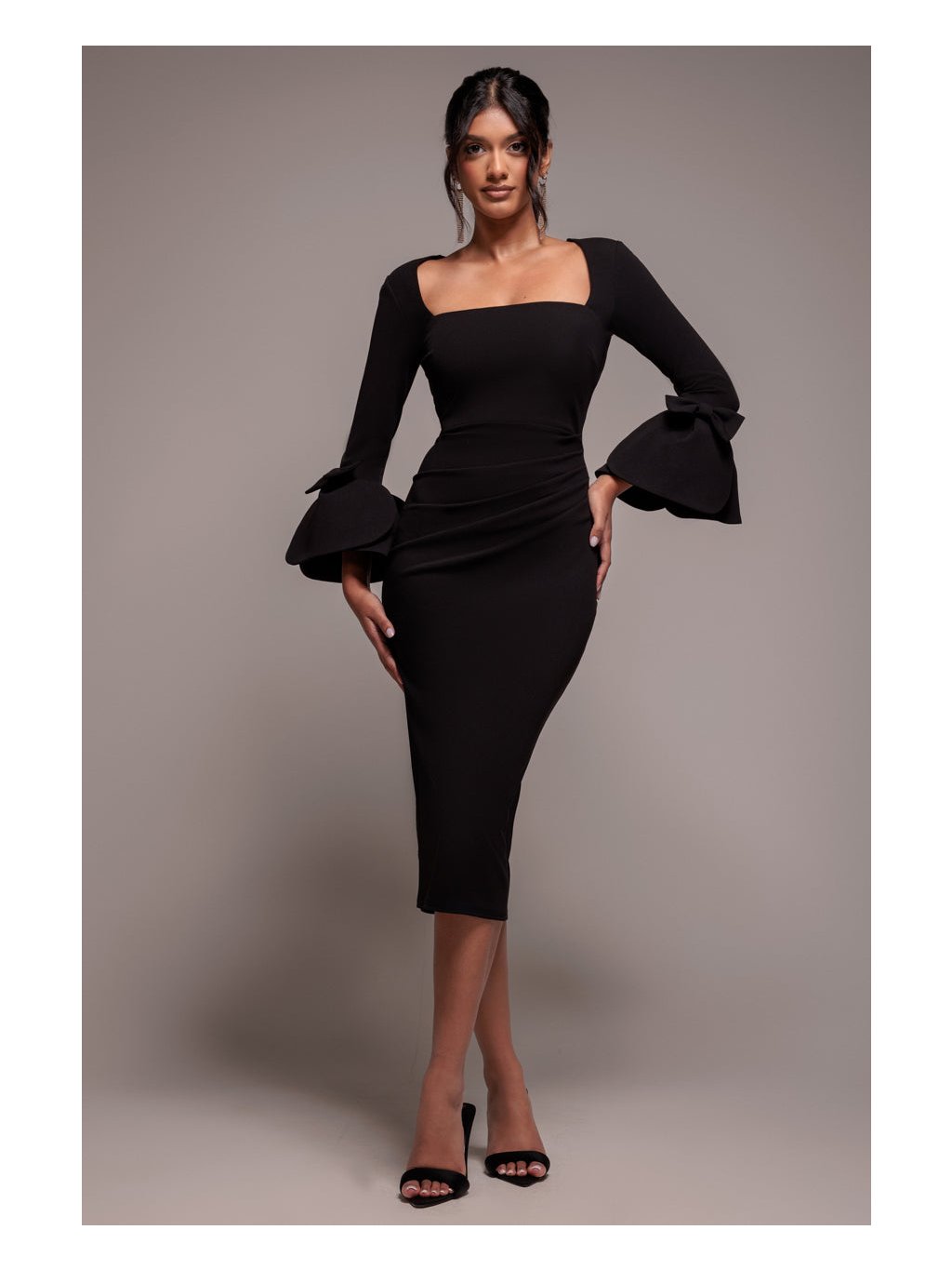 Tyto černé midi šaty jsou dokonalou kombinací elegance a nadčasovosti. Hranatý výstřih působí moderně a lichotí horní části postavy a dlouhé rukávy s výraznými mašlemi okamžitě upoutají pozornost a dodávají šatům výrazný designový detail. Přiléhavý střih se smyslným řasením v oblasti pasu krásně zvýrazňuje křivky a vytváří velmi ženskou siluetu. Zadní rozparek zajišťuje pohodlný krok. Šaty se hodí na slavnostní ceremoniál - například na promoci či imatrikulaci.