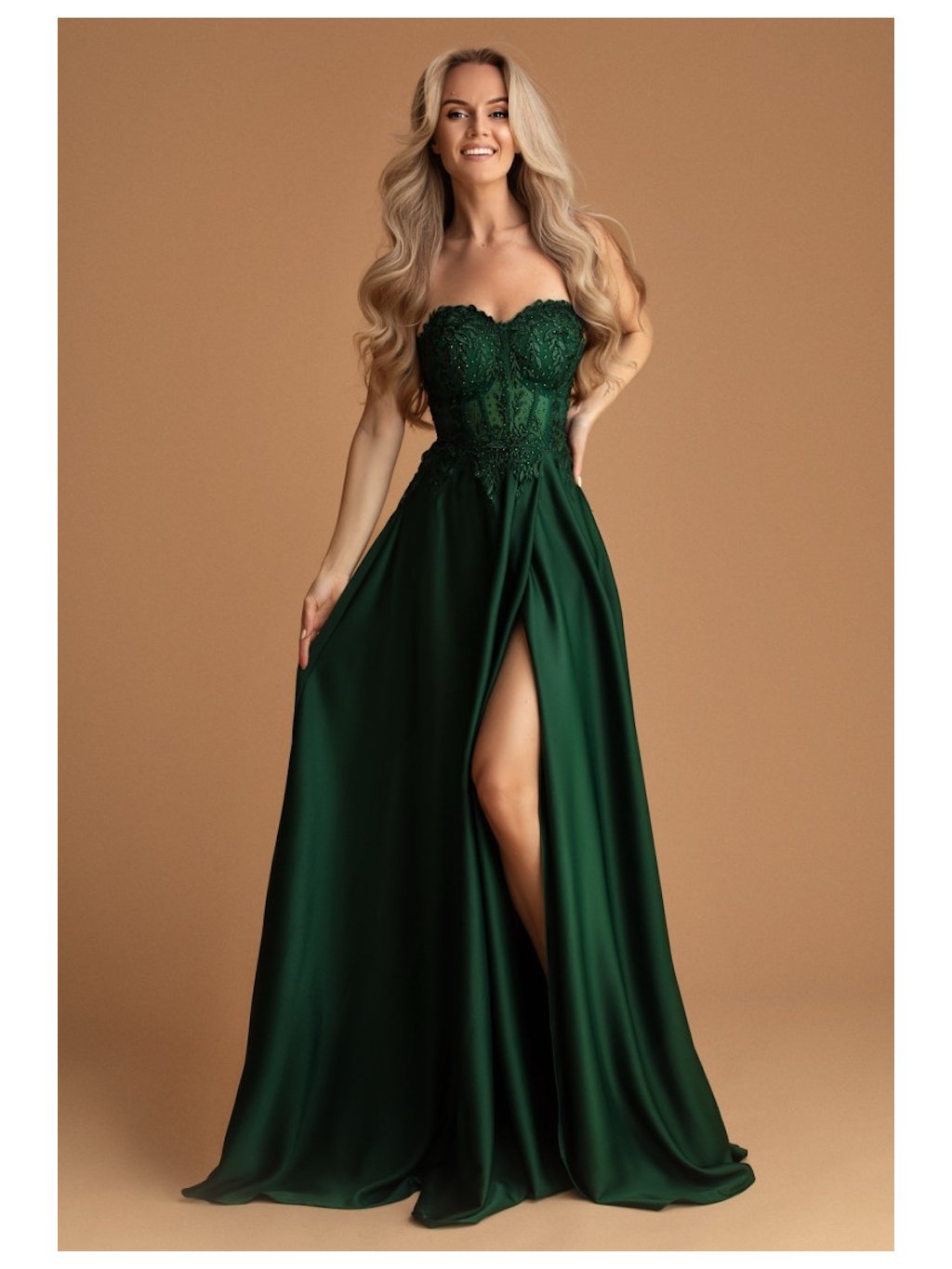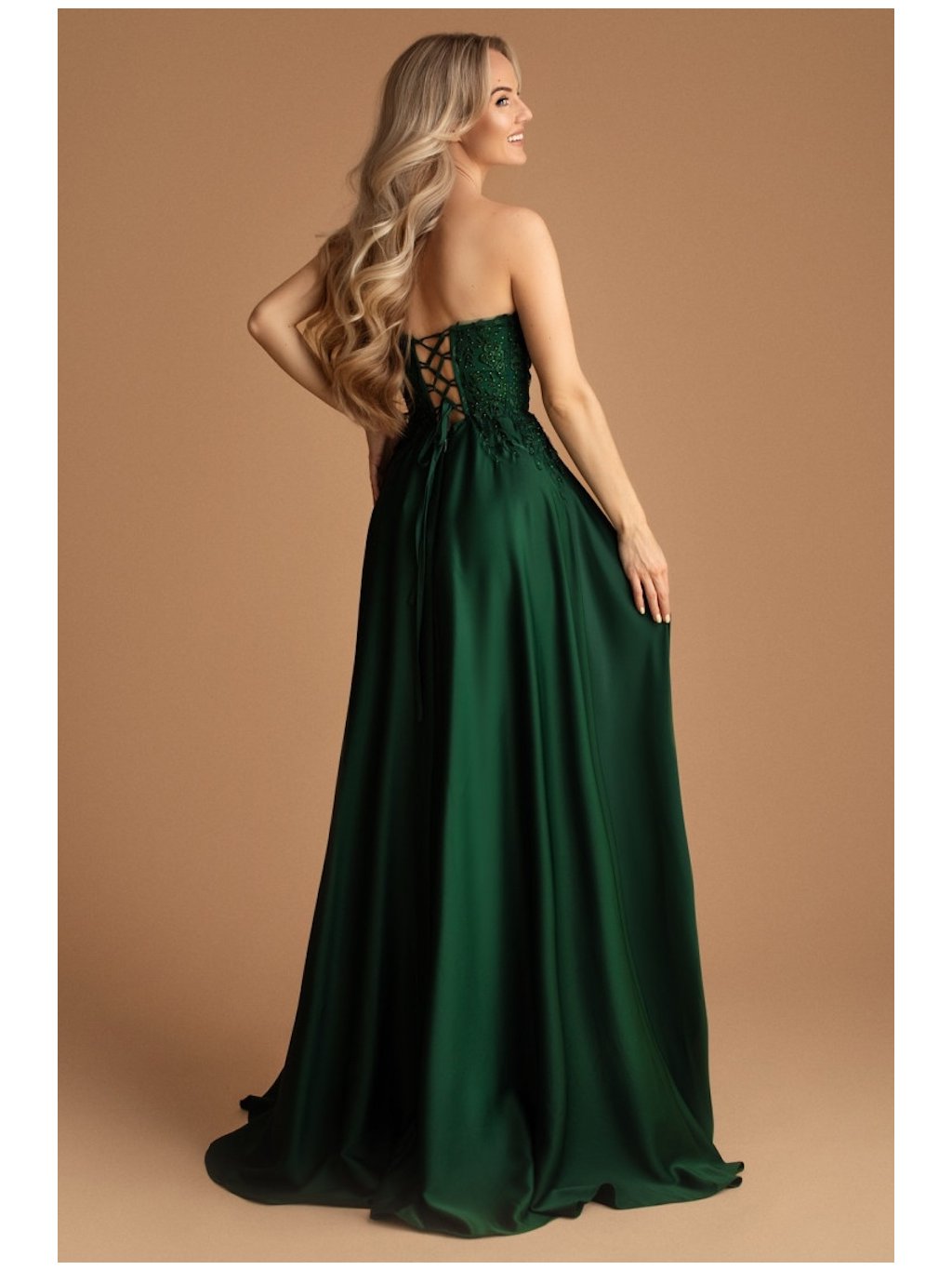 Tyto smaragdové společenské šaty Vás zaujmou dokonalým spojením elegance a ženskosti. Korzetový živůtek je zdobený jemnou krajkou s drobnými korálky, které vytvářejí luxusní dojem. Šněrování na zádech umožňuje perfektně upravit obvod podle postavy, takže šaty krásně sedí a zvýrazní Vaši siluetu. Splývavá sukně s decentním rozparkem působí lehce a přirozeně při chůzi. Tento model je ideální volbou na maturitní ples, do divadla, na galavečer či vánoční večírek.