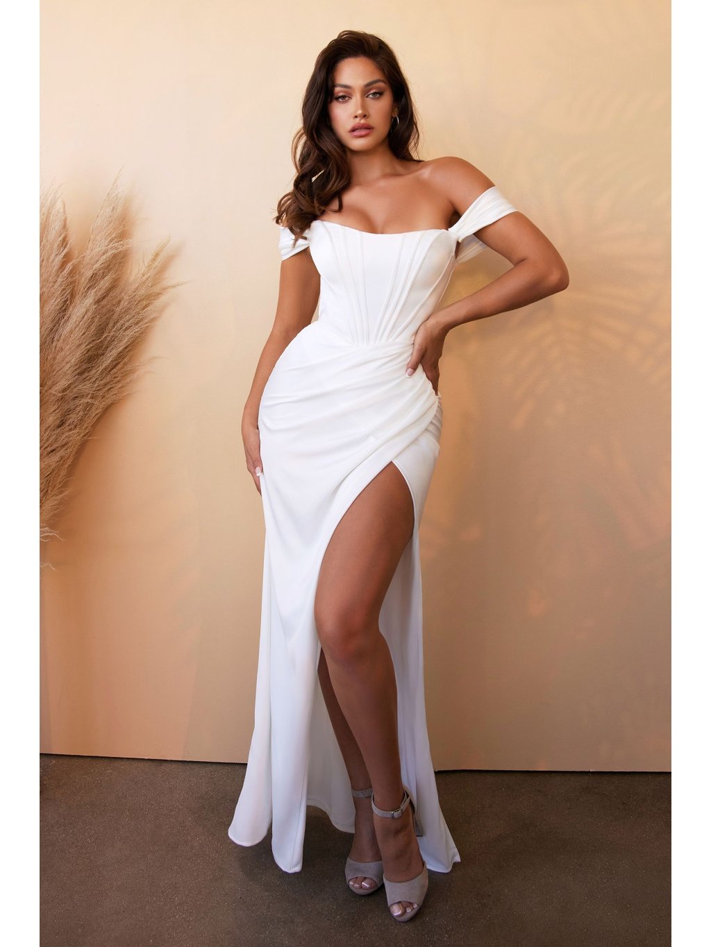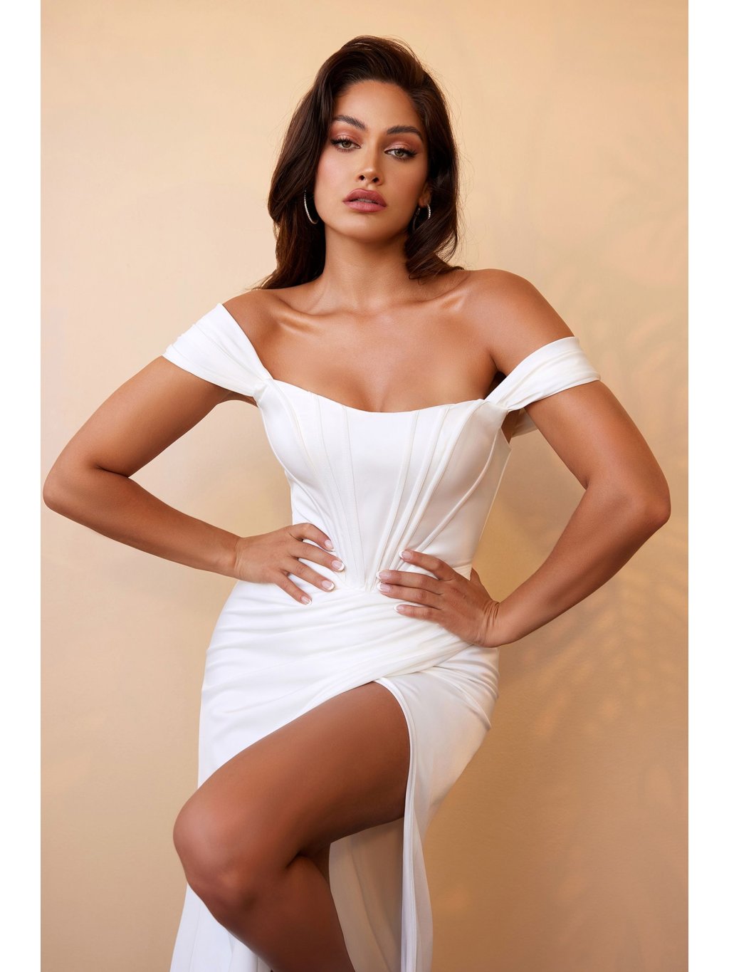 Tyto bílé šaty jsou přesnou definicí ženské síly a elegance. Ramínka volně spuštěná přes ramena vytvářejí jemně romantický dojem, přičemž korzetový živůtek s tvarujícími švy krásně modeluje postavu. Asymetrické řasení v oblasti boků společně s výrazným rozparkem opticky prodlužuje nohy a dodává celému outfitu moderní šmrnc.