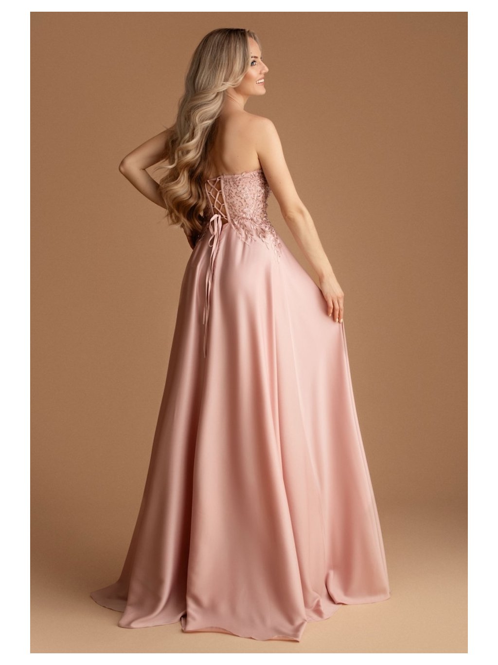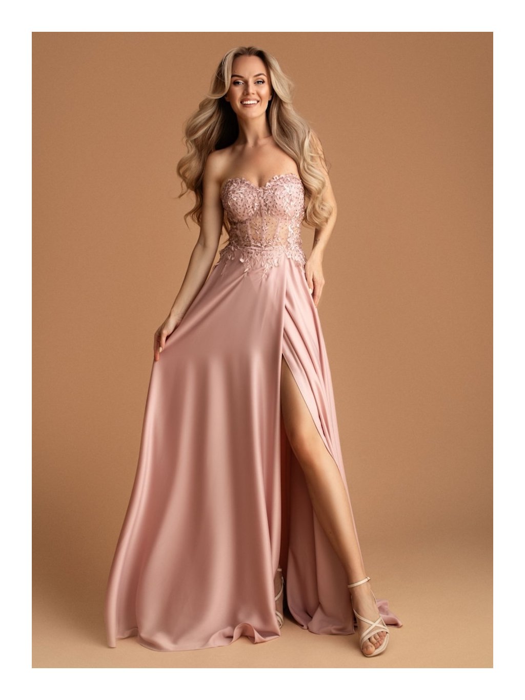Tyto společenské šaty korzetového střihu s rozparkem jsou ideální volbou, pokud dáváte přednost jednoduchosti před bohatými sukněmi. Tyto elegantní šaty zaujmou svým elegantním střihem, živůtkem jemně lemovaným korálky a decentním skrytým rozparkem. Perfektní volba pro plesy, galavečery nebo jiné slavnostní události, kde chcete zazářit.