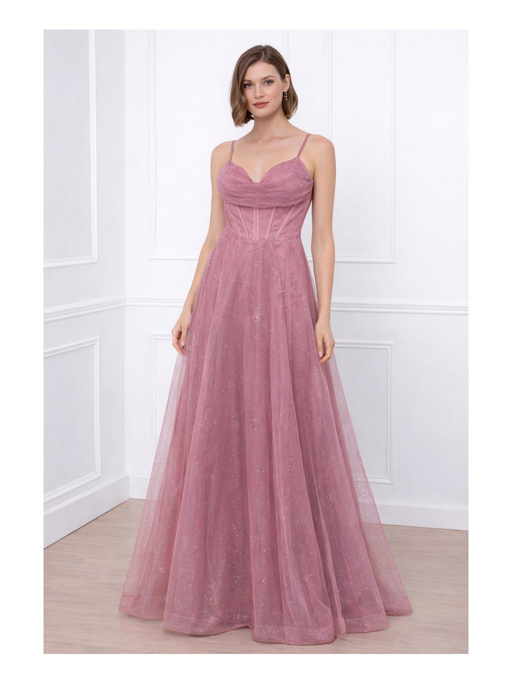 Tyto romantické pudrově růžové šaty mají korzetový živůtek s kosticemi, které krásně tvarují postavu a poskytují oporu. Dlouhá tylová sukně s decentním třpytem se při chůzi elegantně vlní a vytváří pohádkový efekt. Zadní šněrování umožňuje dokonalé přizpůsobení siluetě a zároveň působí velmi elegantně. Šaty jsou ideální volbou na plesy, svatby, slavnostní večery nebo romantické společenské události.