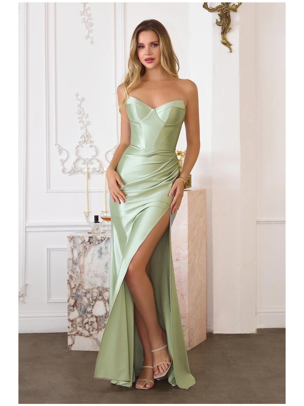 Design tohoto modelu sází na propracovanou konstrukci horního dílu. Korzet není pouze funkčním prvkem, ale díky viditelnému prošívání a špičatému zakončení v pase tvoří hlavní estetický detail šatů. Srdcový výstřih s vyztuženými košíčky zajistí perfektní dekolt i bez podprsenky, zatímco absence ramínek nechává prostor pro vyniknutí šíje a ramen. Pohled zezadu odhaluje tradiční šněrovačku, která je nejen krásným vizuálním prvkem, ale především praktickým nástrojem pro stažení šatů přesně na míru vaší postavě.