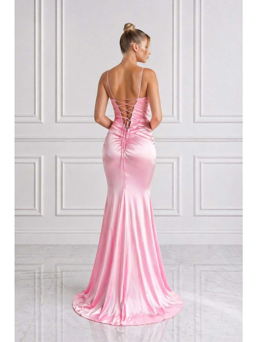 Tyto saténové šaty v něžném baby pink odstínu jsou dokonalou harmonií mezi hravostí a neodolatelnou ženskostí. Pružný satén s vysokým leskem obepíná postavu, zatímco bohaté řasení po stranách boků a v pase vytváří lichotivou texturu. Střih se směrem ke kolenům mírně zužuje a následně přechází v elegantní sukni, která při chůzi vytváří krásný vlnitý pohyb. Zajímavým detailem je řešení zadní části, kde se nachází variabilní šněrování. V šatech zazáříte jako družička na svatbě nebo na letní zahradní slavnosti v glamour stylu.
