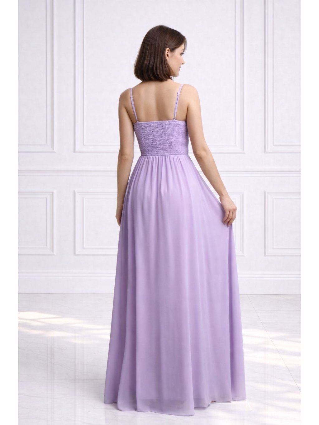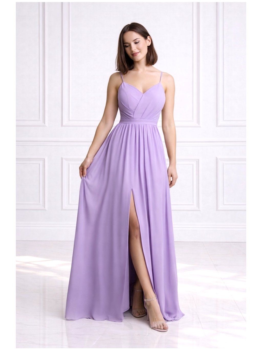 Tyto šaty působí velmi jemně a romanticky. Levandulový odstín je svěží, ženský a na světle má krásný měkký tón. Horní část je řešená s jemným řasením, které vytváří hezký tvar dekoltu a zároveň přirozeně zvýrazní pas. Tenká ramínka dodávají modelu lehkost a nechávají vyniknout ramena i linii krku. Zadní pružná část navíc zajistí, že šaty dobře sedí a jsou velmi pohodlné i při delším nošení. Dlouhá splývavá sukně se při chůzi krásně pohybuje a rozparek dodává celému modelu lehkou dávku elegance a ženskosti. Jsou to šaty, které se hodí na svatby, letní slavnosti nebo večerní události, kdy chcete působit něžně, ale zároveň nepřehlédnutelně.
