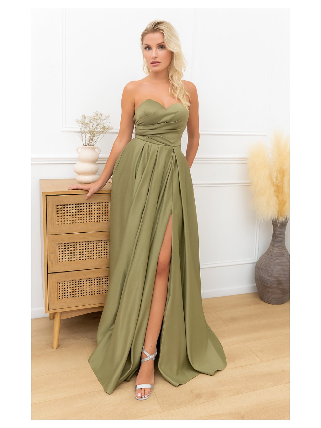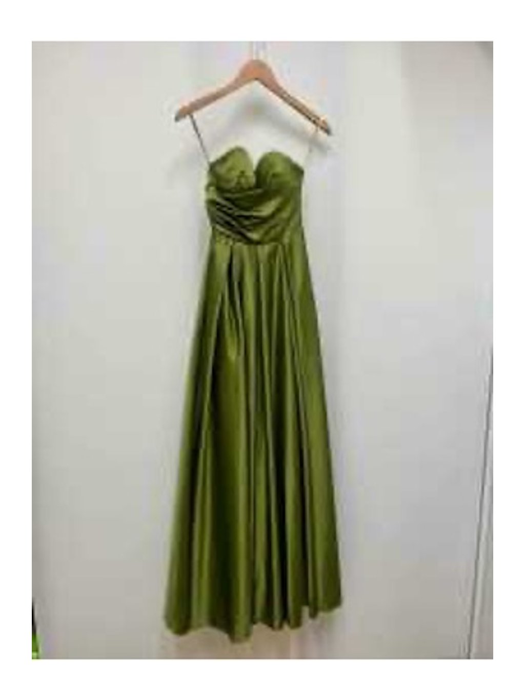Dlouhé saténové šaty v zelené barvě vynikají neobvyklým odstínem a elegantním střihem. Horní část má korzetovou konstrukci se srdíčkovým výstřihem a decentním řasením, které tvaruje dekolt. Sukně do A plynule navazuje na živůtek a při chůzi elegantně splývá. Zapínání na zádech je řešené šněrováním a v sukni skrytým zipem, takže šaty působí čistě a uhlazeně. Tento model je ideální volba na širokou škálu společenských akcí - hodí se na maturitní ples i jako šaty pro družičku.