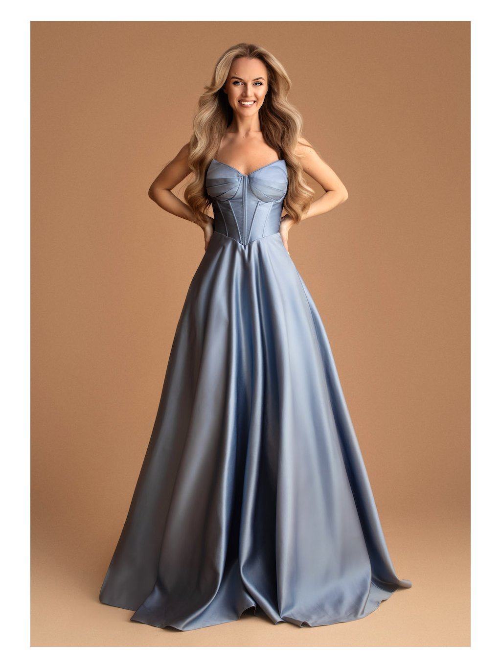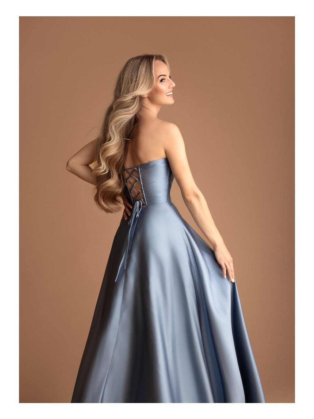 Tyto společenské šaty v odstínu světlé modři působí velmi noblesně a přitom svěže. Horní část zdobí živůtek s jemným srdcovým výstřihem, který podtrhne dekolt a dodá modelu ženský nádech. Díky šněrování v zadní části lze šaty snadno přizpůsobit postavě a vytvořit dokonale padnoucí siluetu. Dlouhá áčková sukně se při pohybu elegantně rozvíjí a vytváří plynulou linii. Jsou ideální volbou pro ples, svatební hostinu, galavečer i další slavnostní příležitosti.