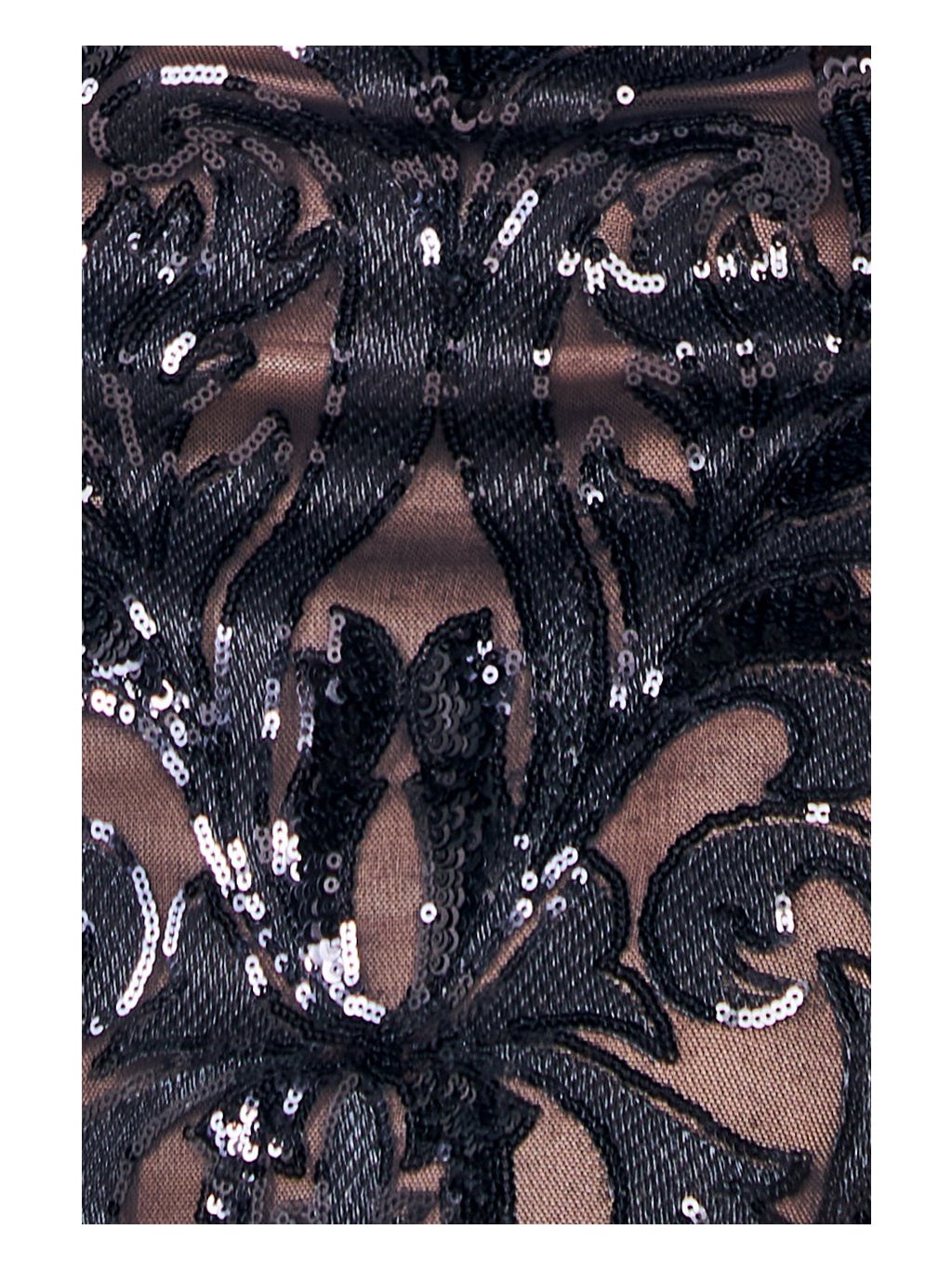 Tyto výrazné černé midi šaty přinášejí kombinaci elegance a odvážného vzhledu, která je jako stvořená pro večerní události. Bohatá flitrová výšivka vytváří poutavý vzor, který okamžitě přitáhne pozornost a dodá modelu působivý efekt pod každým světlem. Čtvercový výstřih spolu s jemně nabíranými 3/4 rukávy vytváří ženskou siluetu a přiléhavý střih krásně zdůrazní křivky. Průsvitná krajka je doplněna příjemnou podšívkou, takže šaty působí luxusně, ale zároveň jsou pohodlné na celovečerní nošení. Skvělá volba na plesy a novoroční večírky.