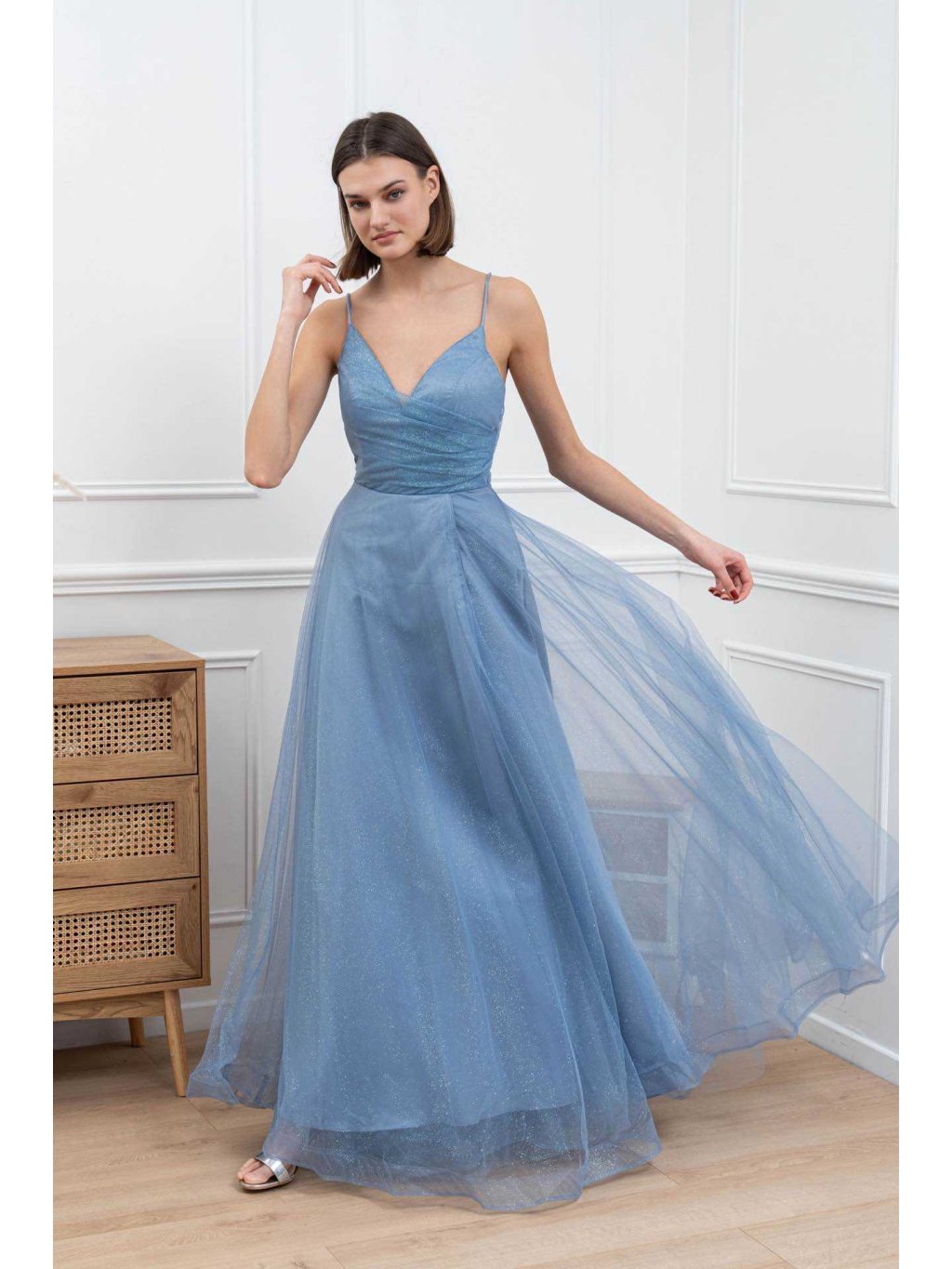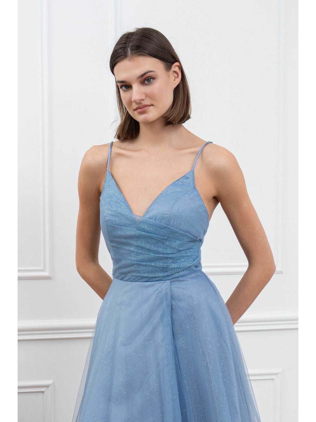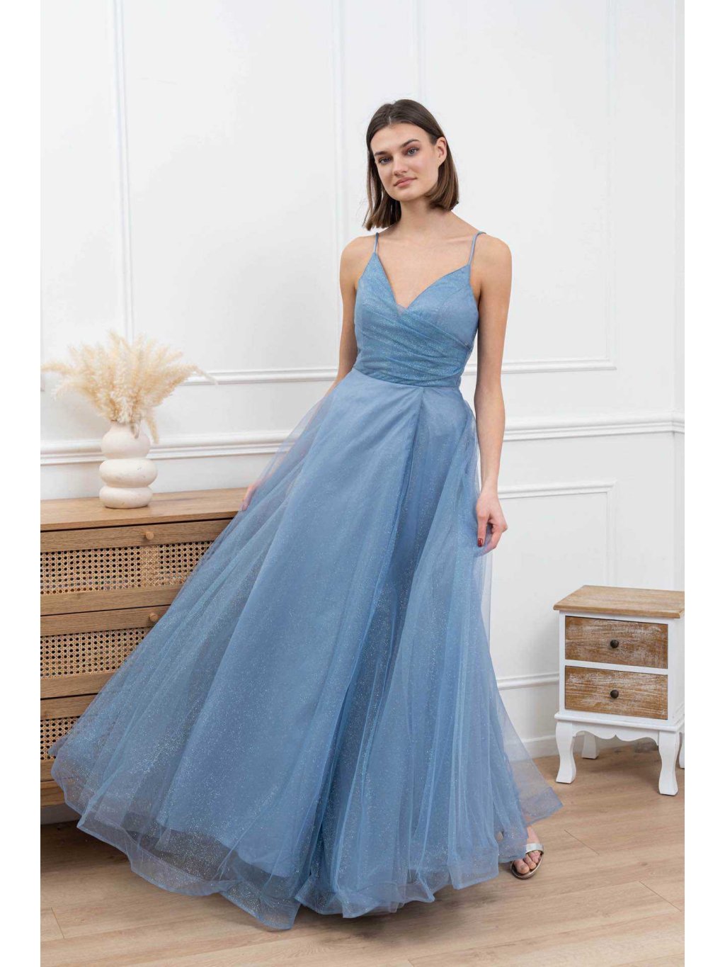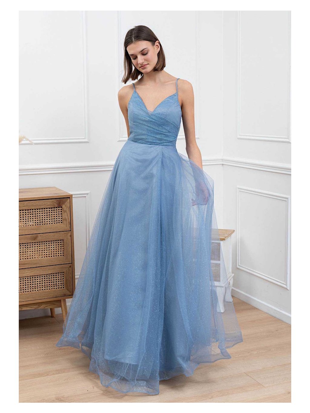 Jemně třpytivé modré šaty působí jako stvořené pro večerní akce, kde se cení elegance a lehkost, ať už se jedná o plesové večery nebo svatební oslavy. Splývavý tyl vytváří při chůzi vzdušný efekt, přičemž výstřih do V opticky prodlužuje postavu. Křížená ramínka na zádech spolu se šněrováním dodávají šatům jemný detail a perfektní padnutí.