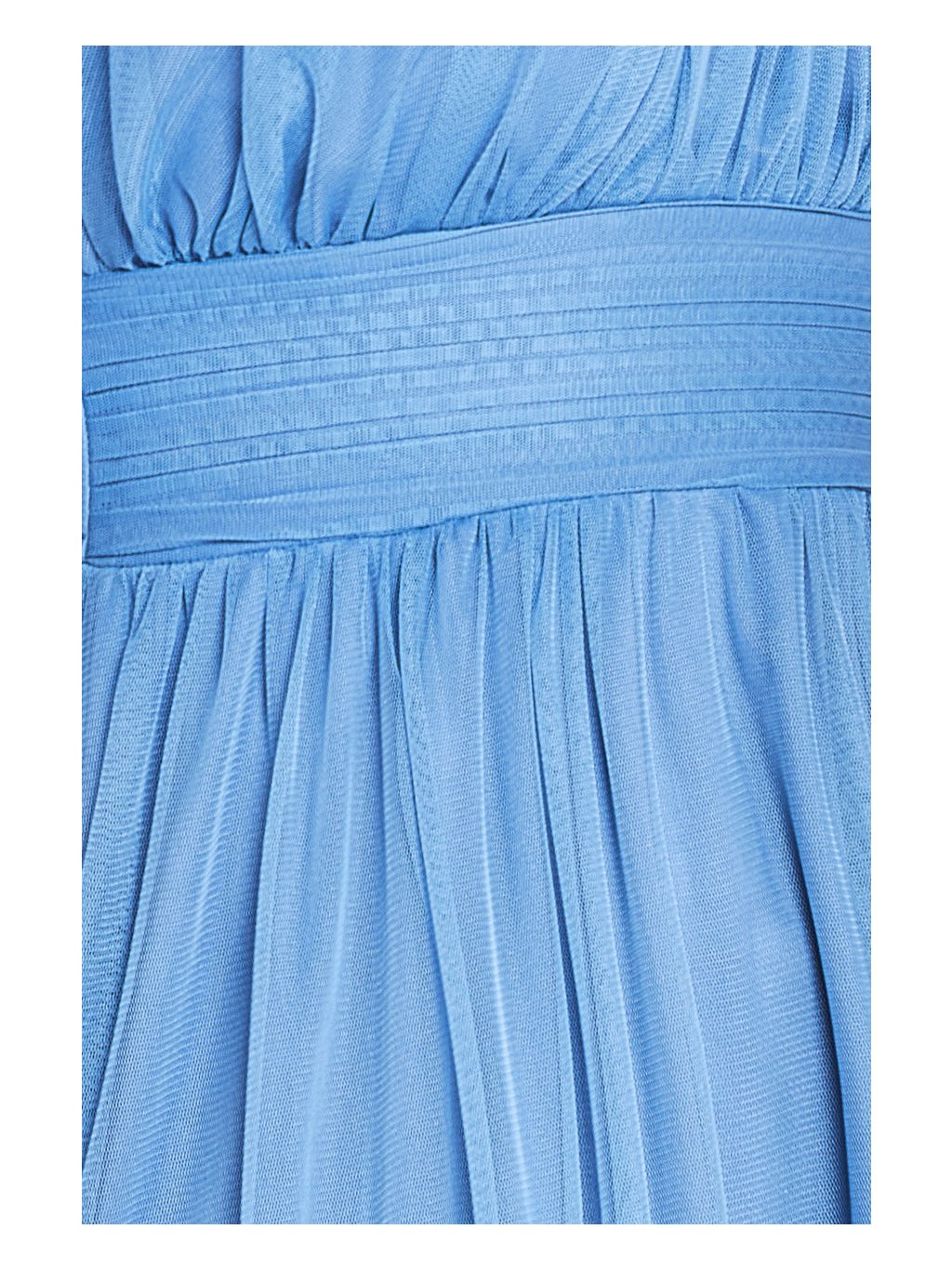 Světle modré dlouhé šaty působí velmi romanticky. Jemná tylová vrstva vytváří vzdušný efekt. Střih ke krku s jemným řasením vytváří zajímavou strukturu živůtku a přirozeně přechází do zvýšeného pasu, který model krásně tvaruje. Odtud se šaty rozšiřují do dlouhé splývavé sukně. Rozparek v sukni dodává modelu lehkost a zároveň umožňuje pohodlný pohyb. Díky světle modré barvě působí šaty svěže a jemně, což z nich dělá velmi oblíbenou volbu pro slavnostní příležitosti, především svatby.