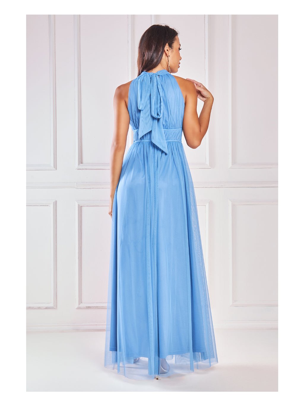 Modré dlouhé šaty z tylu se zavazováním za krkem