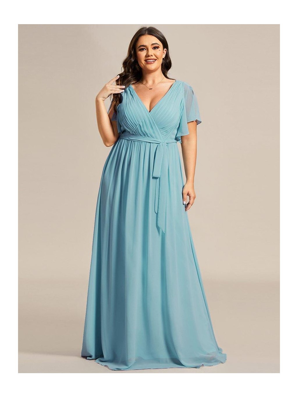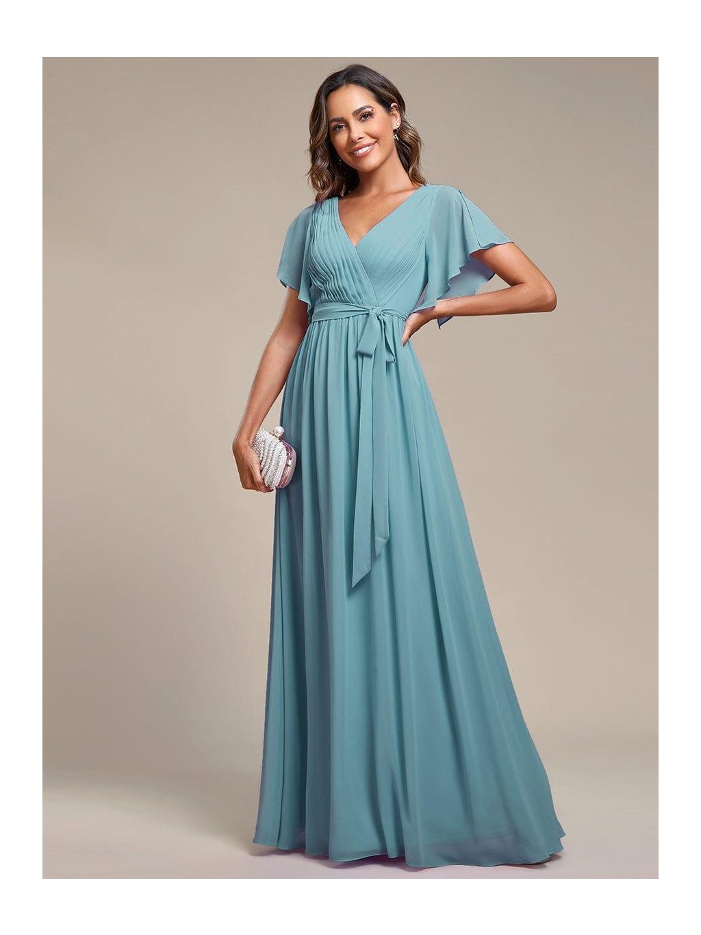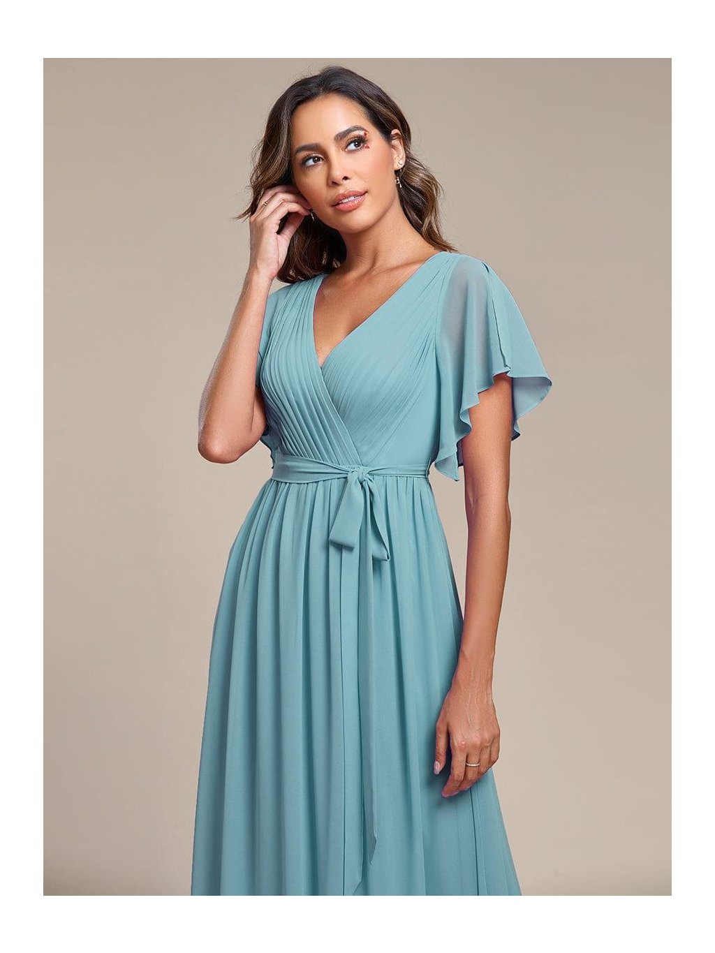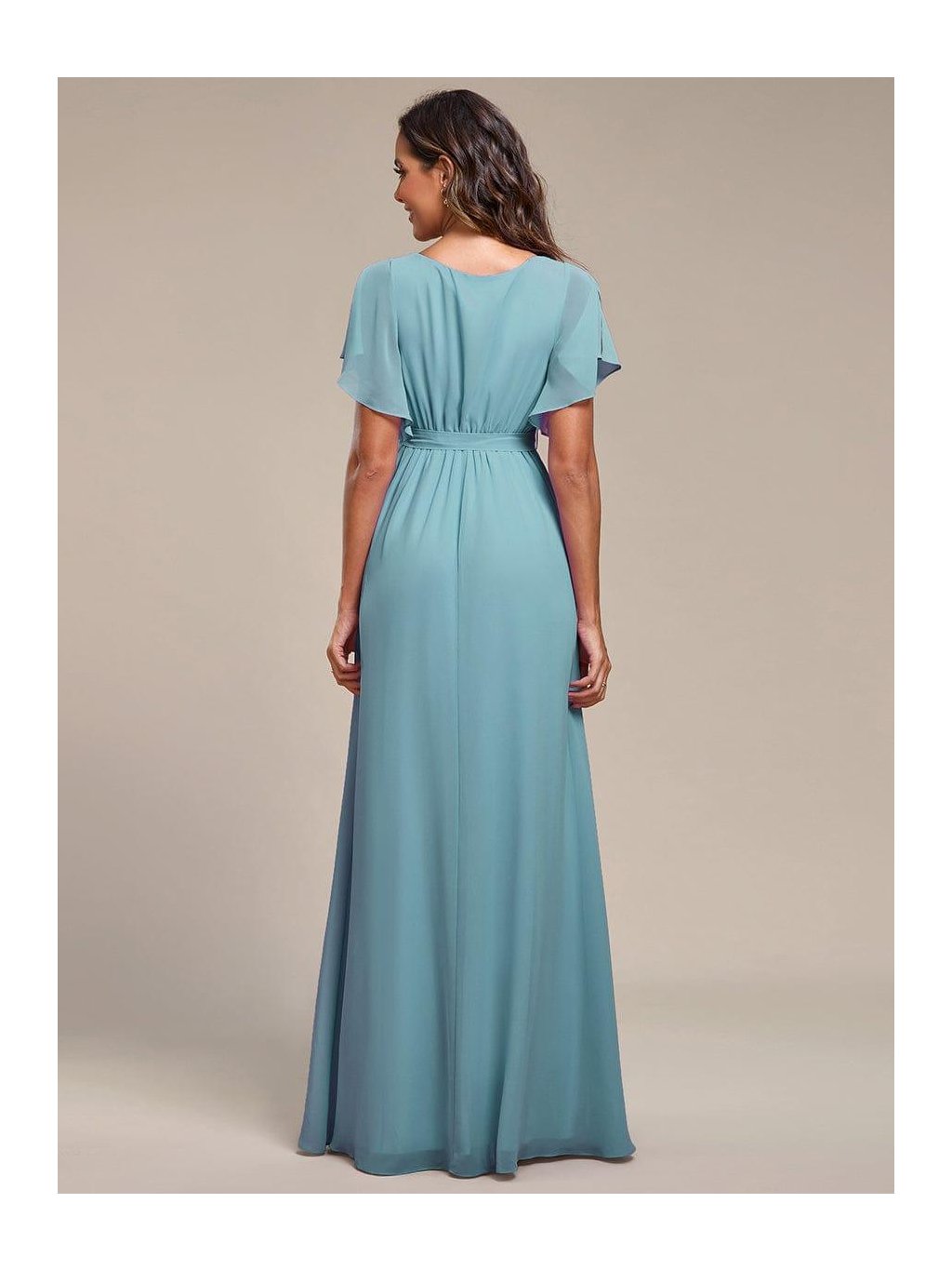 Barva mořské hladiny v podvečerním světle – jemná, klidná a přesto nepřehlédnutelná. Tyto dlouhé šaty v tlumeném modrozeleném tónu působí svěže a velmi žensky. Překládaný výstřih do V s jemným řasením lichotí dekoltu, měkký pás na zavazování zvýrazní siluetu a umožní přizpůsobit šaty přesně podle Vaší postavy. Splývavá sukně se při chůzi lehce pohybuje a vytváří elegantní linii. Vzdušné krátké rukávy dodávají modelu lehkost a komfort, takže jsou ideální volbou na svatbu, ples, slavnostní večeři i roli družičky.