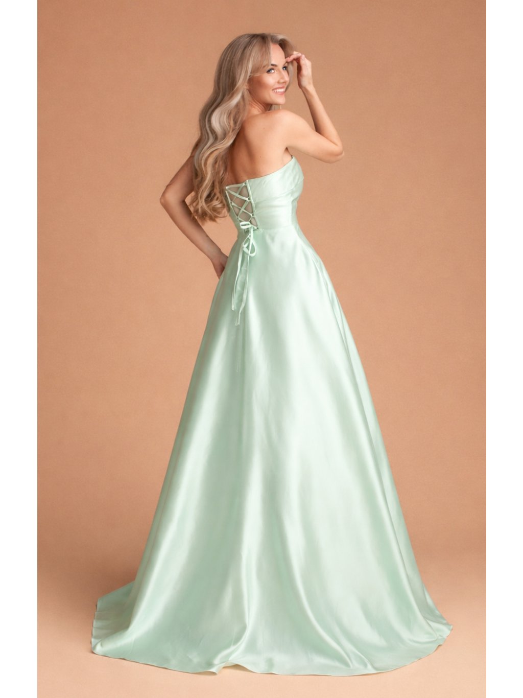 Tyto šaty ve světle mátovém odstínu působí svěže, moderně a přitom velmi elegantně. Korzetově řešený živůtek s jemným přehybem v horní linii krásně zvýrazňuje oblast dekoltu. Hladký lesklý materiál odráží světlo s jemným leskem a dodává modelu luxusní charakter bez zbytečných ozdob.Dominantním prvkem jsou otevřená záda se šněrováním, které nejen přitahuje pozornost, ale zároveň umožňuje přizpůsobení střihu podle potřeby. Ideální volba na plesy, galavečery i jiné výjimečné příležitosti, kde vynikne nadčasová elegance a moderní ženskost.